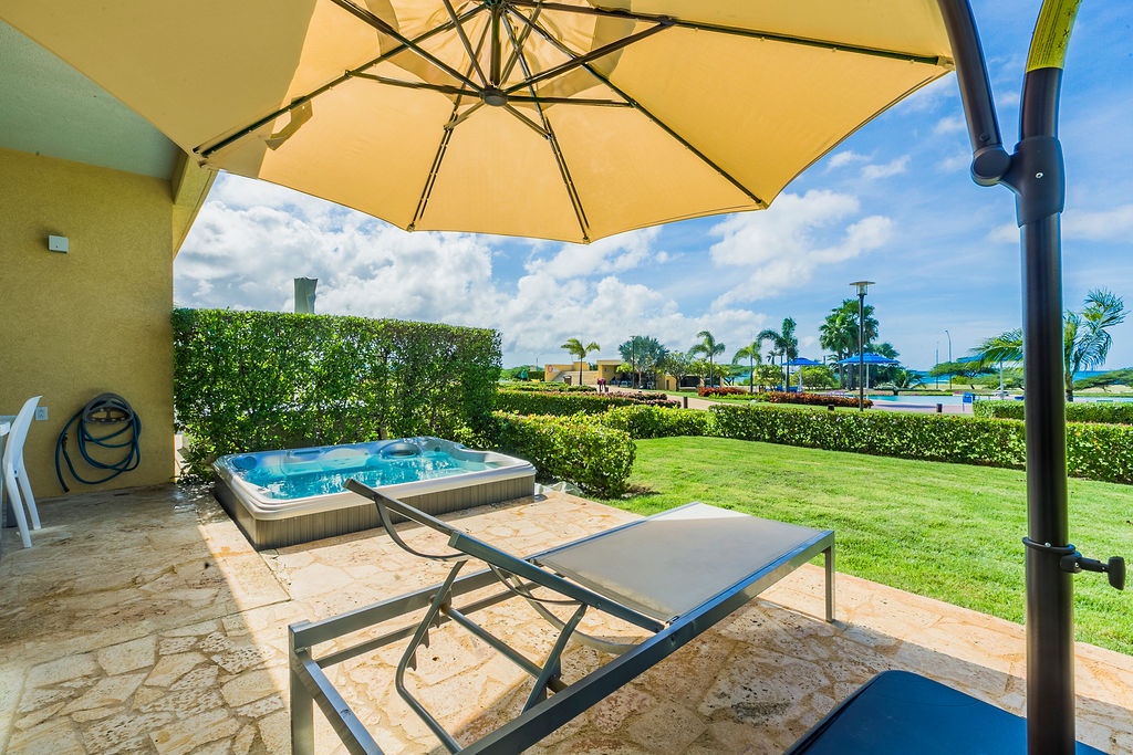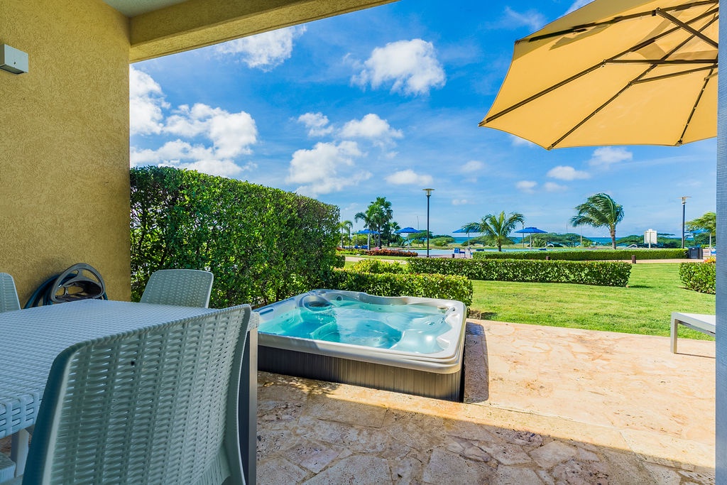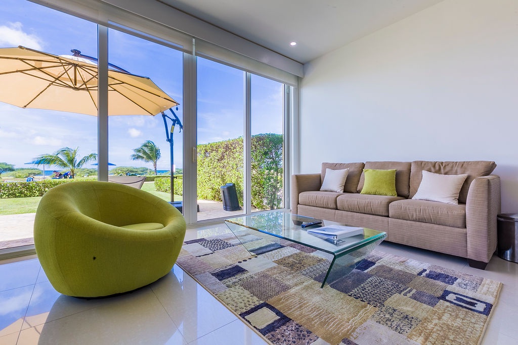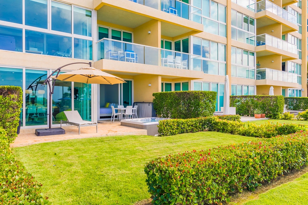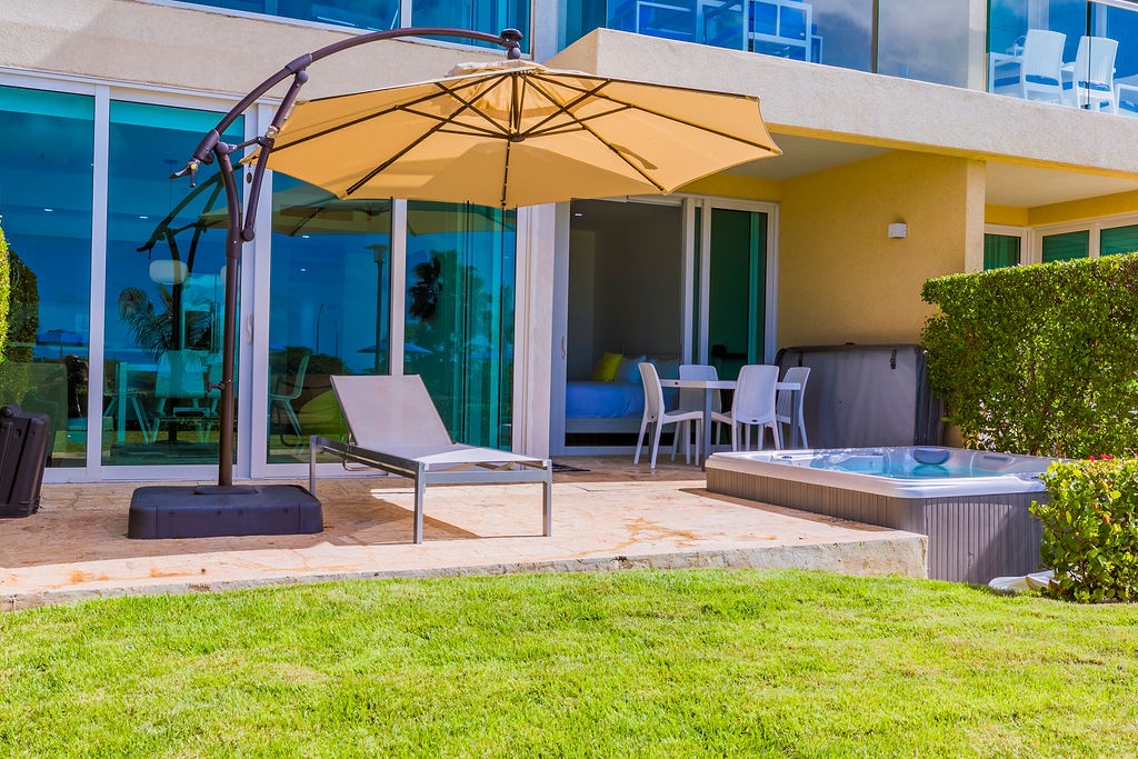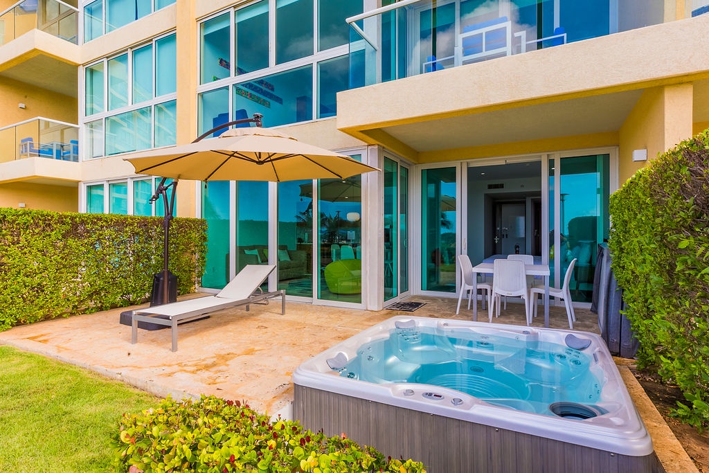 This unique treasure is designed with a stylish fully equipped kitchen area, cozy living/dining space with colorful cushions and green tub chair. The master bedroom features a king size bed, a full bathroom and a gorgeous view. The second bedroom has two double beds and a full bathroom. This unit has direct access to the pools, gardens and common areas, no elevator needed, and still has the amazing ocean view. Yes, you’ll have your own private patio and Jacuzzi for you to enjoy during your stay.