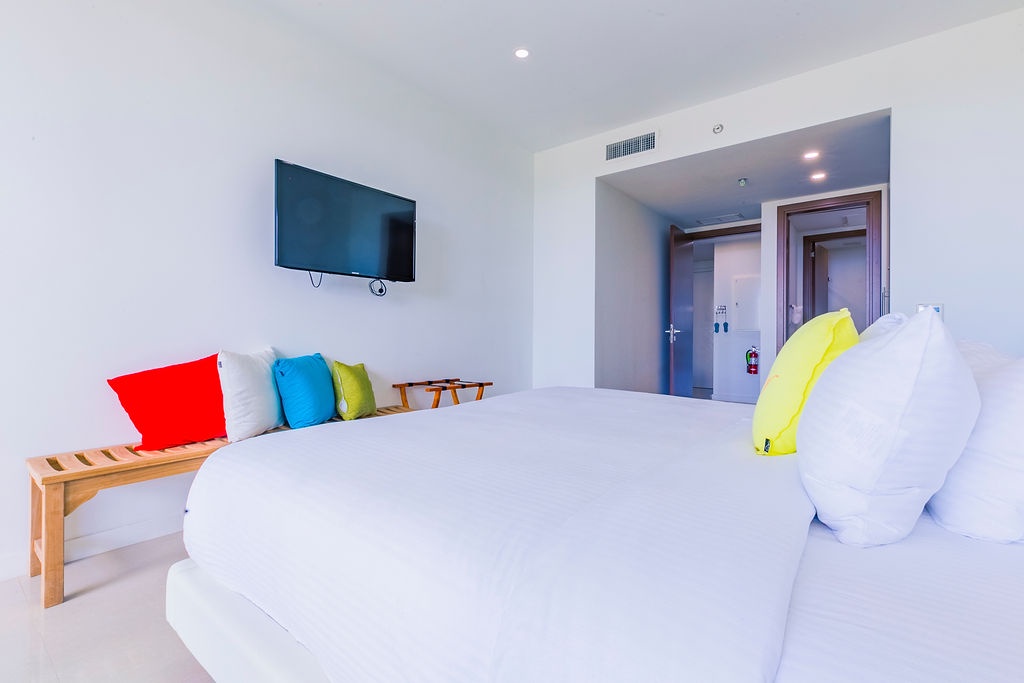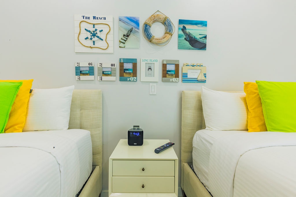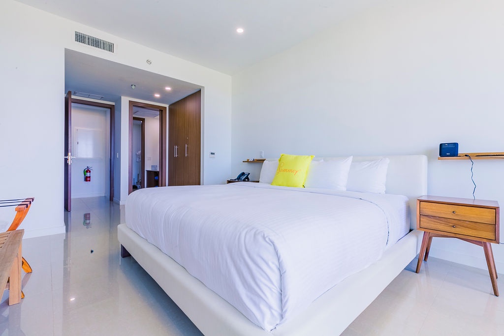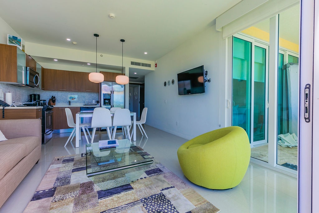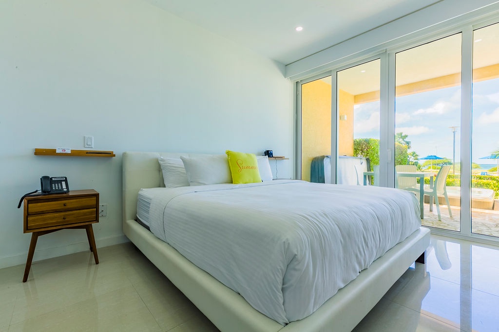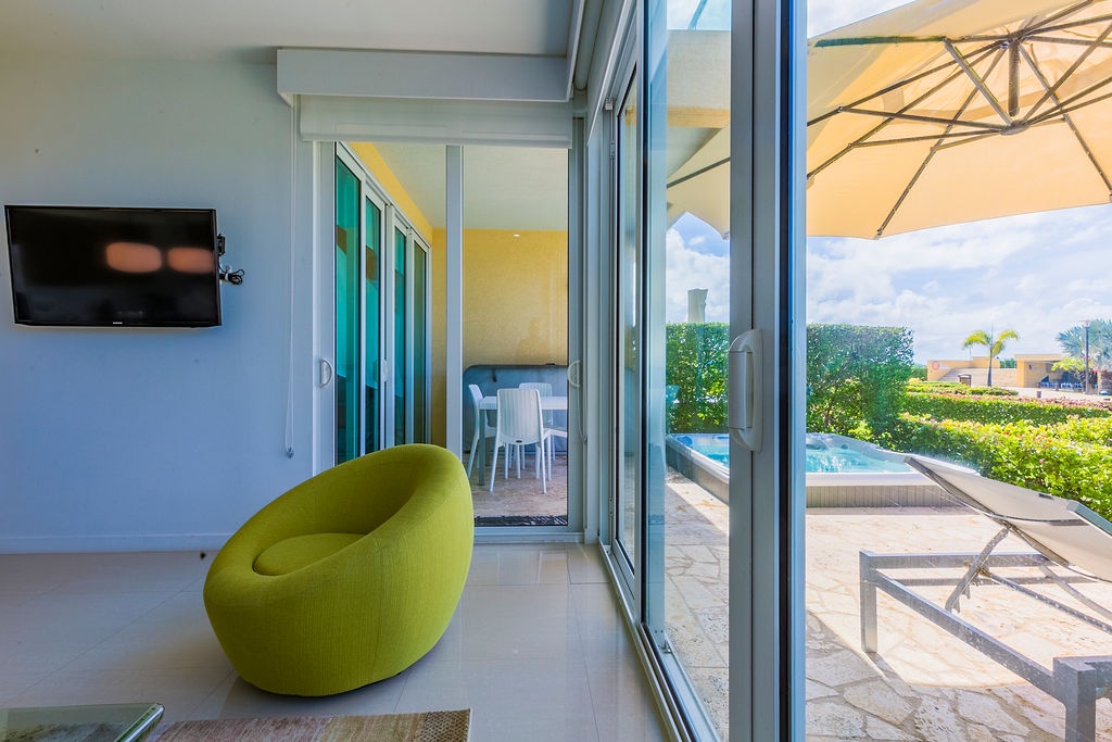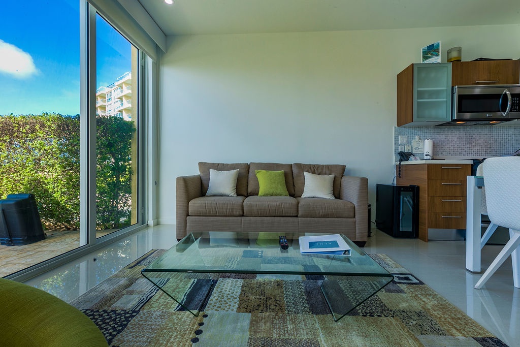 This unique treasure is designed with a stylish fully equipped kitchen area, cozy living/dining space with colorful cushions and green tub chair. The master bedroom features a king size bed, a full bathroom and a gorgeous view. The second bedroom has two double beds and a full bathroom. This unit has direct access to the pools, gardens and common areas, no elevator needed, and still has the amazing ocean view. Yes, you’ll have your own private patio and Jacuzzi for you to enjoy during your stay.