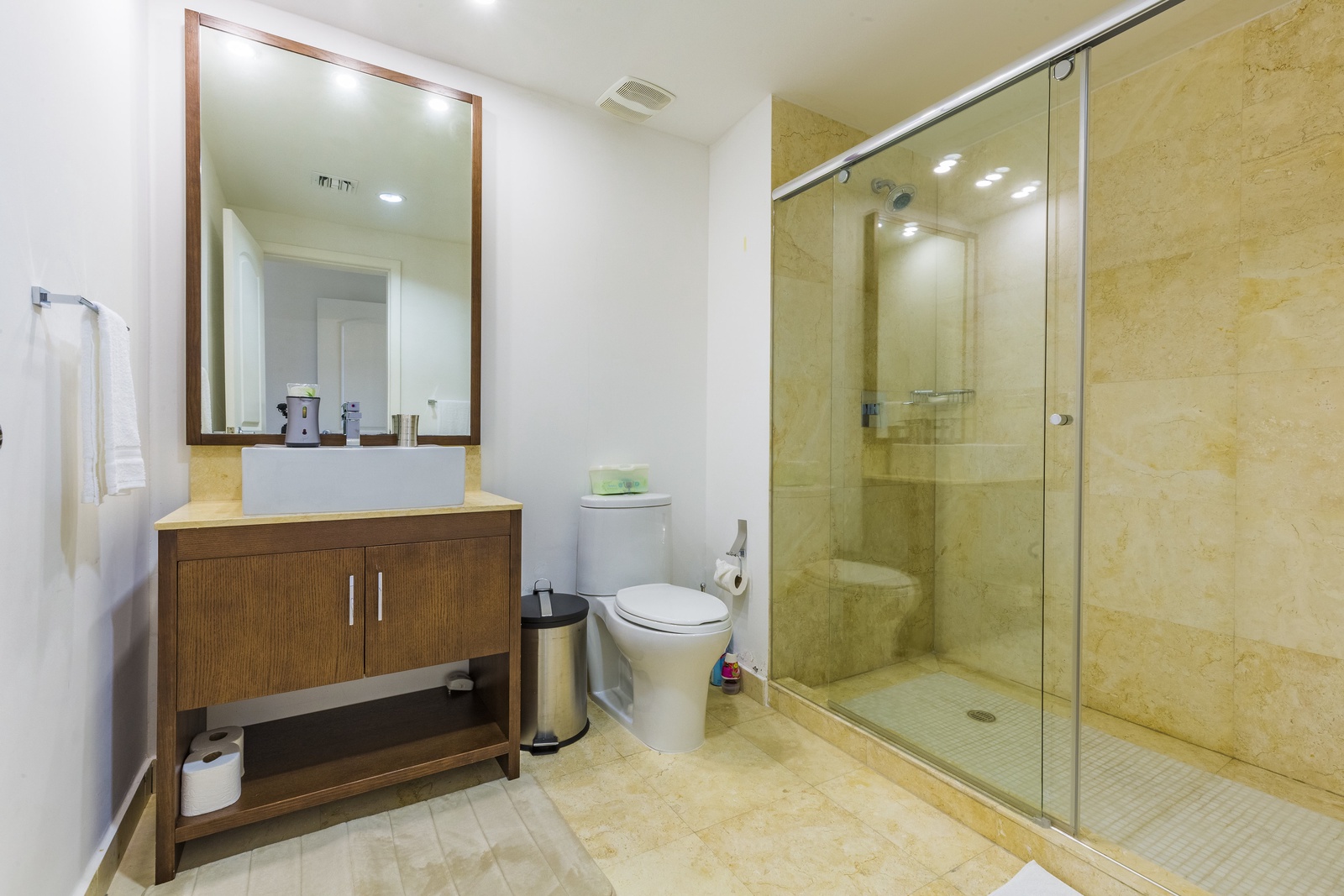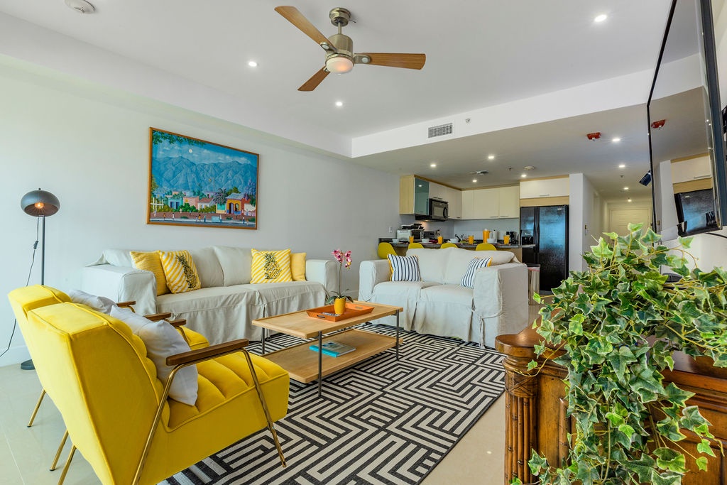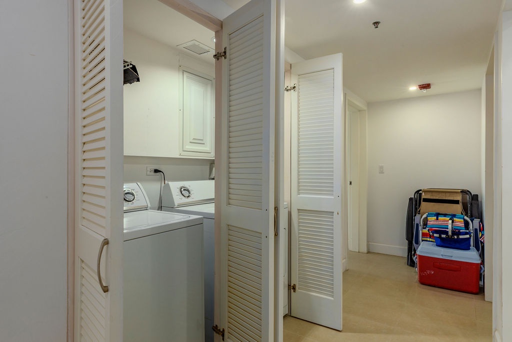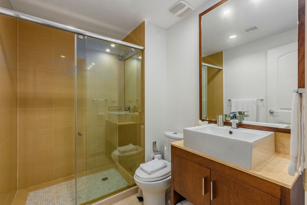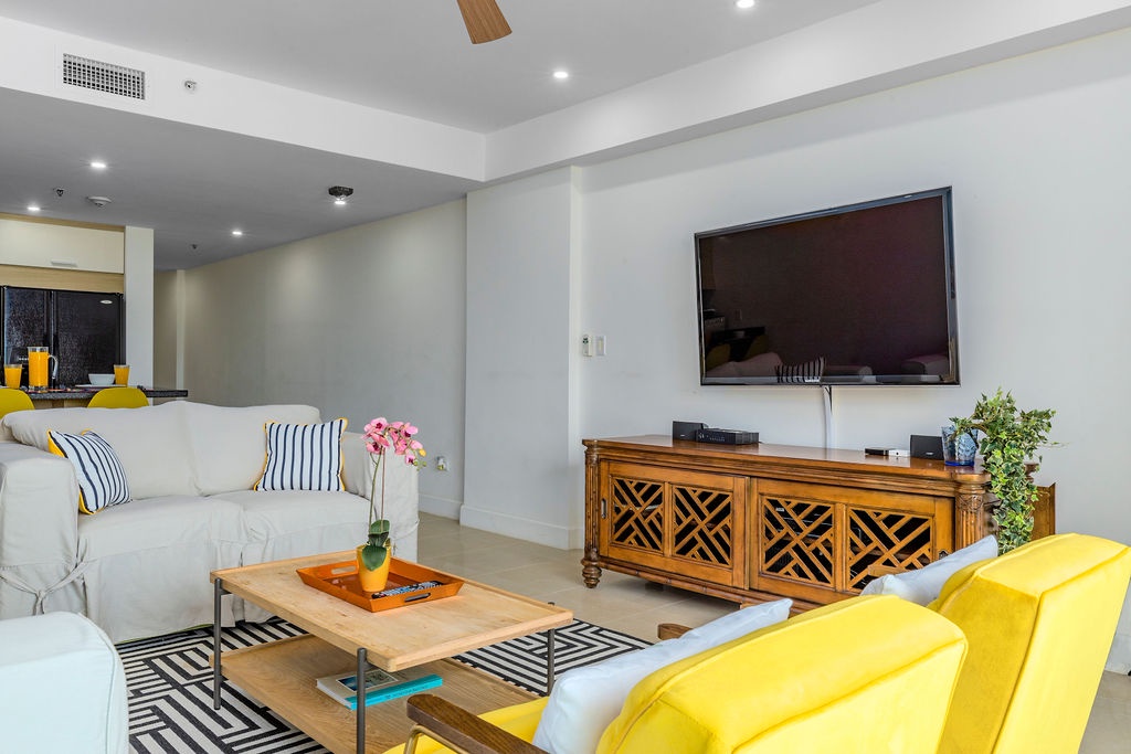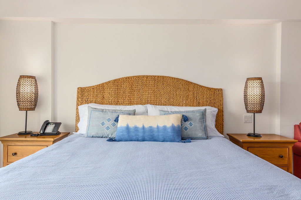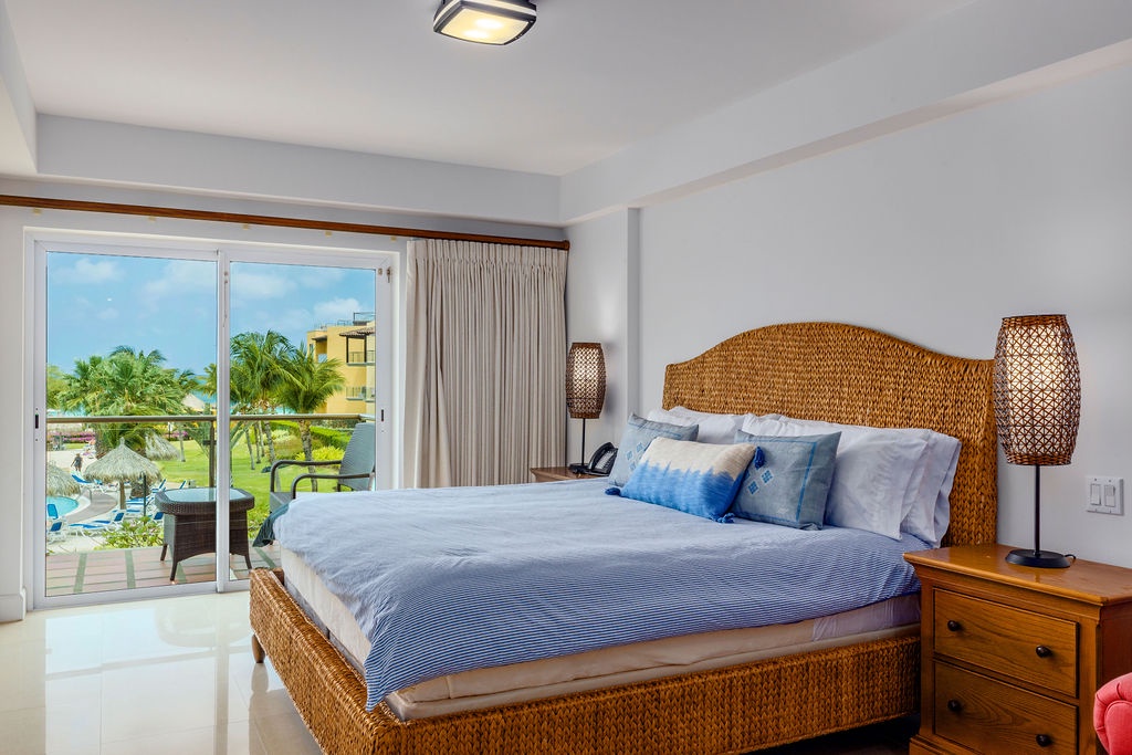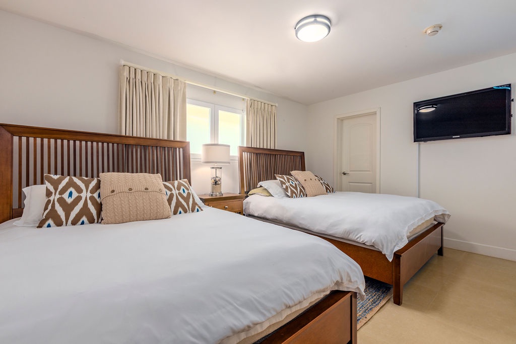 Inside, the master bedroom features a luxurious king-size bed, a cozy reading chair, a flat-screen TV, and an en-suite bathroom. The second bedroom, decorated in soothing beach tones, offers two full beds and an adjacent bathroom that doubles as a guest bath when entertaining.