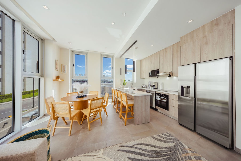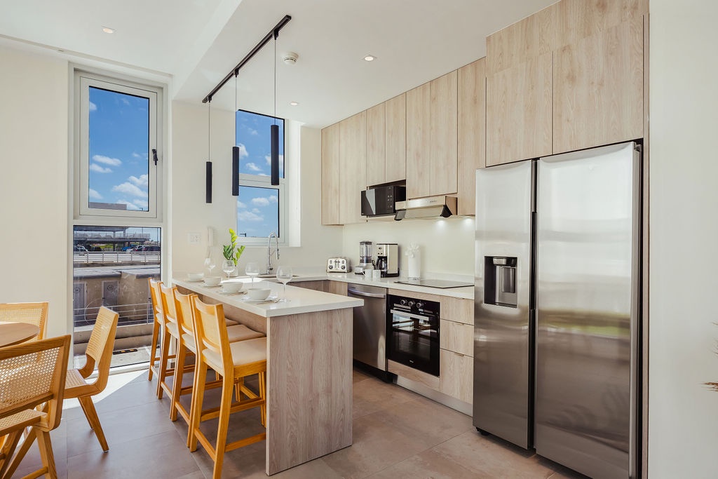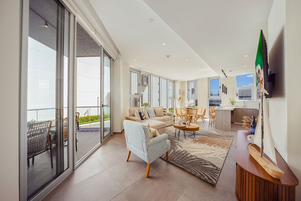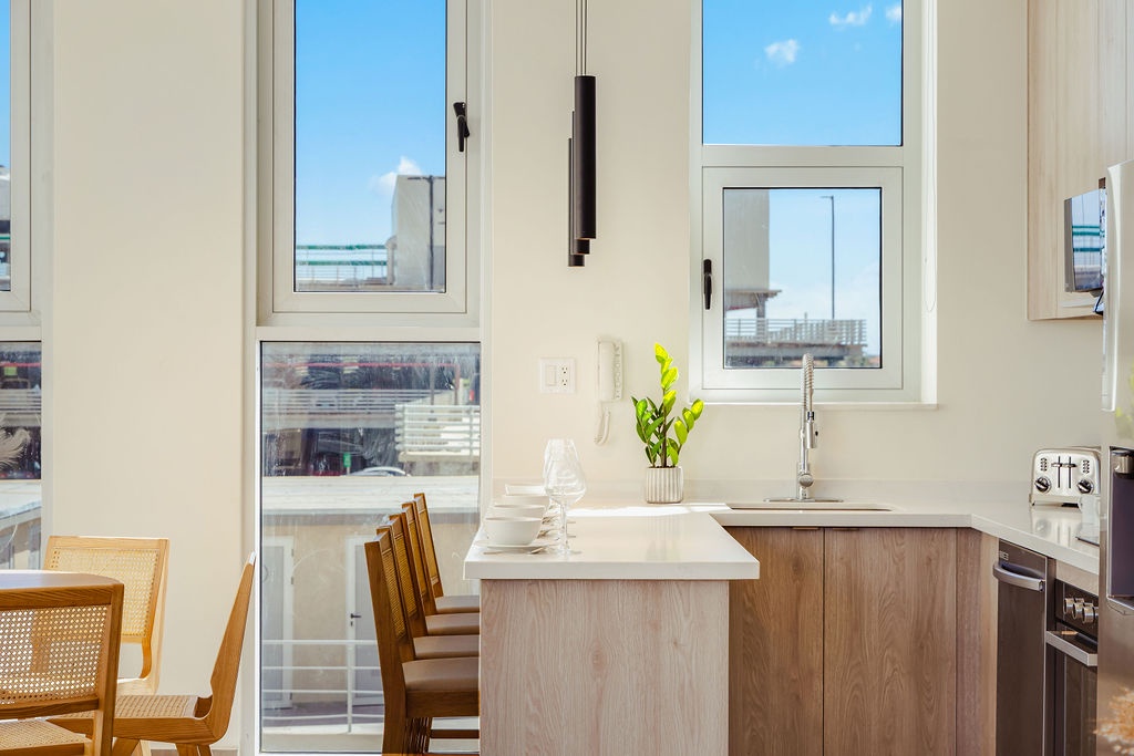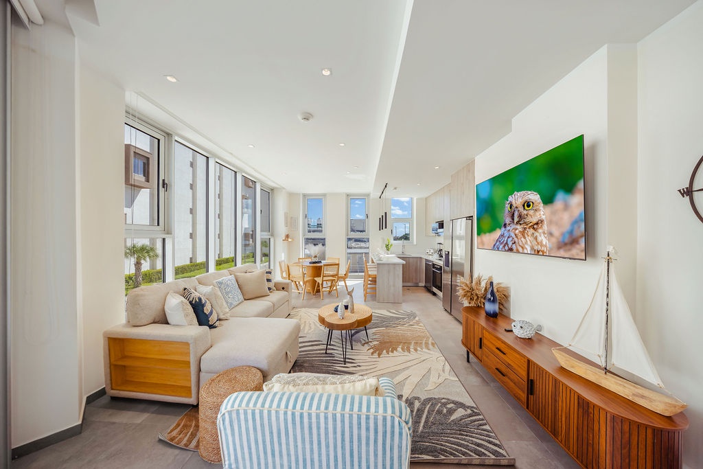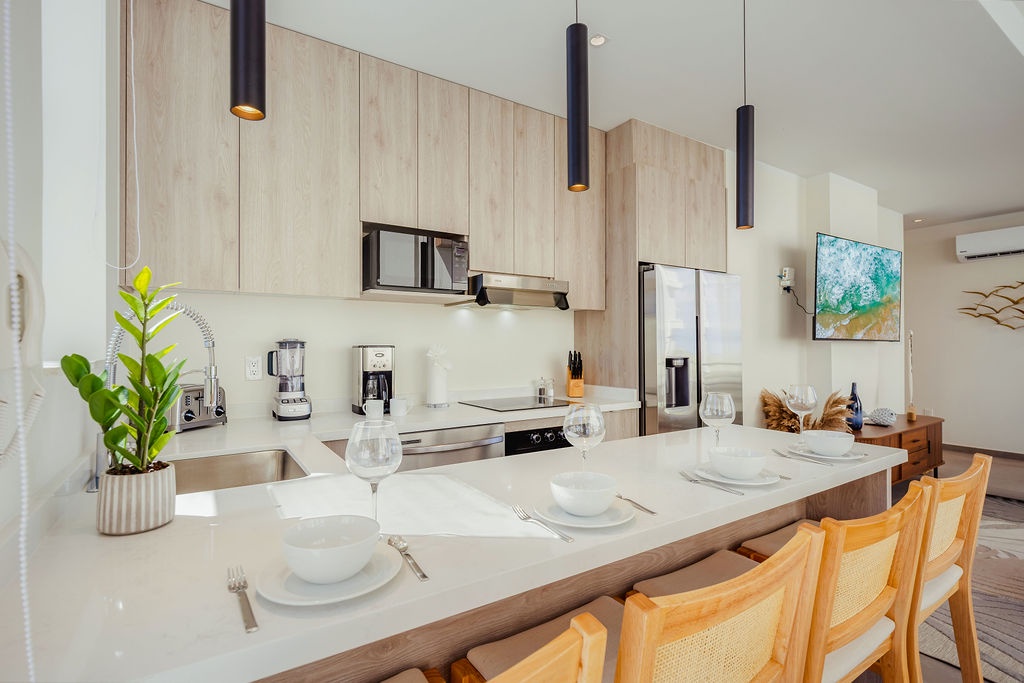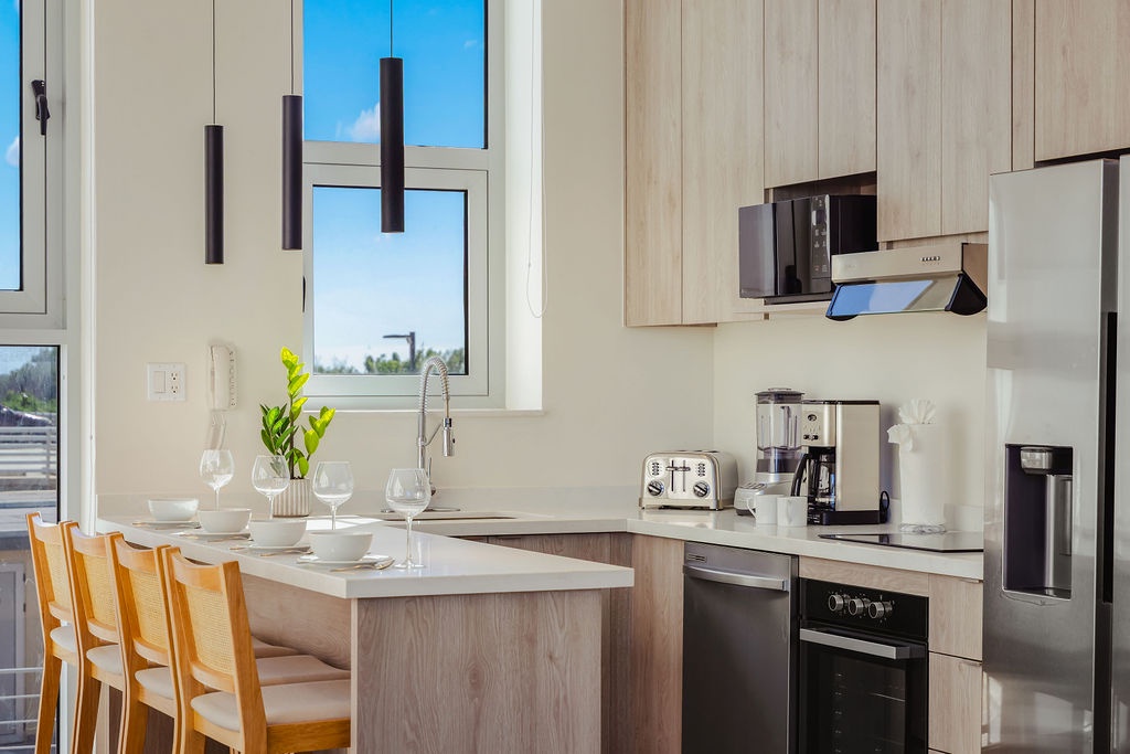 The open concept kitchen is fully equipped with modern appliances, including a refrigerator, microwave, oven, and coffee maker, making it easy to prepare meals during your stay. Whether you are enjoying a quiet breakfast or dining in after a day at the beach, the kitchen comes stocked with all the essentials, including cookware, dishes, and utensils.