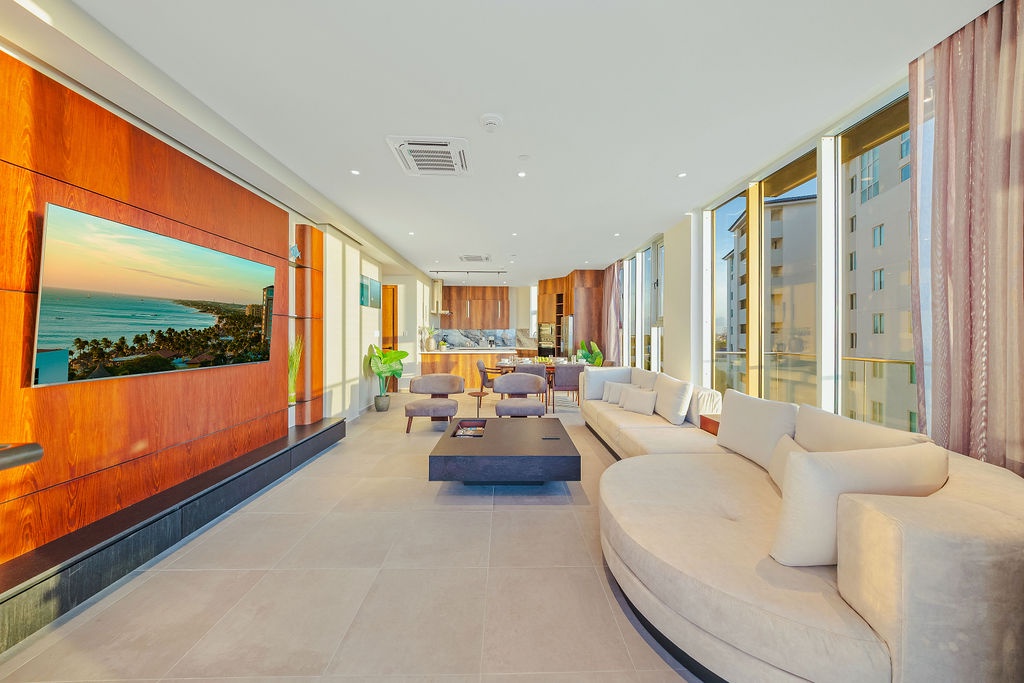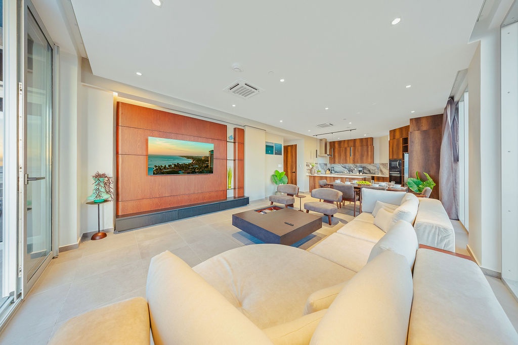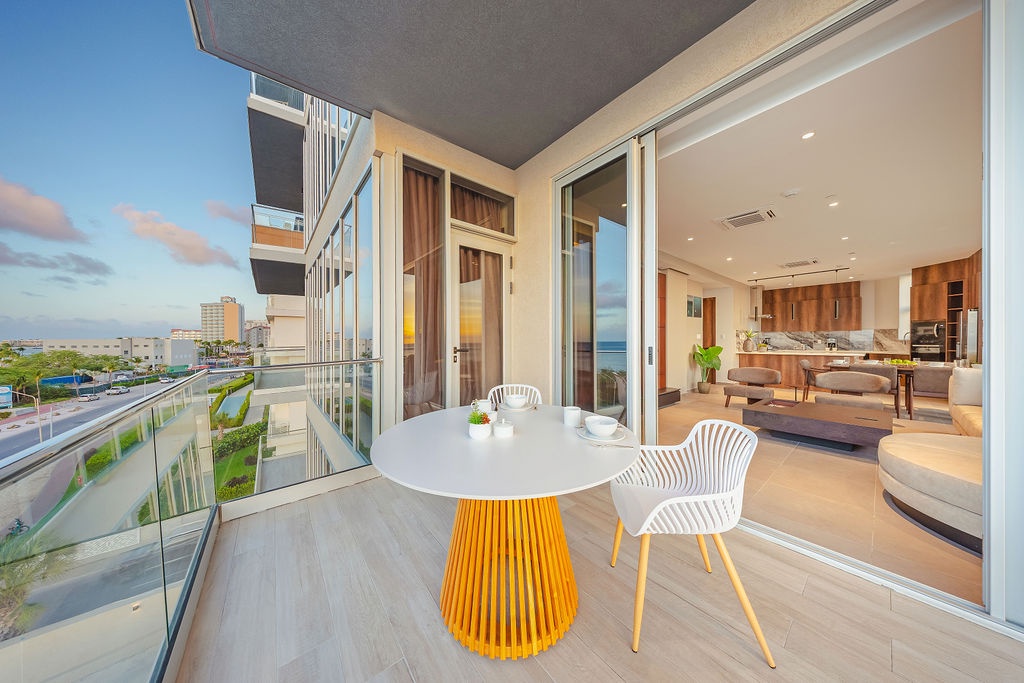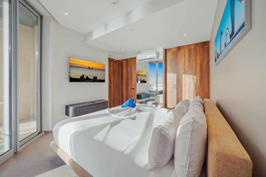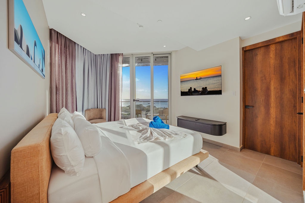 Guests can enjoy excellent shared amenities, including a swimming pool, fitness center, and a rooftop hot tub with beautiful views of the Caribbean Sea. Eagle Beach is just a short walk away, known for its white sand and crystal clear water, along with nearby dining, shopping, and local attractions.
