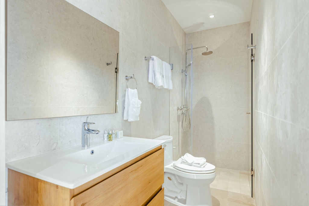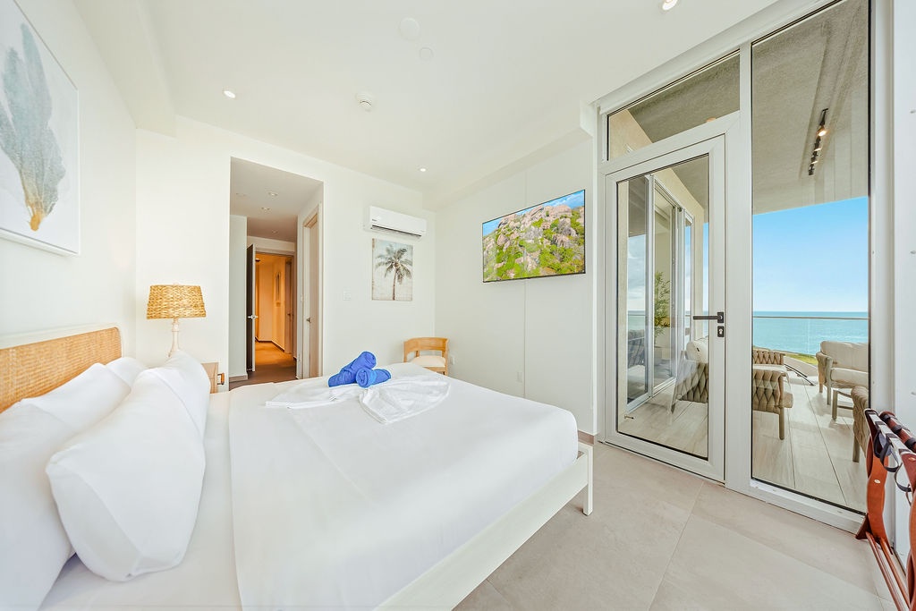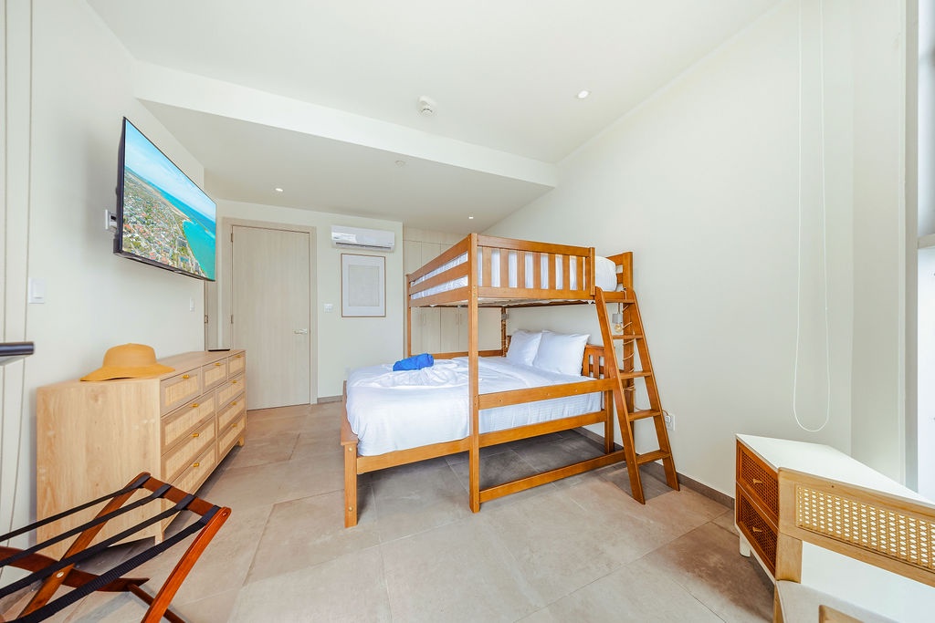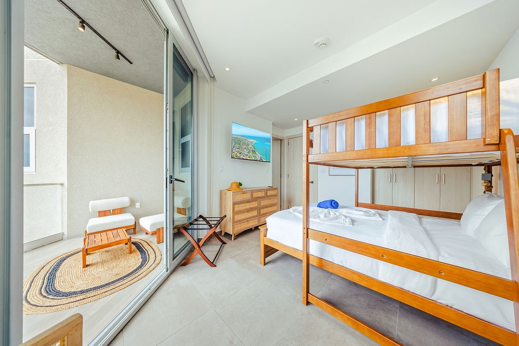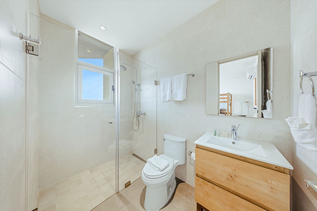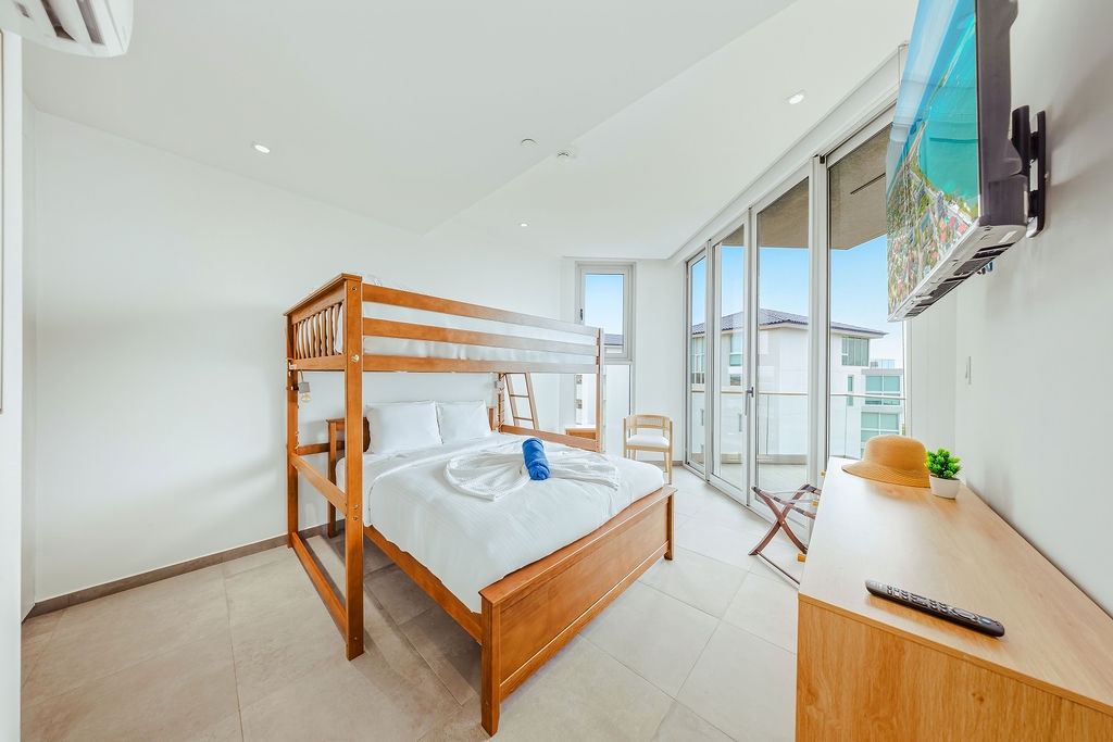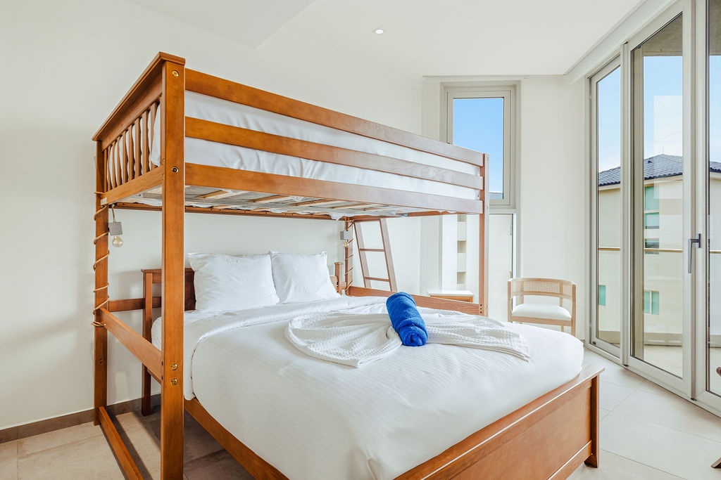 The master bedroom features a plush king-sized bed, ensuring a restful night's sleep, while the second bedroom comfortably accommodates four guests with queen-sized beds bunk beds. Each bedroom is designed with your comfort in mind, offering ample storage space and en-suite bathrooms for your convenience. The three full bathrooms are elegantly appointed, providing a spa-like retreat after a day of exploration.