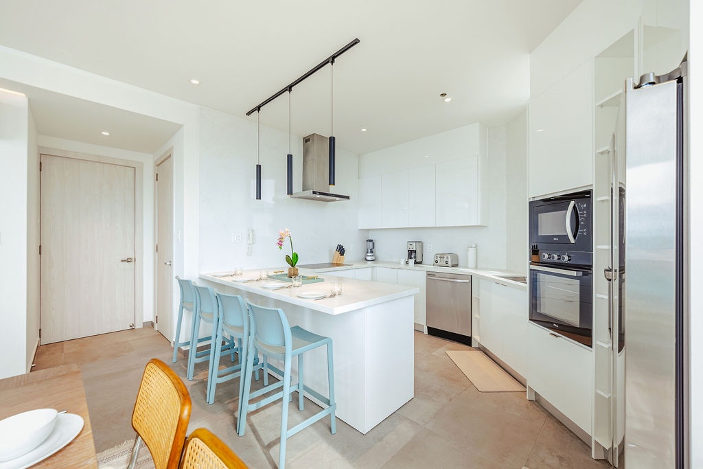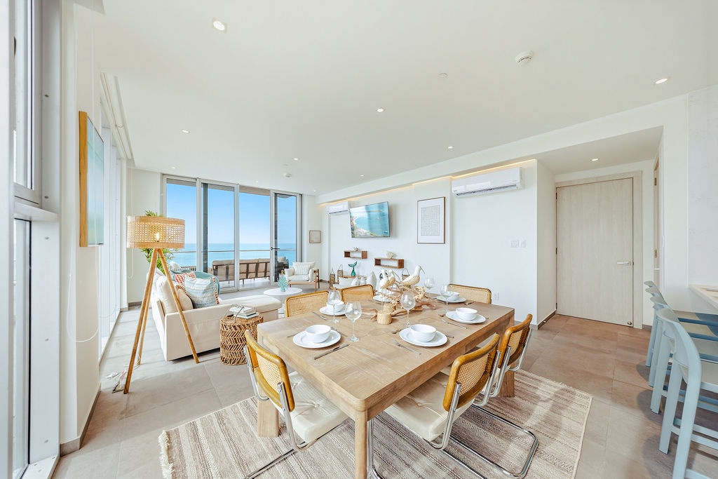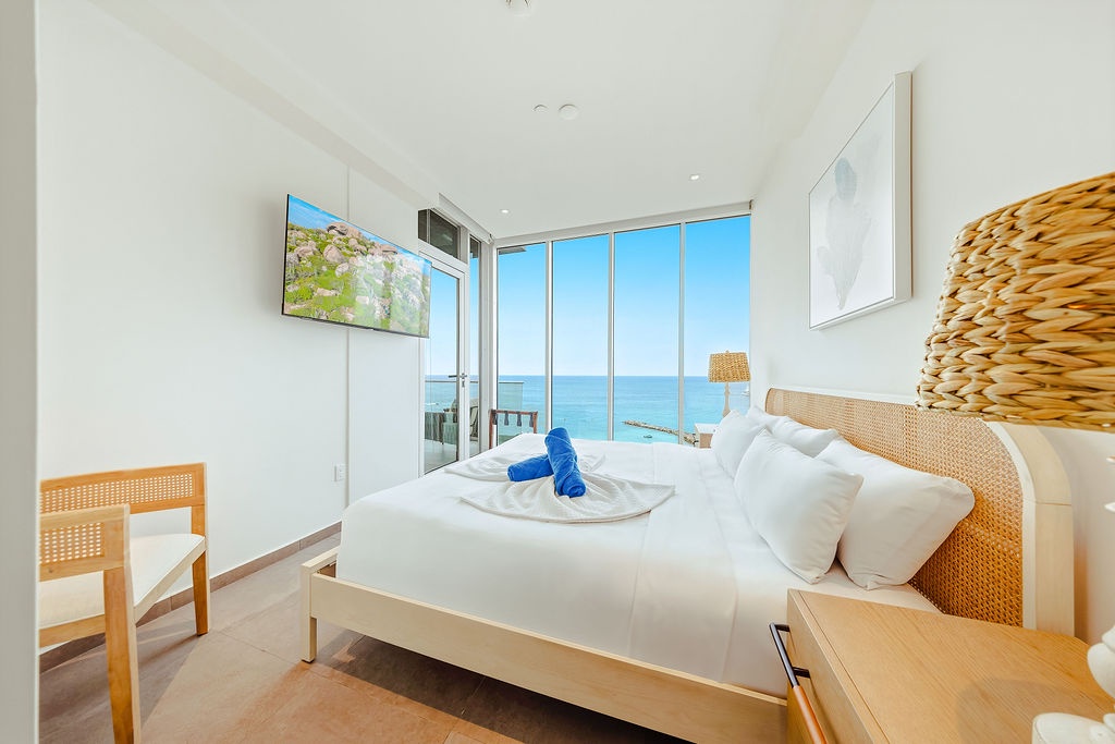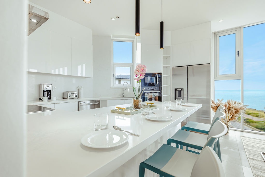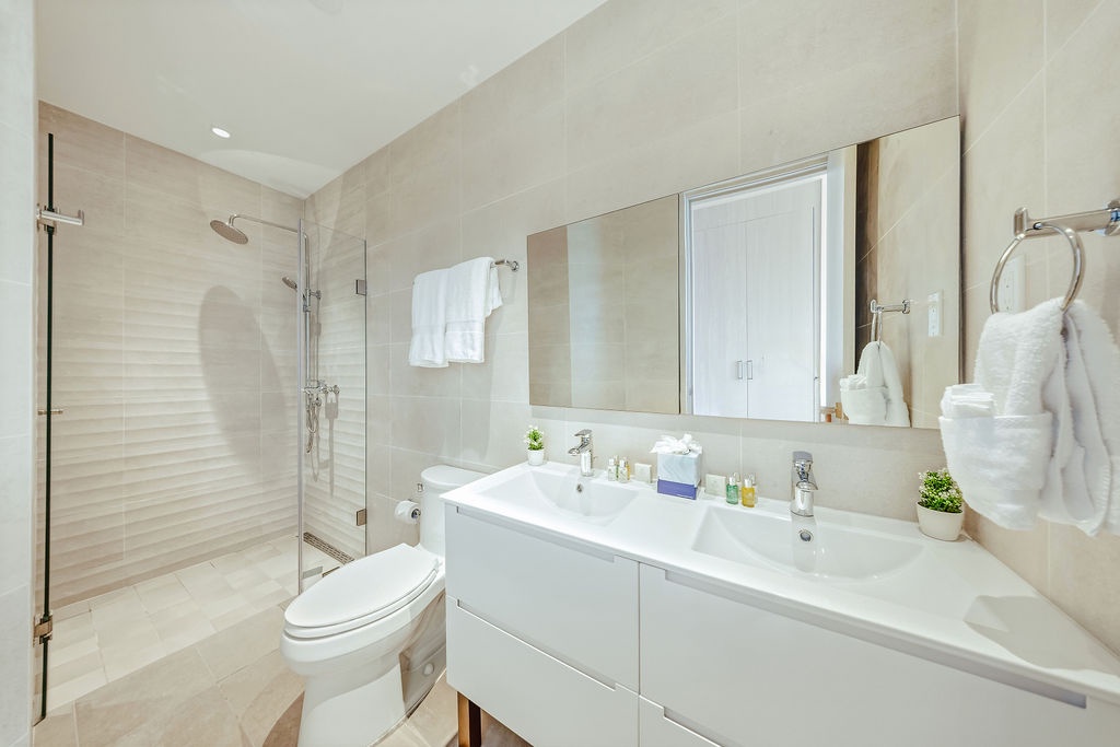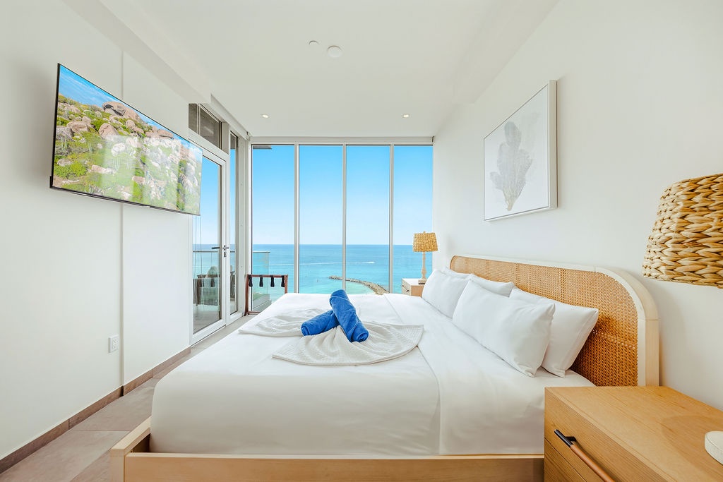 The master bedroom features a plush king-sized bed, ensuring a restful night's sleep, while the second bedroom comfortably accommodates four guests with queen-sized beds bunk beds. Each bedroom is designed with your comfort in mind, offering ample storage space and en-suite bathrooms for your convenience. The three full bathrooms are elegantly appointed, providing a spa-like retreat after a day of exploration.