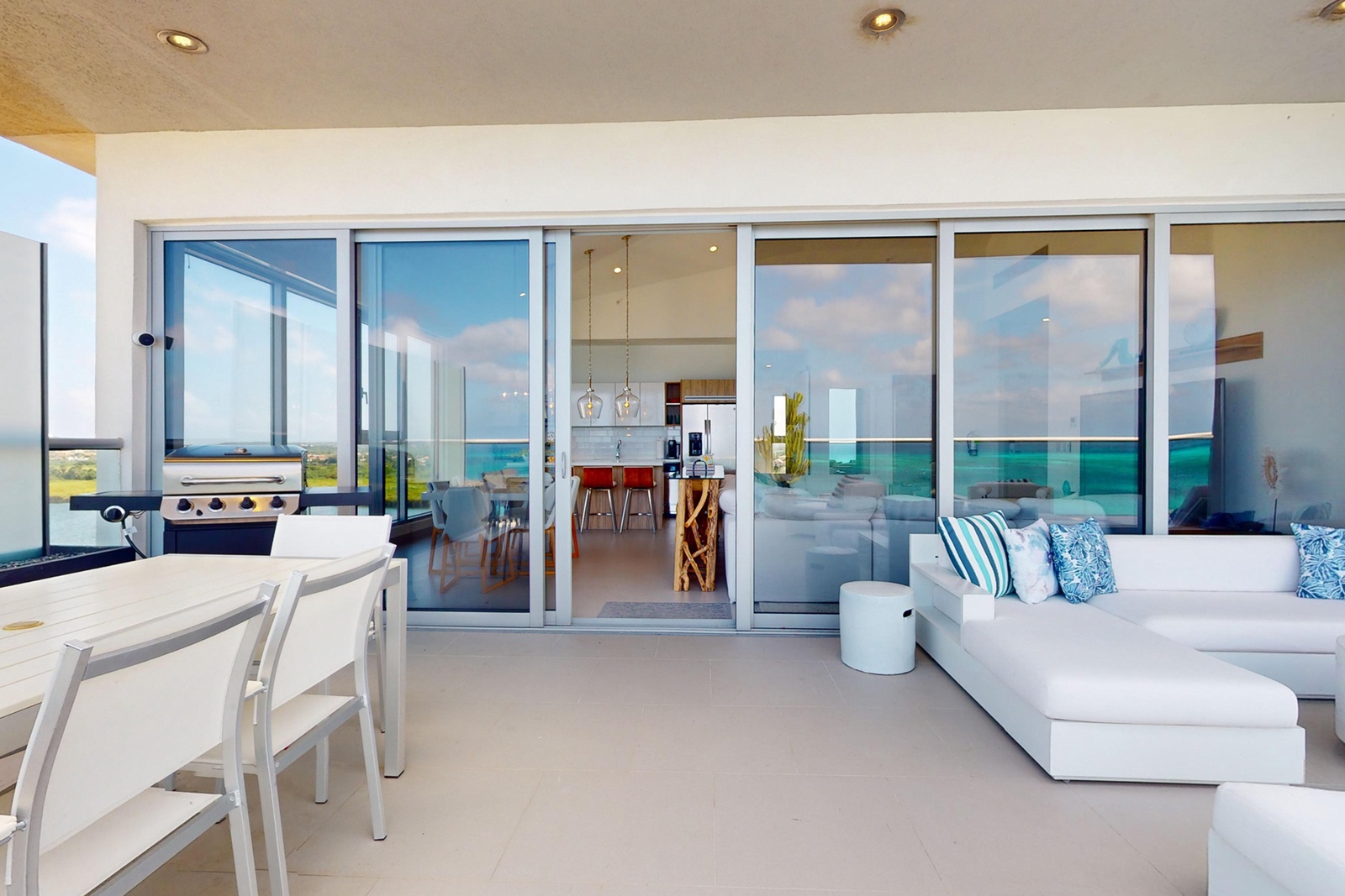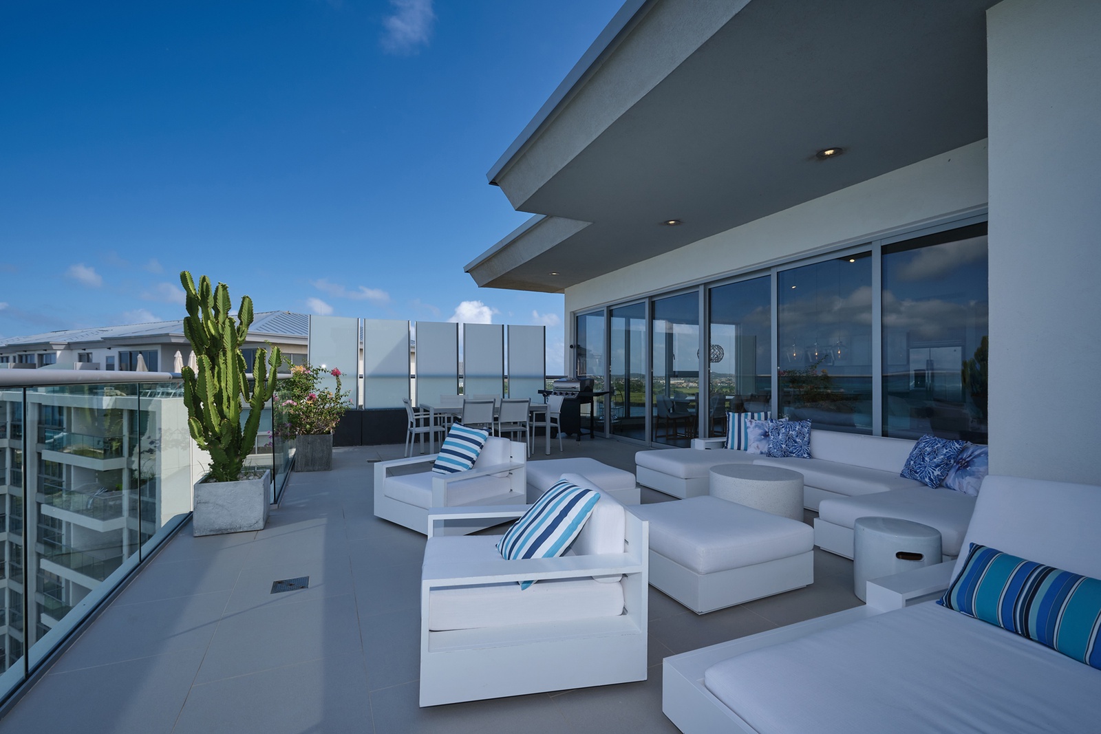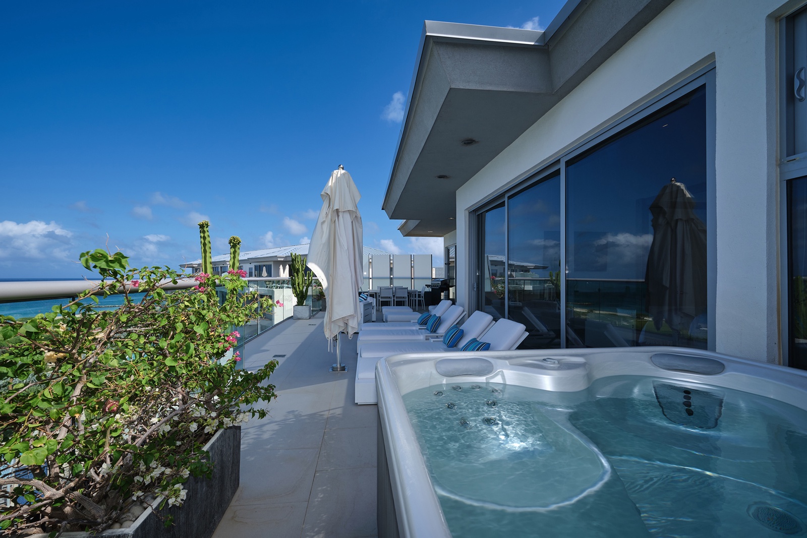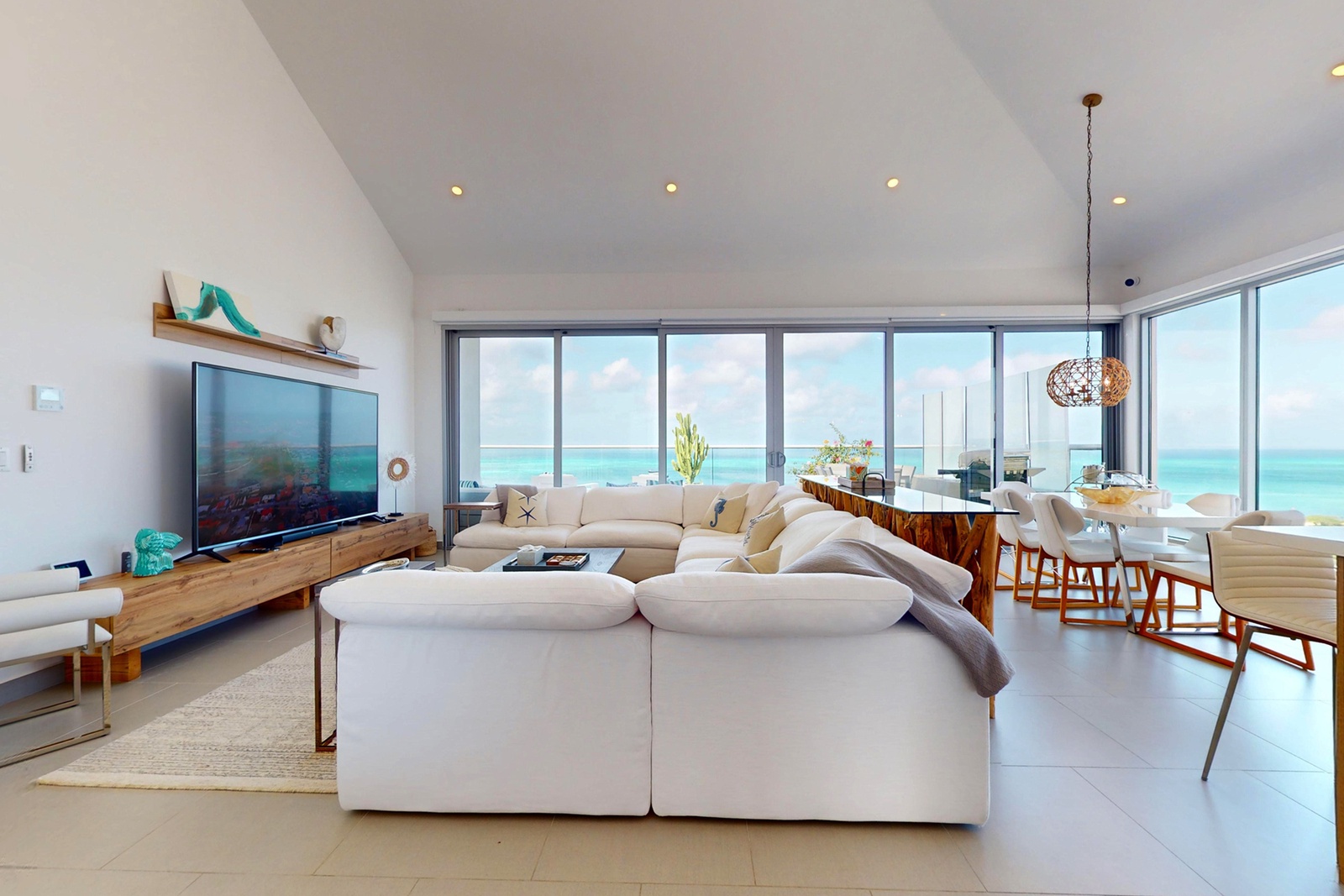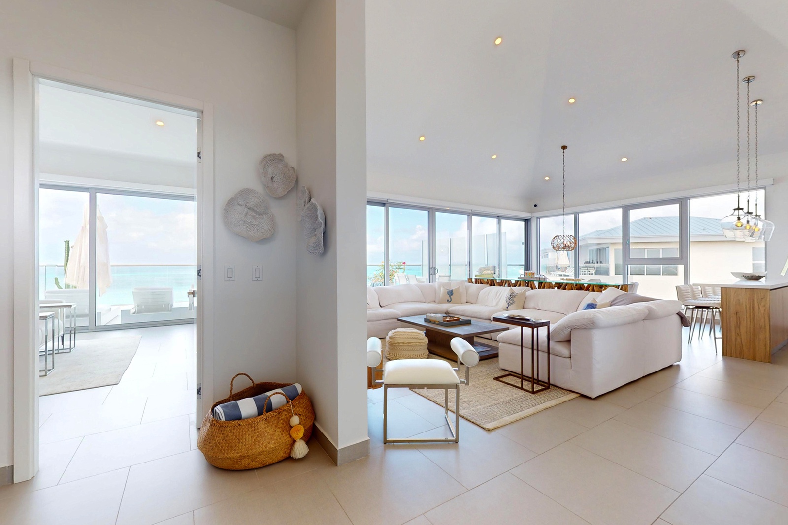 Enjoy the open-concept living and dining area, a fully equipped modern kitchen, and a separate TV room for extra relaxation space. Step out onto the expansive private terrace, where you’ll find a BBQ grill, hot tub, and panoramic views of the turquoise Caribbean Sea—a perfect setting for unforgettable sunsets.