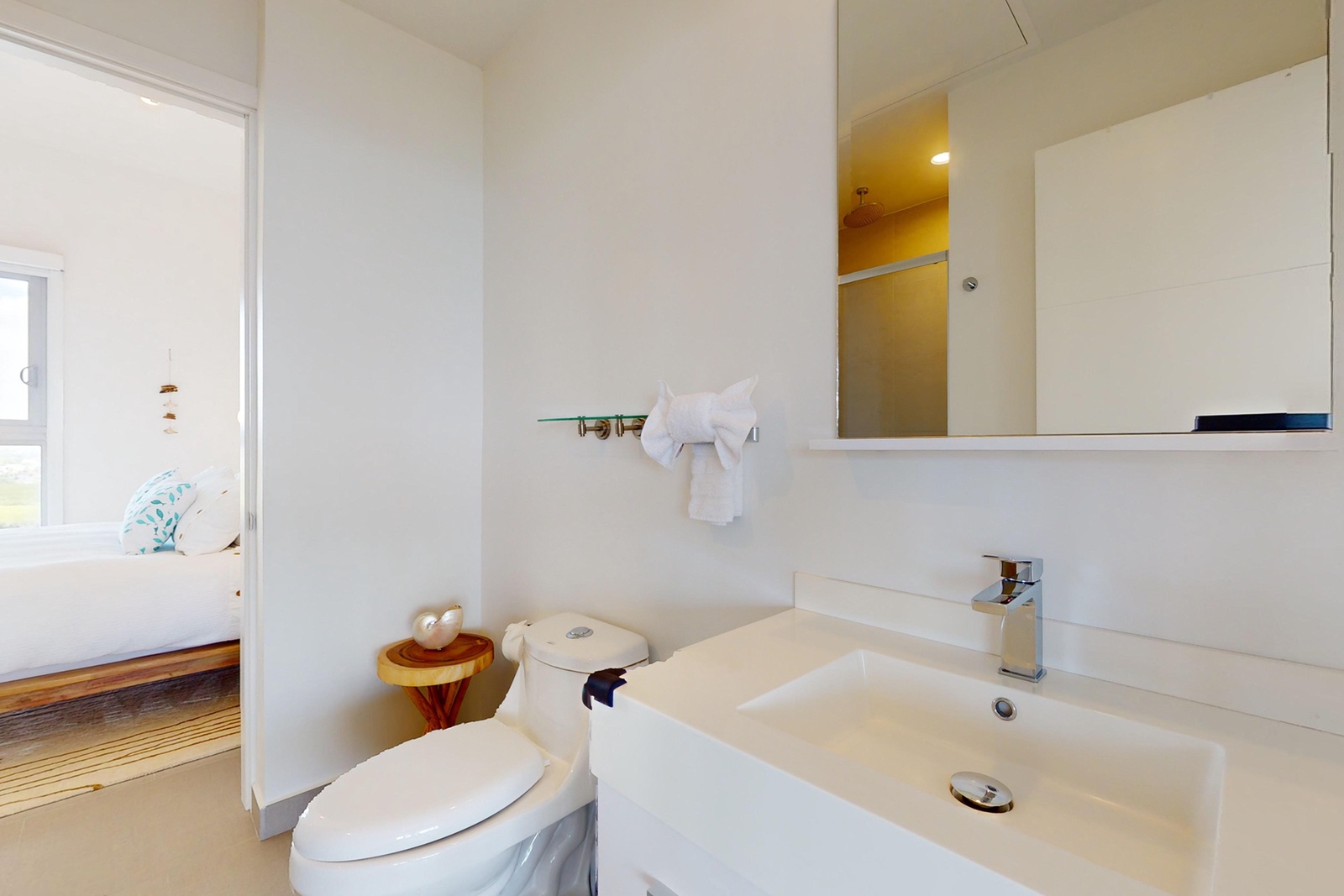 • Each bathroom has their own white towels and blue beach towels below the closet sink