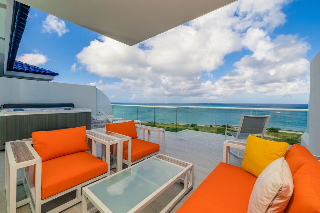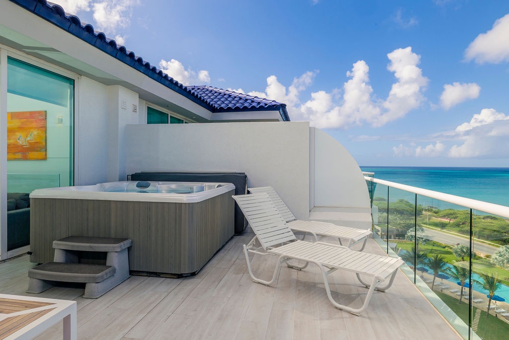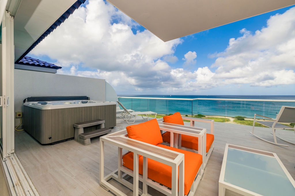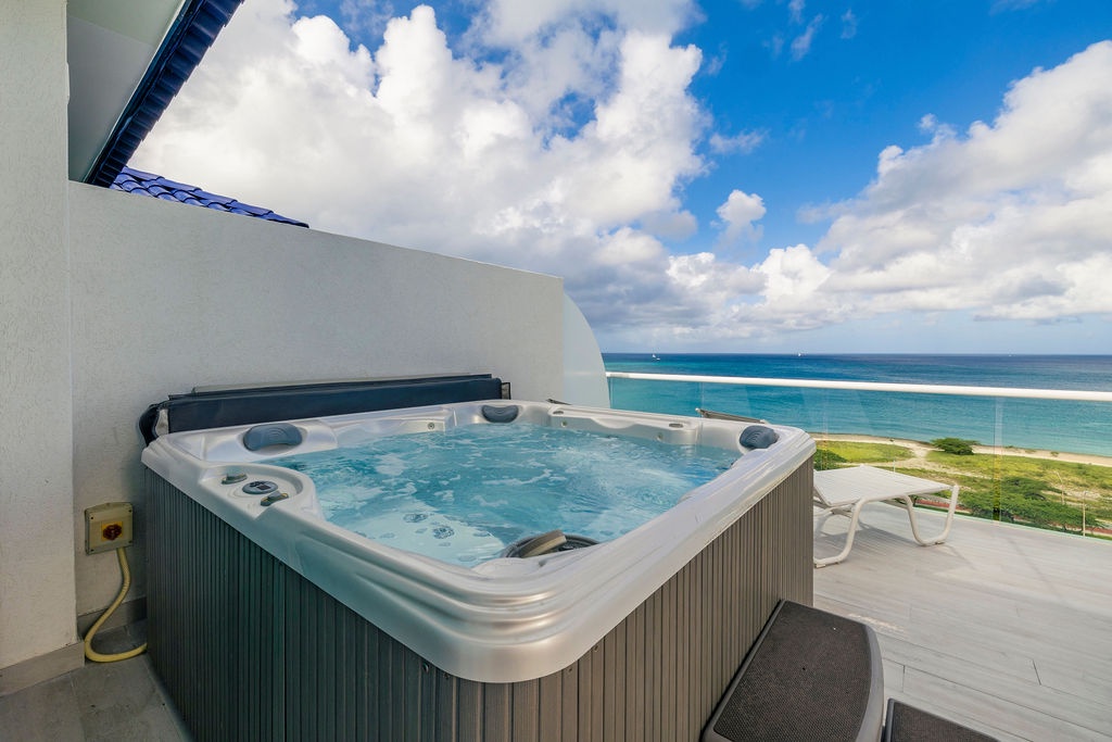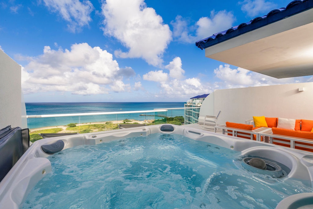 This fully air-conditioned, 2,150 sq. ft. penthouse is spread across two levels, featuring quality furnishings and beautiful décor from local artists. The upper level boasts a cathedral ceiling over the open-plan living and dining area. The fully equipped kitchen includes a cabinet stocked with herbs, spices, and oils for your culinary adventures. Step out onto the expansive deck to soak in the breathtaking views from your private Jacuzzi.