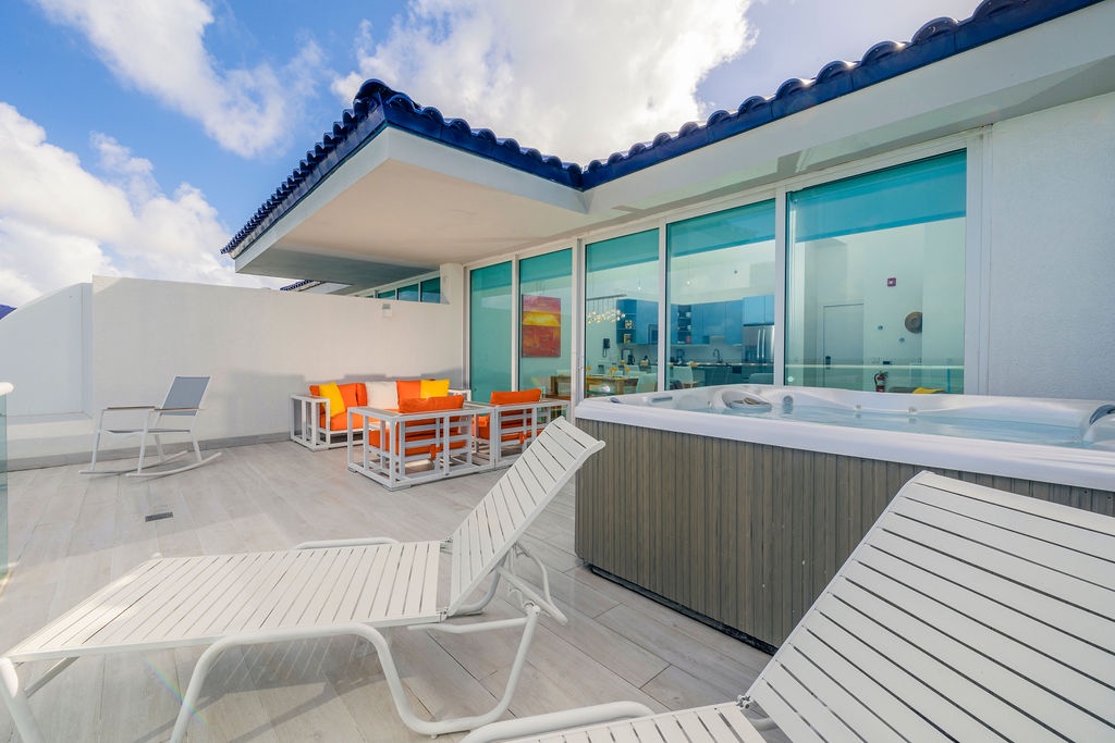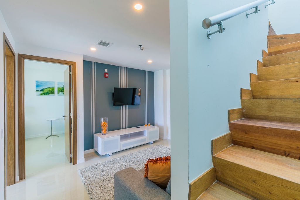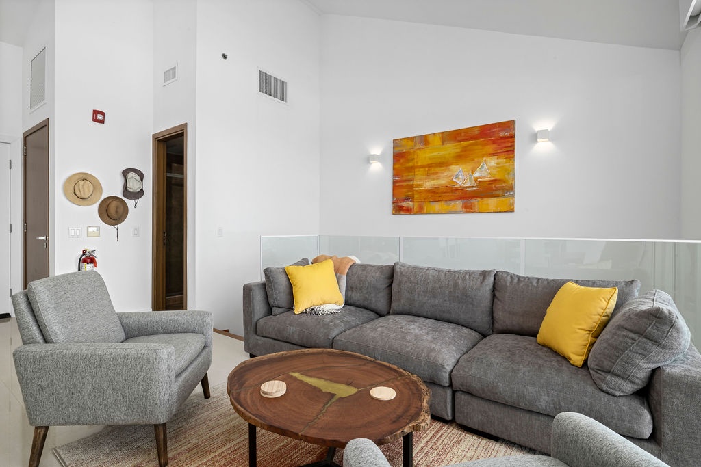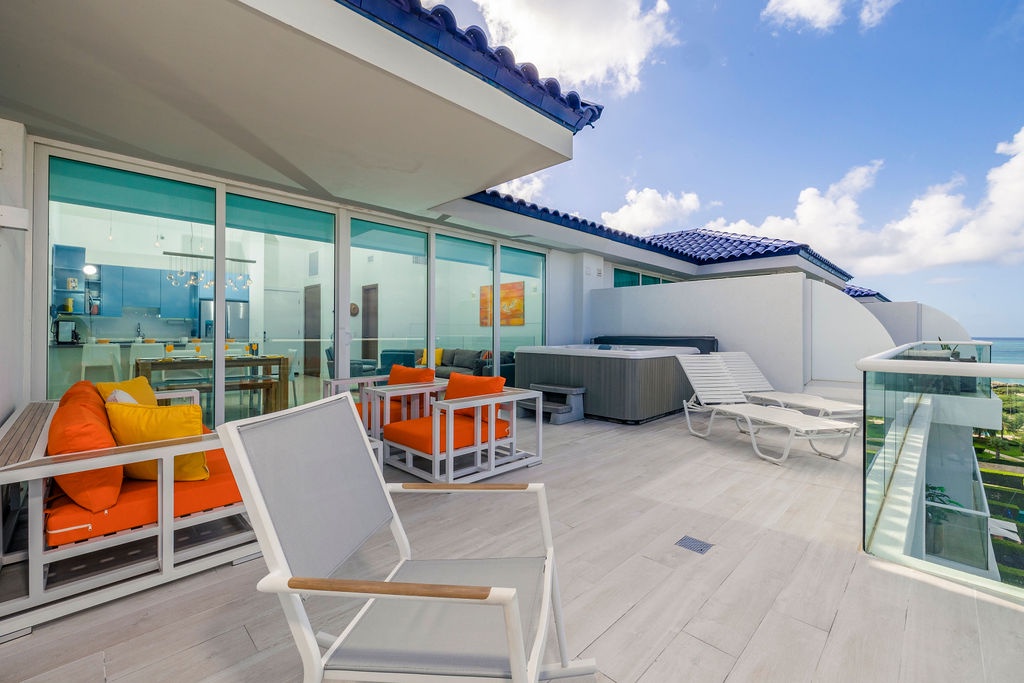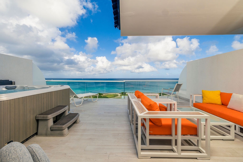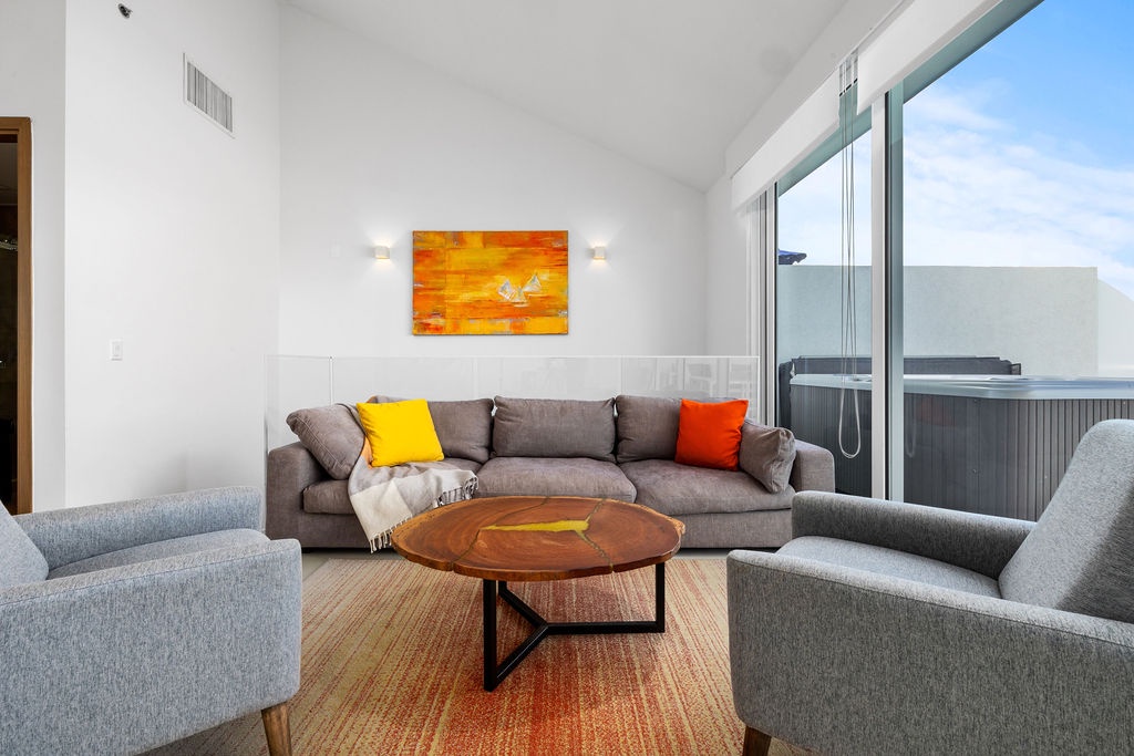 This fully air-conditioned, 2,150 sq. ft. penthouse is spread across two levels, featuring quality furnishings and beautiful décor from local artists. The upper level boasts a cathedral ceiling over the open-plan living and dining area. The fully equipped kitchen includes a cabinet stocked with herbs, spices, and oils for your culinary adventures. Step out onto the expansive deck to soak in the breathtaking views from your private Jacuzzi.