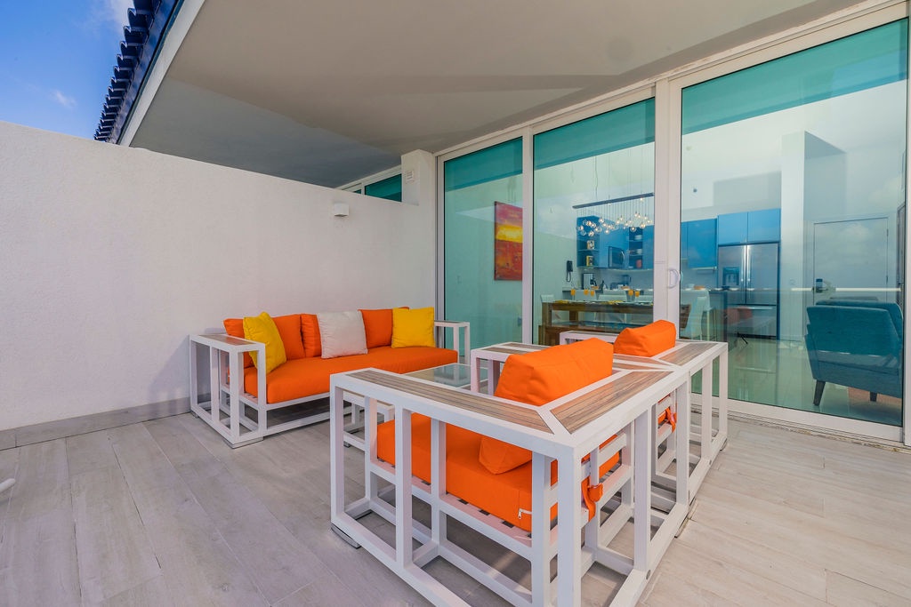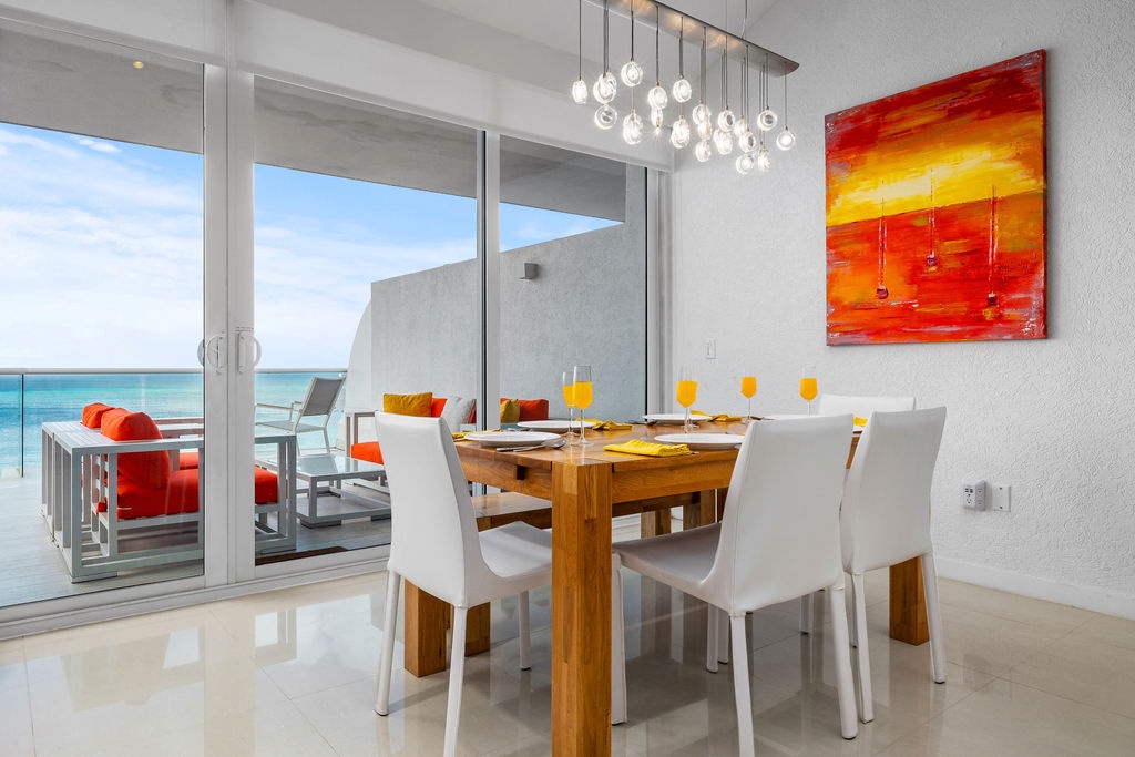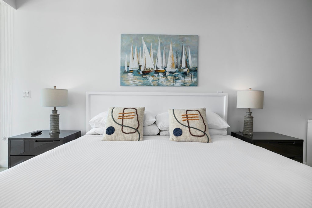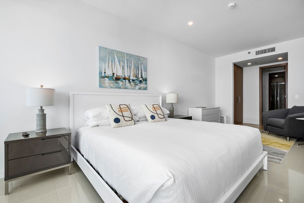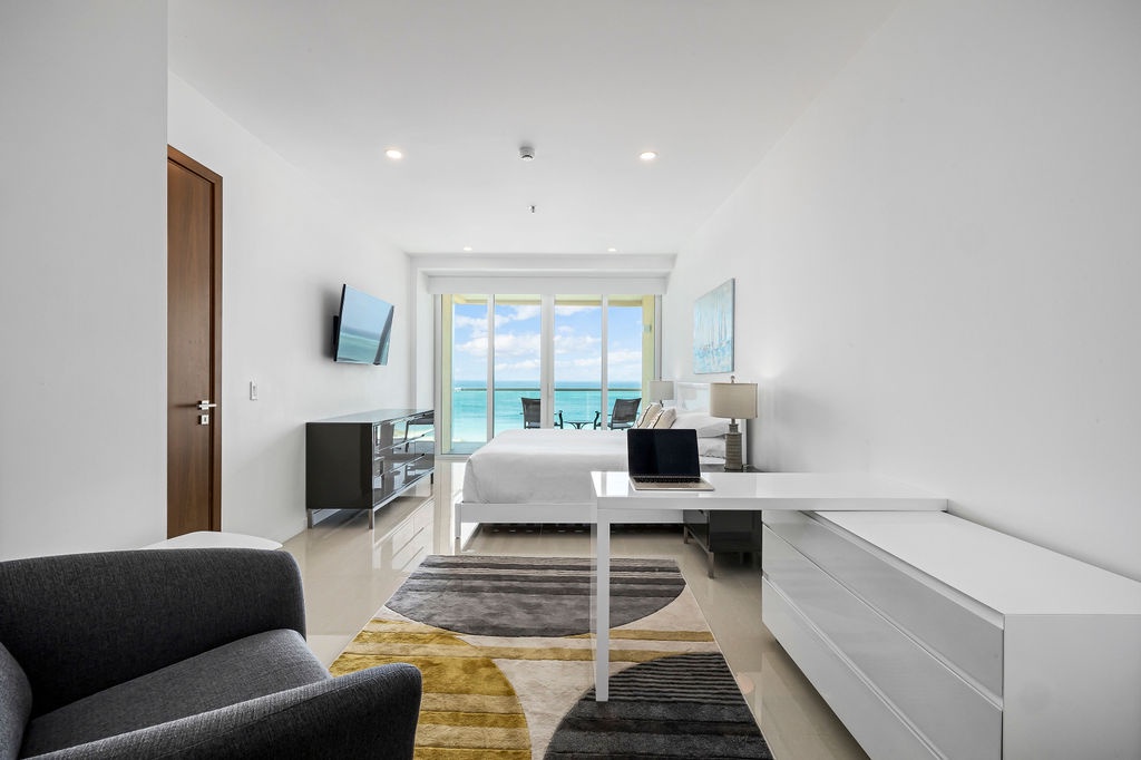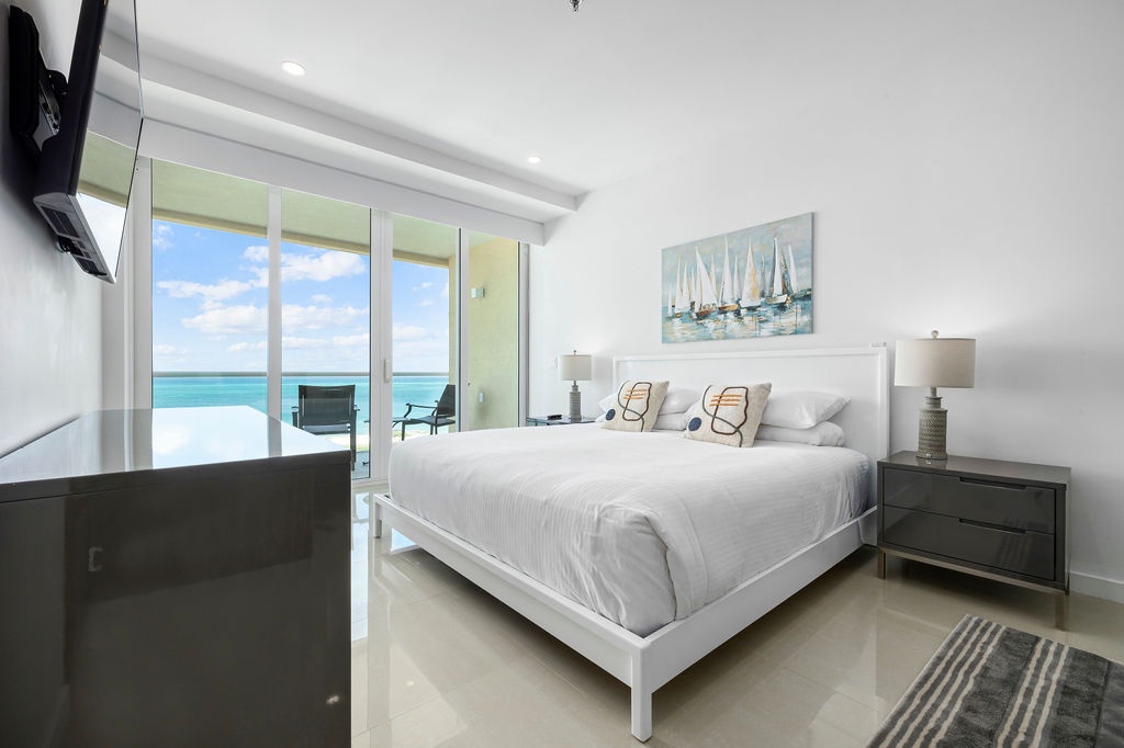 * Master Bedroom: A quiet retreat with a king-size bed, a private balcony with ocean views, and a convertible dresser/desk.