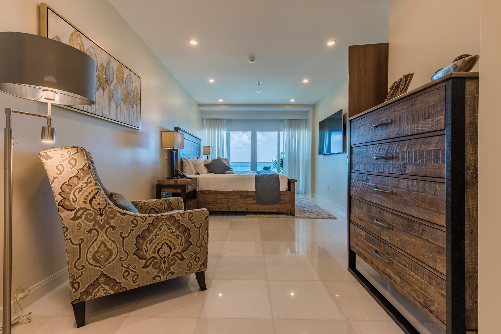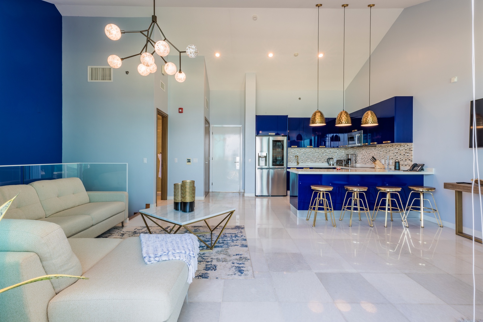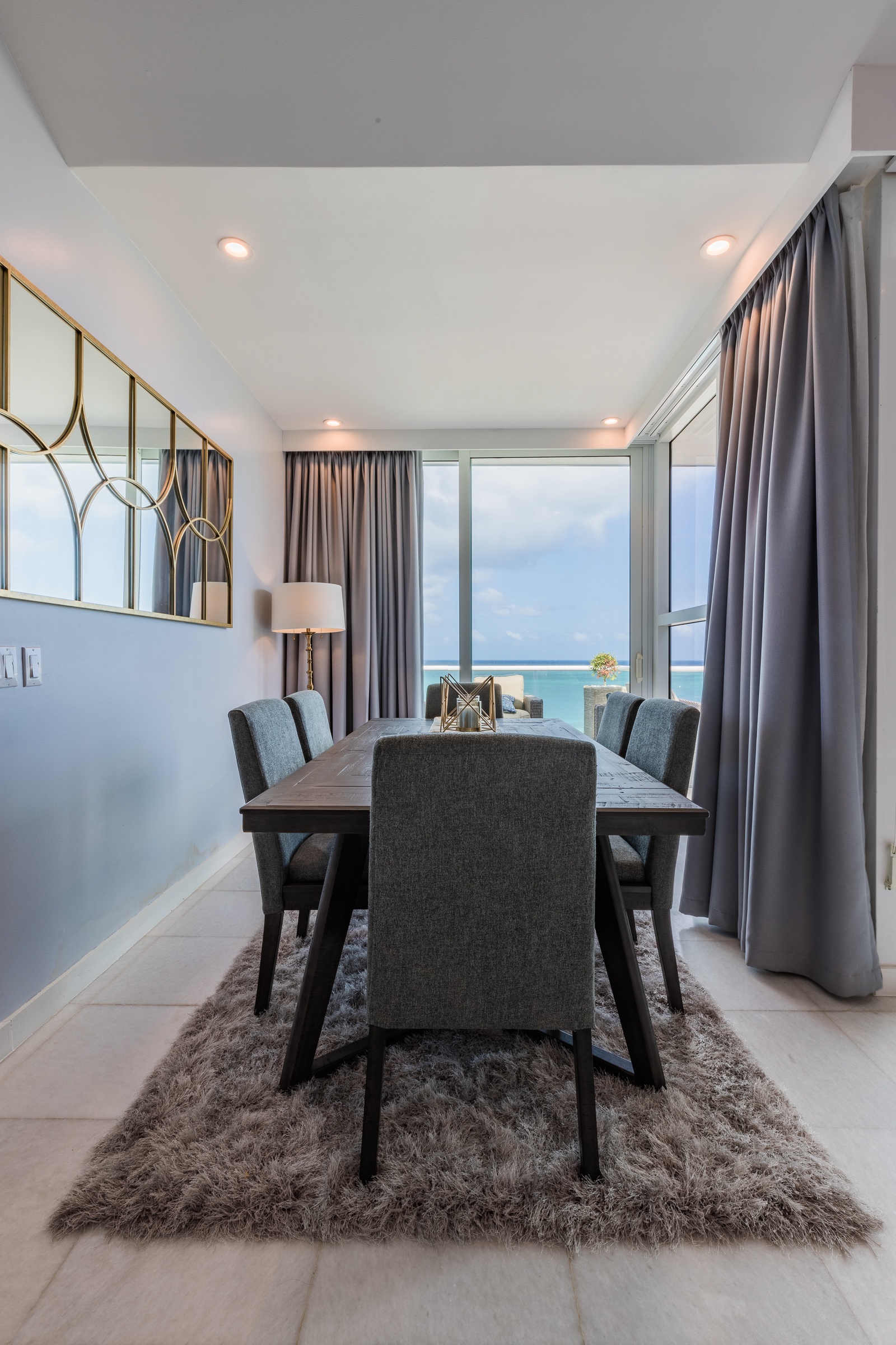 Once you enter the penthouse, you will encounter yourself with the spectacular ocean view and the elegant and modern décor living room, fully equipped kitchen and private dining space. A full bathroom is located on the main level as well.