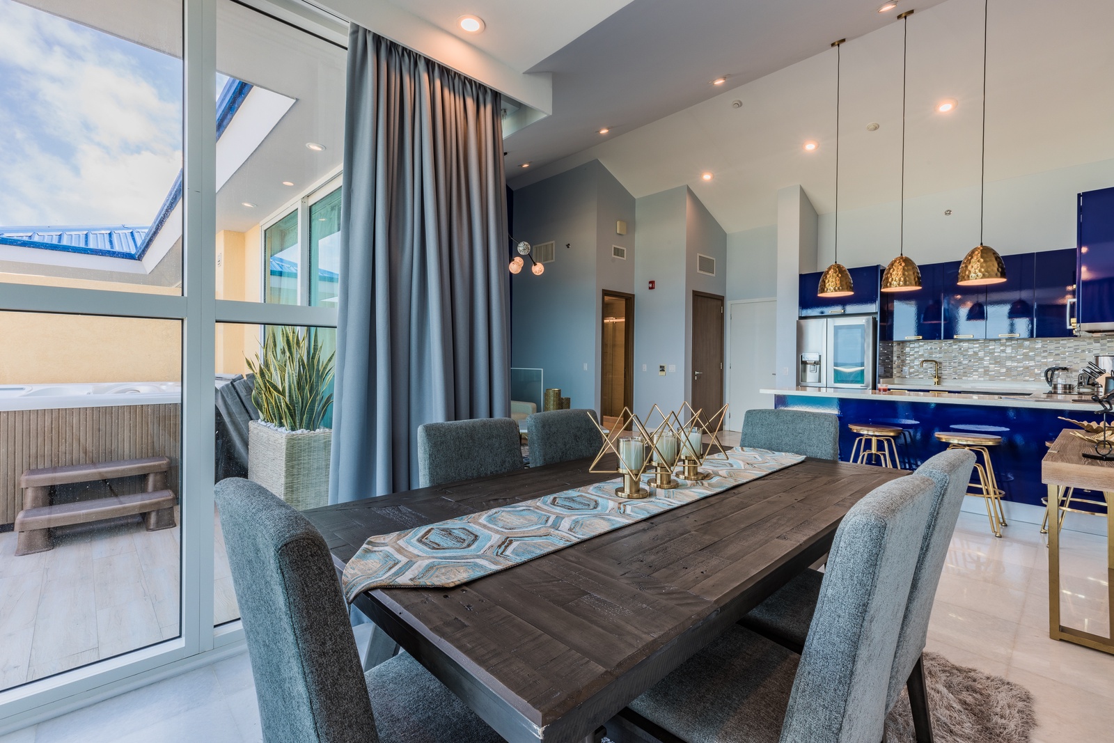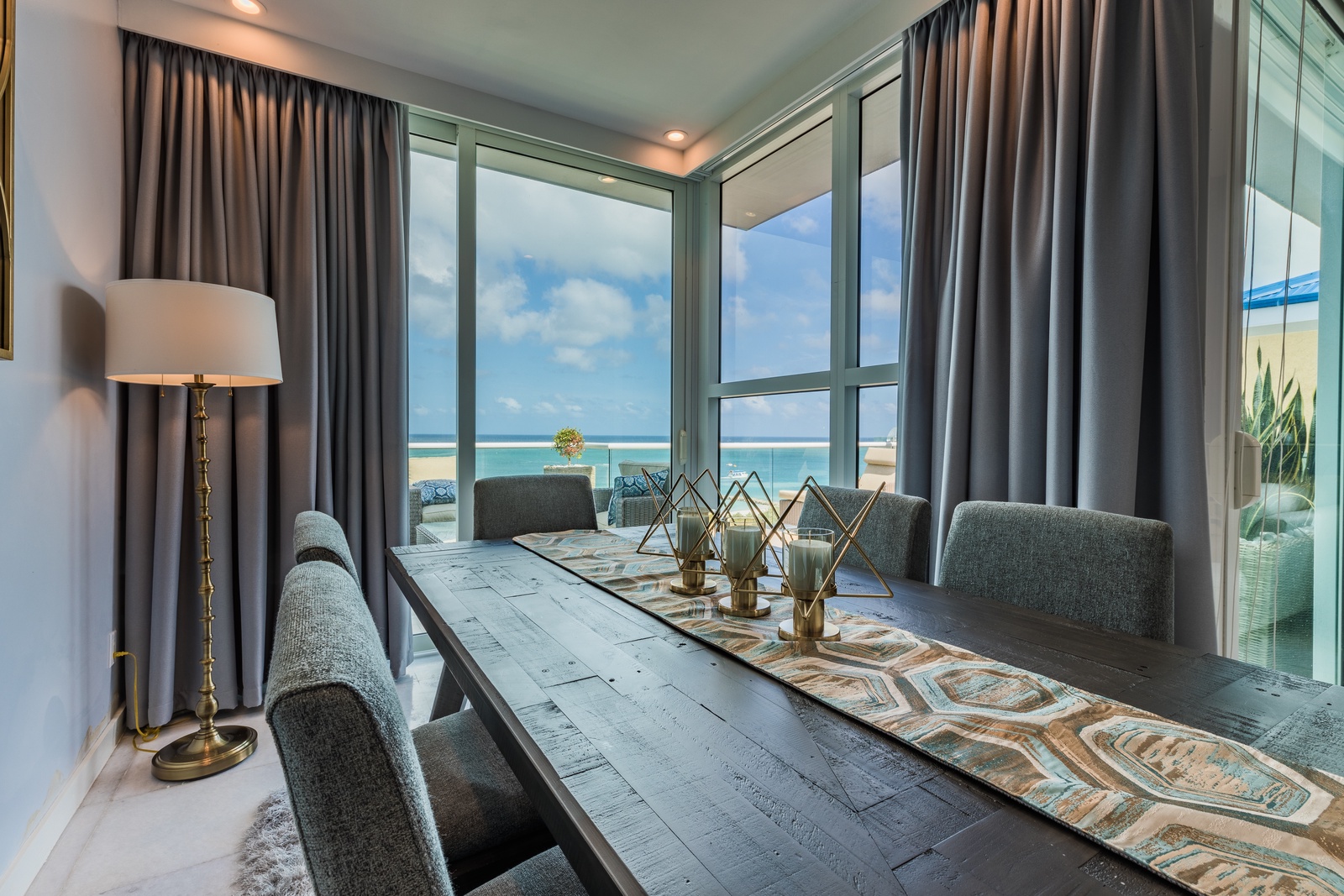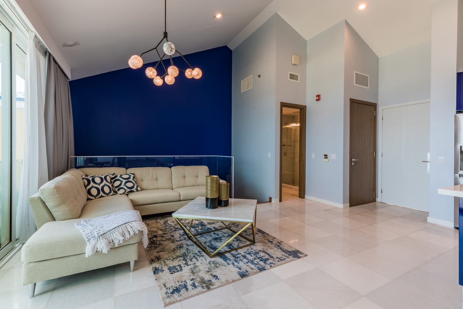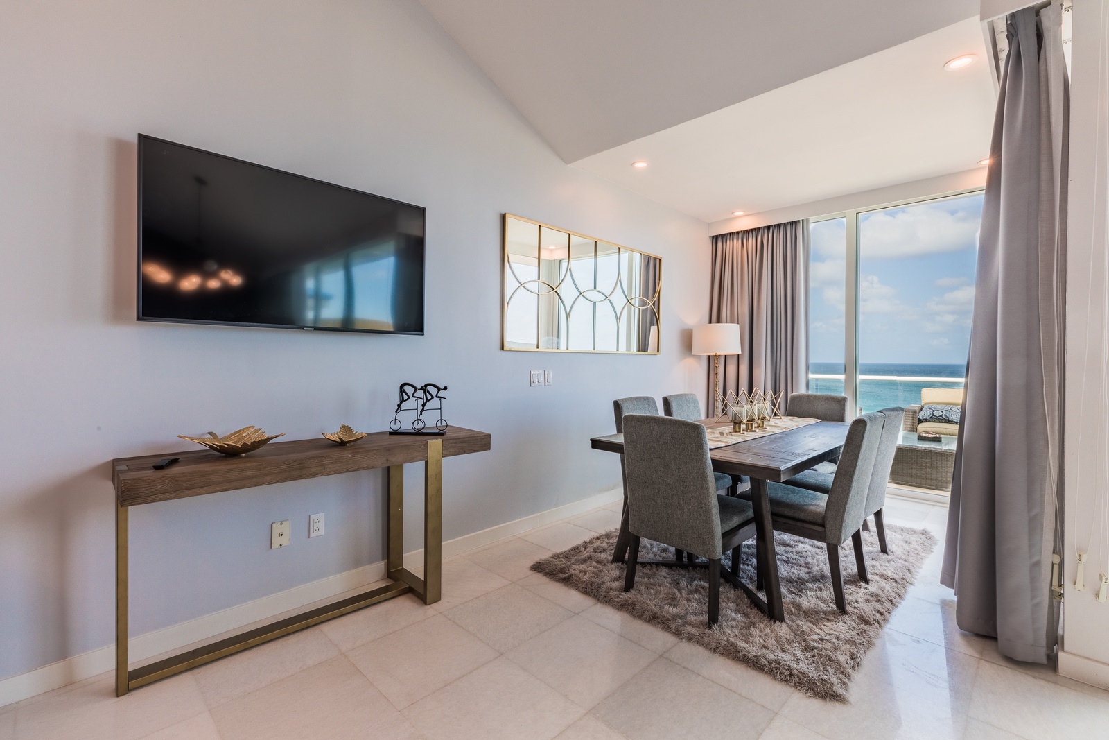 Once you enter the penthouse, you will encounter yourself with the spectacular ocean view and the elegant and modern décor living room, fully equipped kitchen and private dining space. A full bathroom is located on the main level as well.