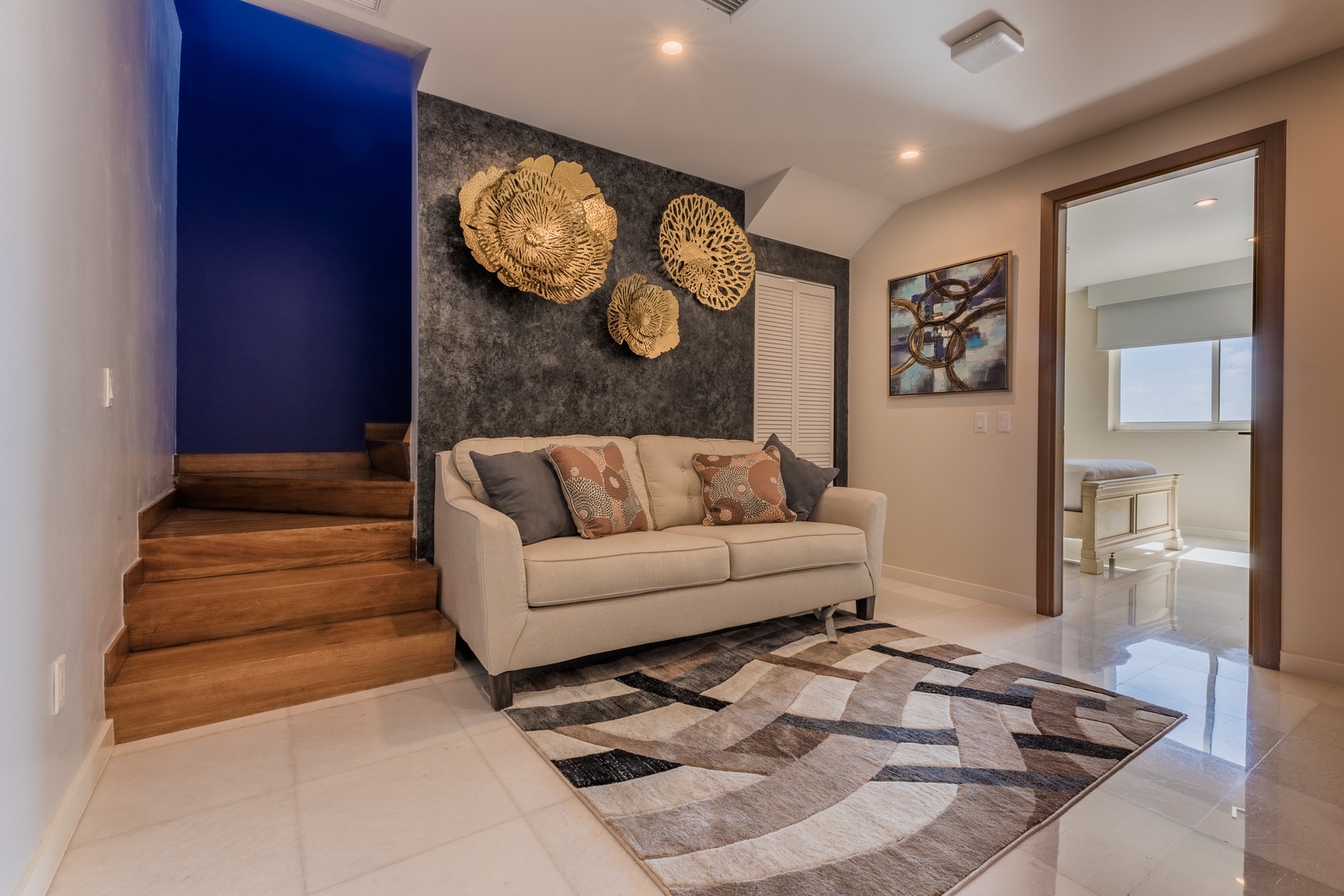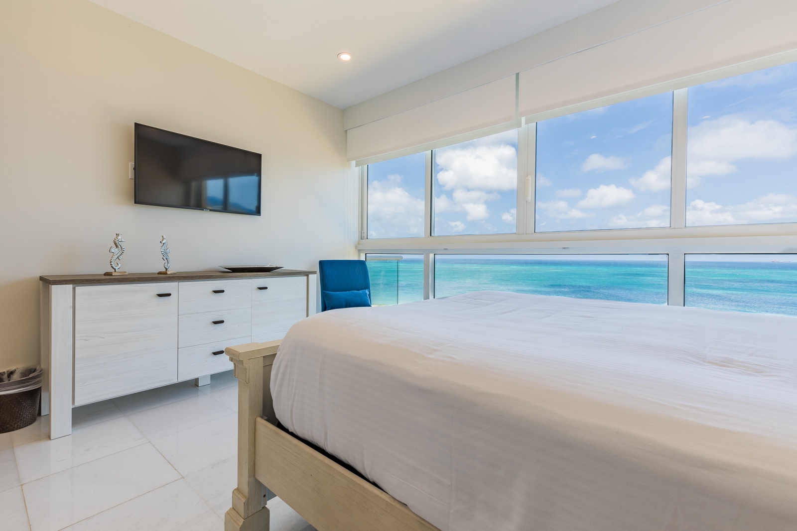 Go to the lower level through a wood staircase and modern pictures on the wall. In the lower level are the three bedrooms, each one with its private bathroom. Master with a king size bed, a relaxing chair and a balcony to view the ocean from there. Second bedroom with Ocean View and queen-size bed. Third bedroom with another queen-size bed and a window to view the Bubali Bird Sanctuary which enhance this room. Small TV room is in this lower level to keep your kids entertained and a sofa bed. The best feature of this unit is the amazing terrace, enjoy endless sunsets from the jacuzzi with your favorite drink.