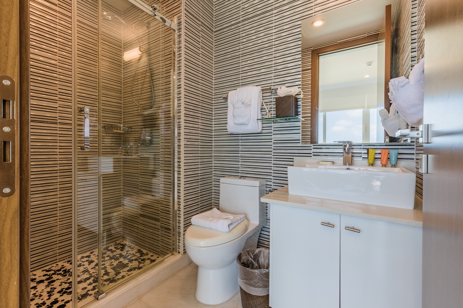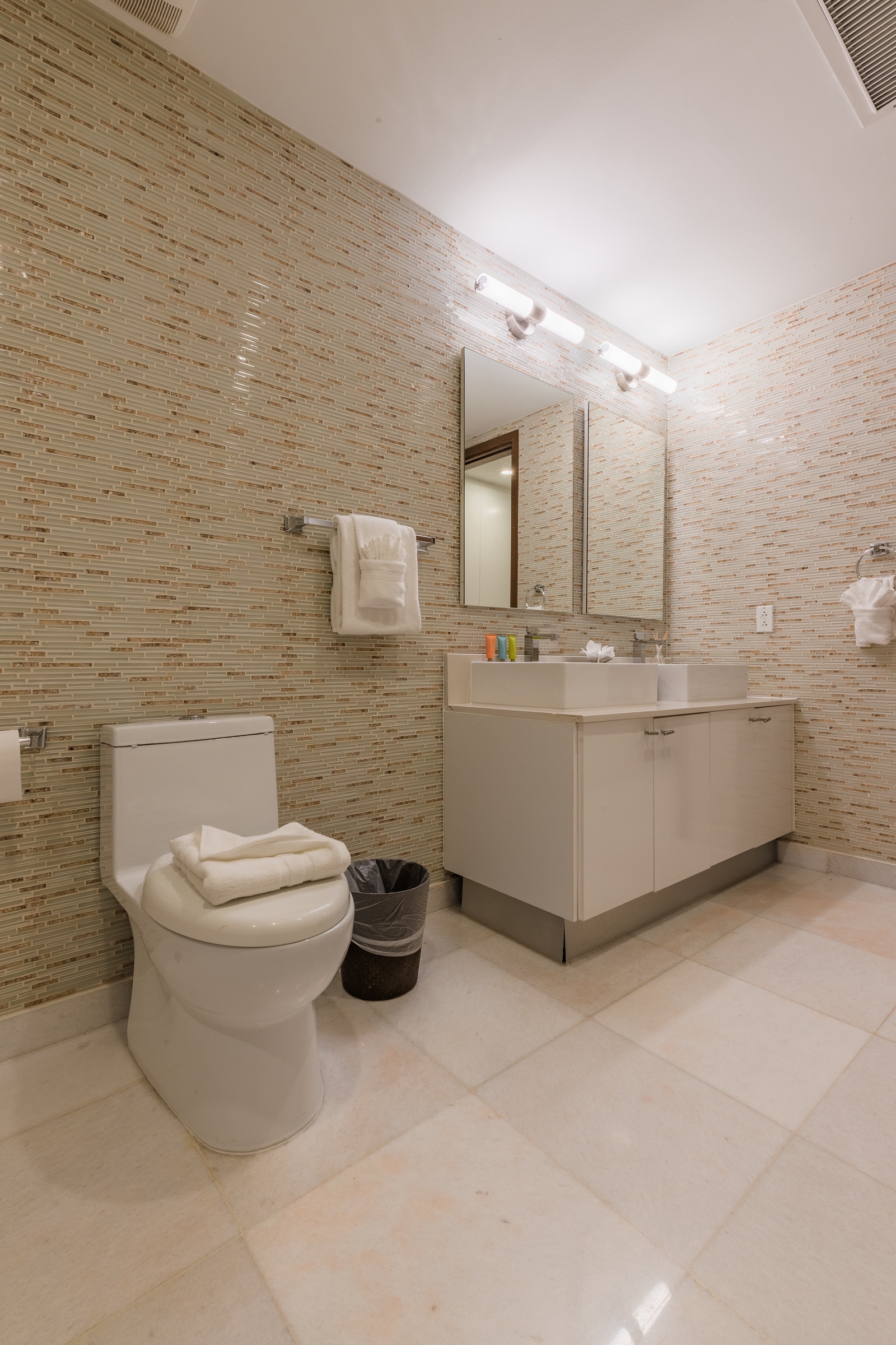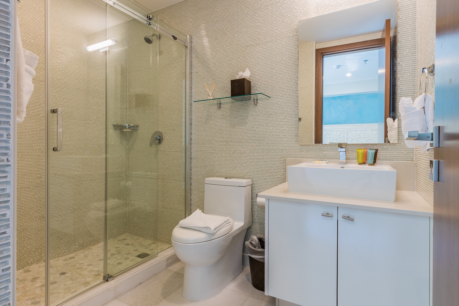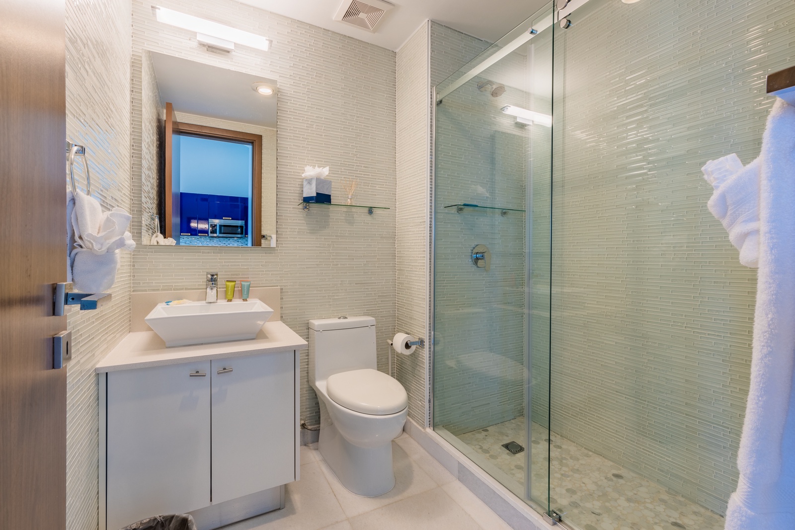 • Each bathroom has their own white towels and blue beach towels in the vanity.