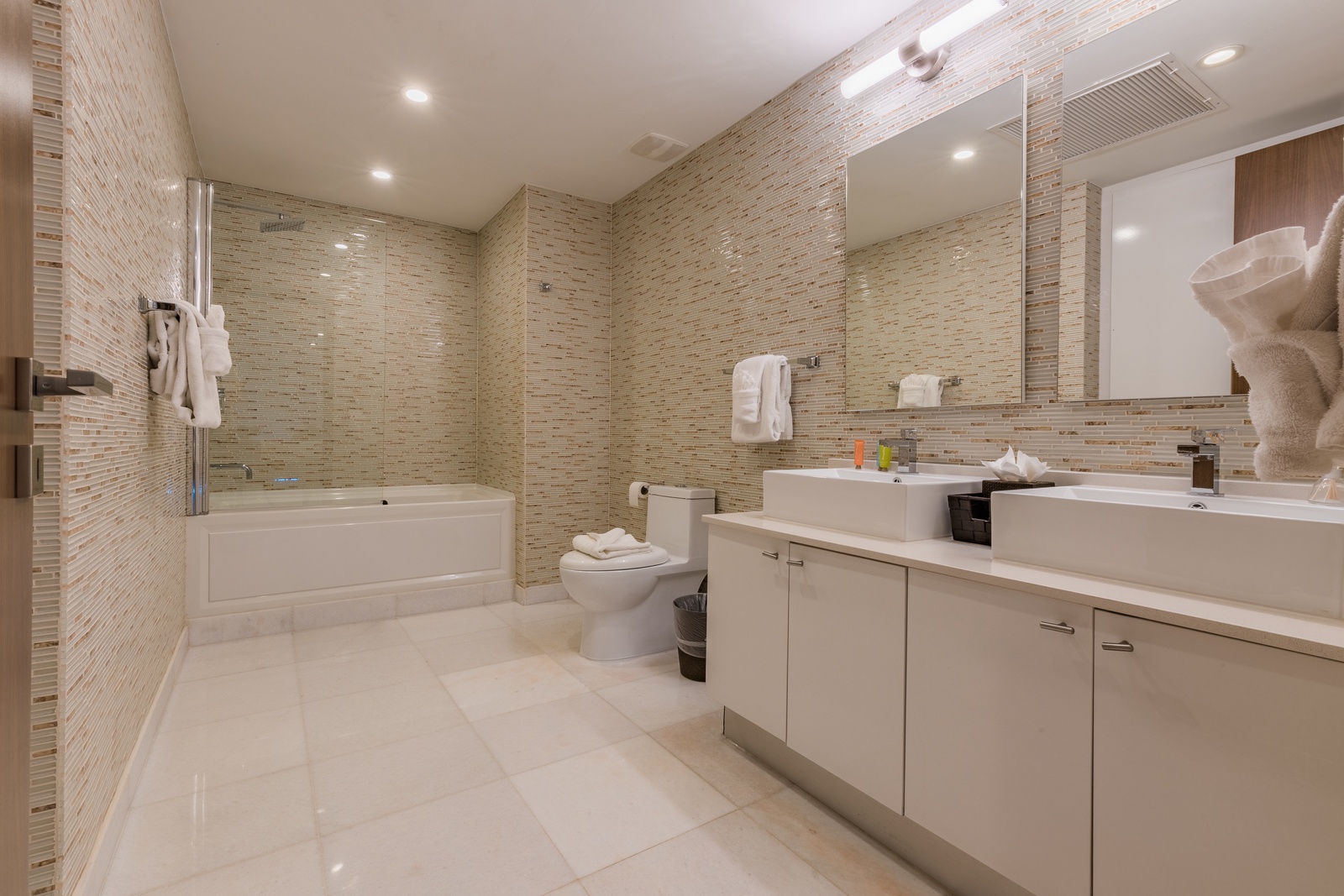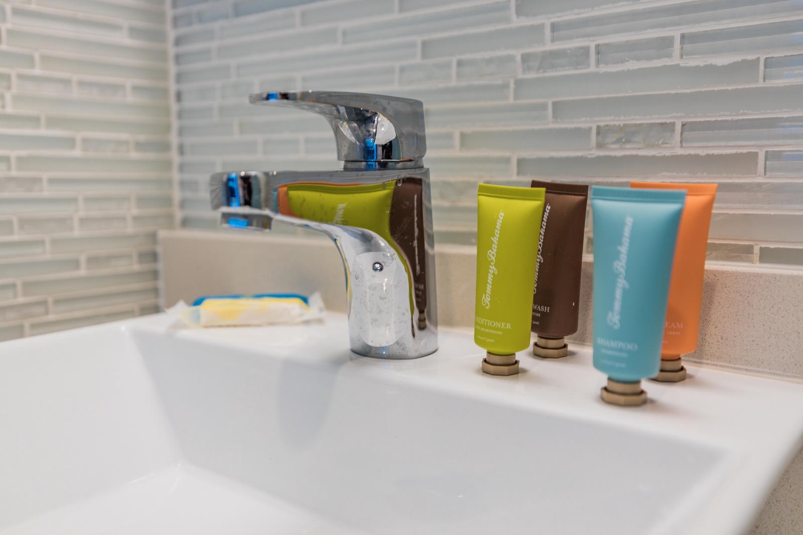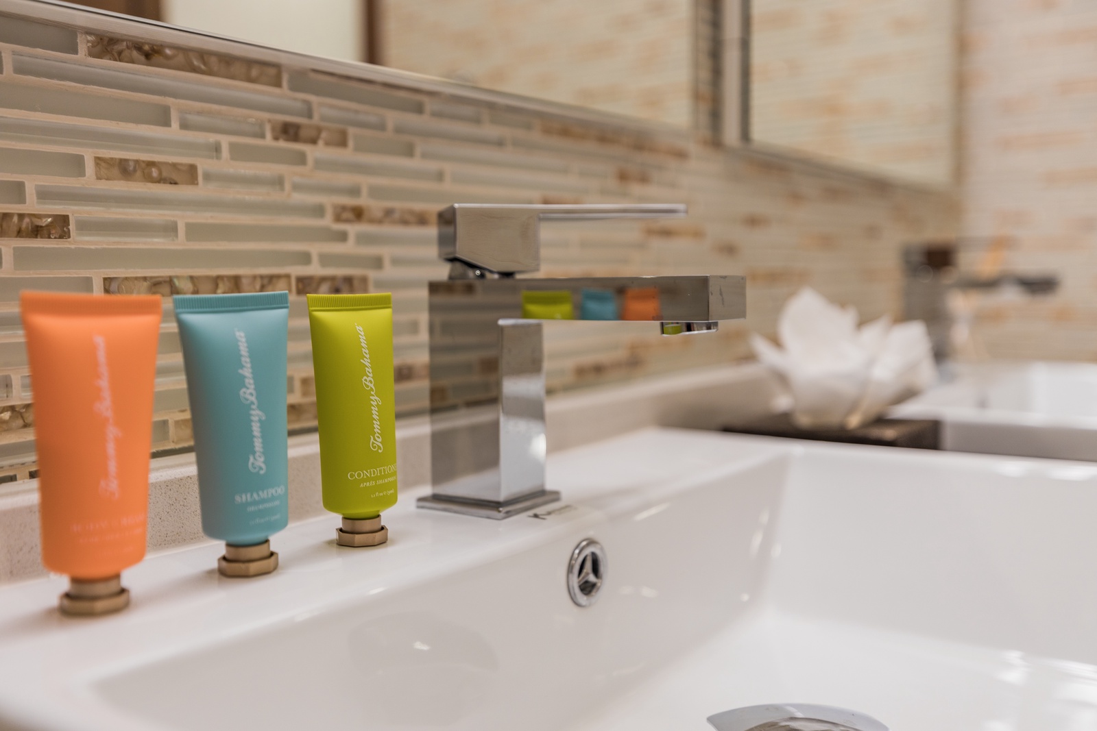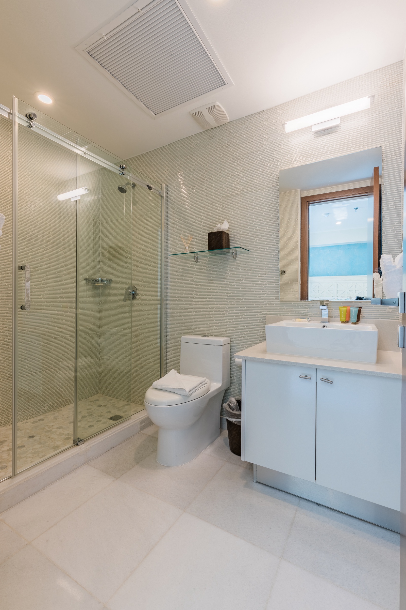 • Each bathroom has their own white towels and blue beach towels in the vanity.