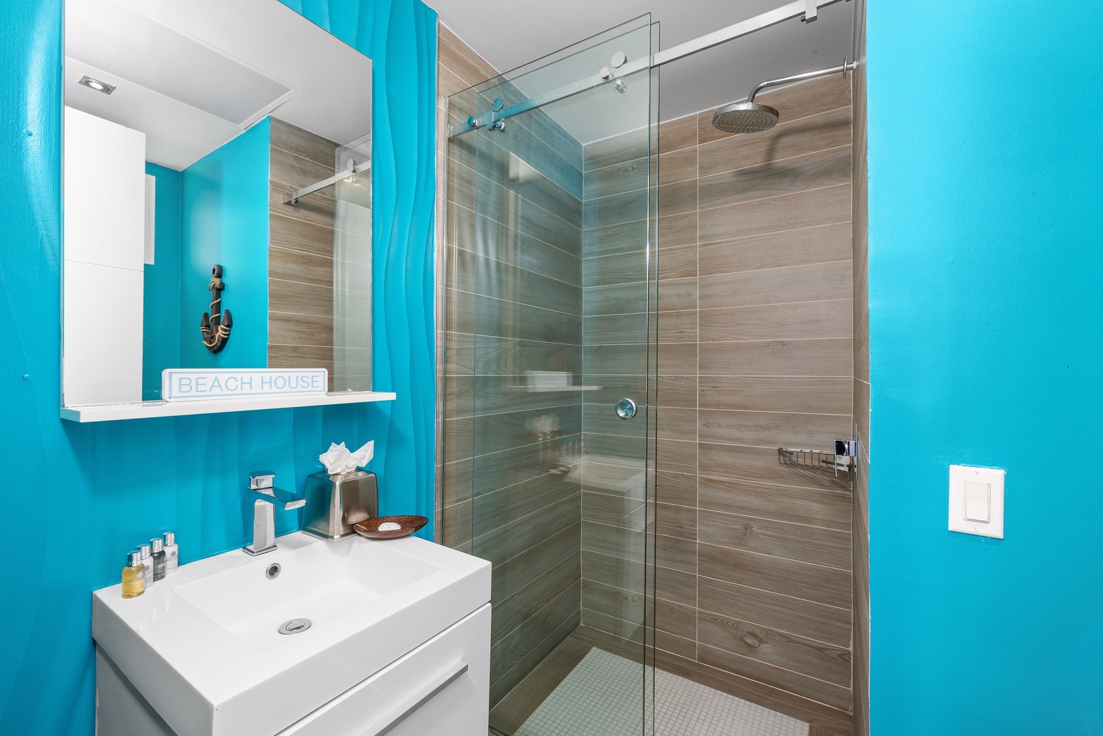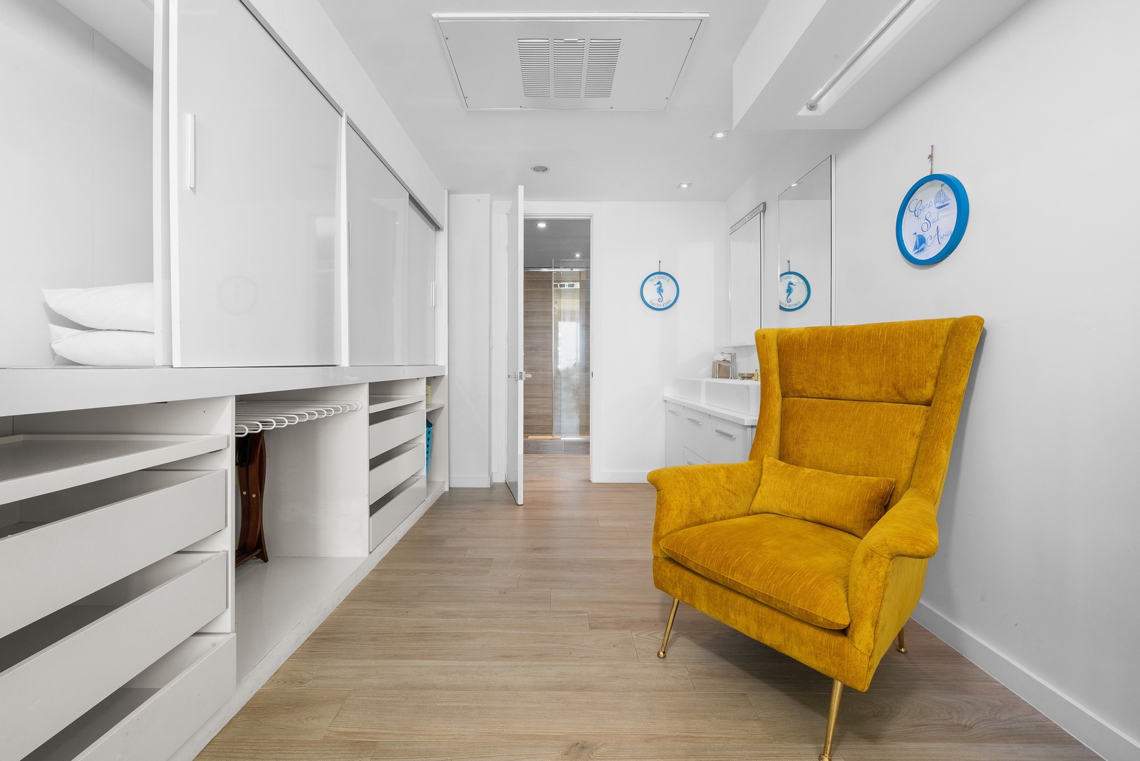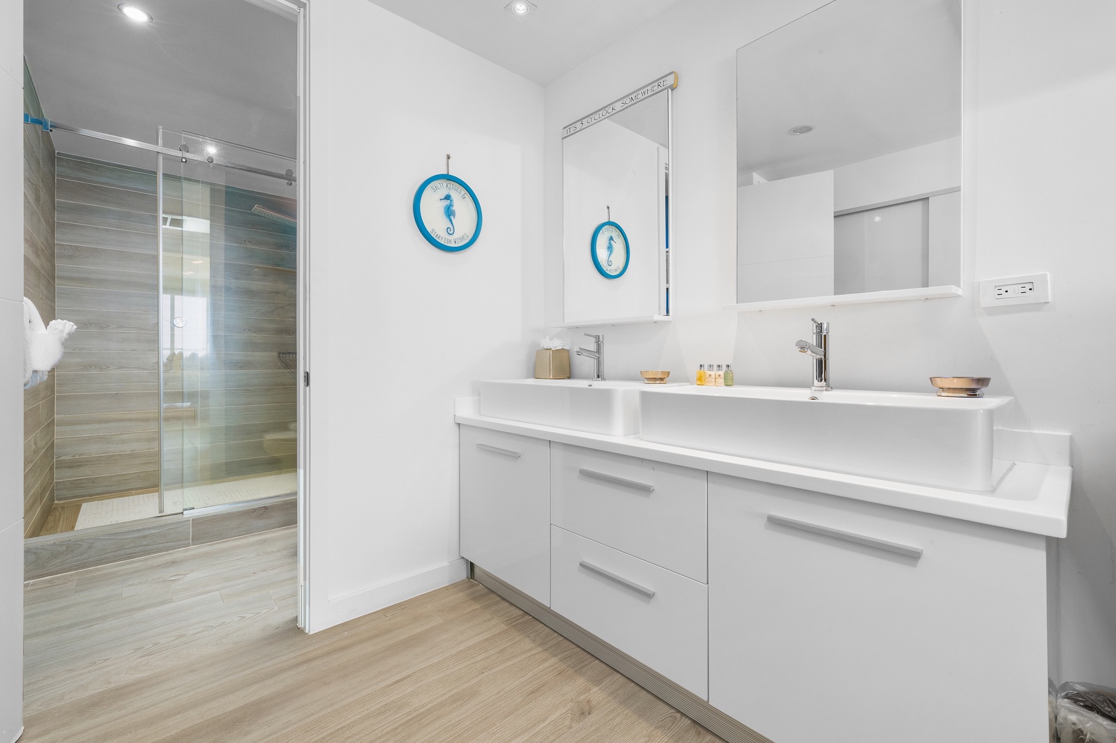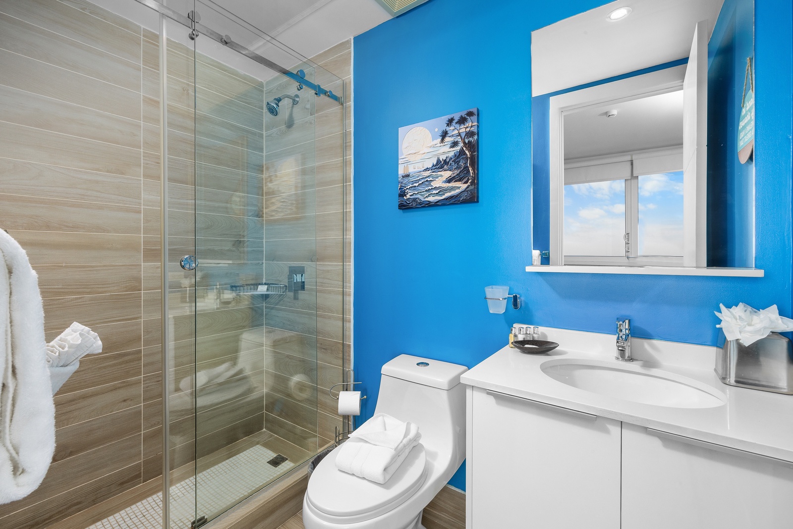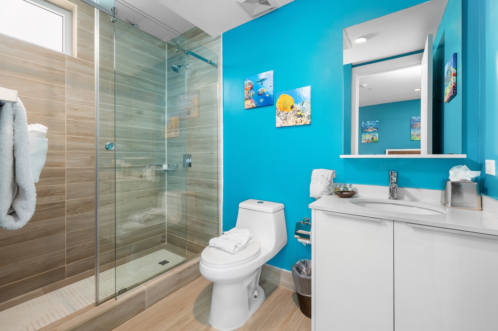 • Each bathroom has their own white towels and blue beach towels in the vanity.