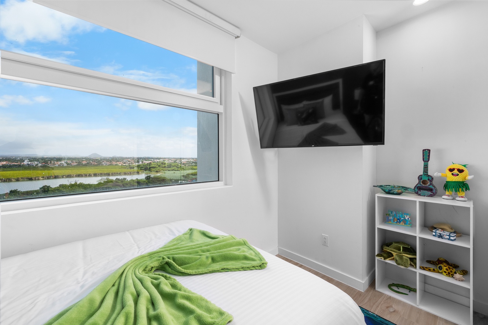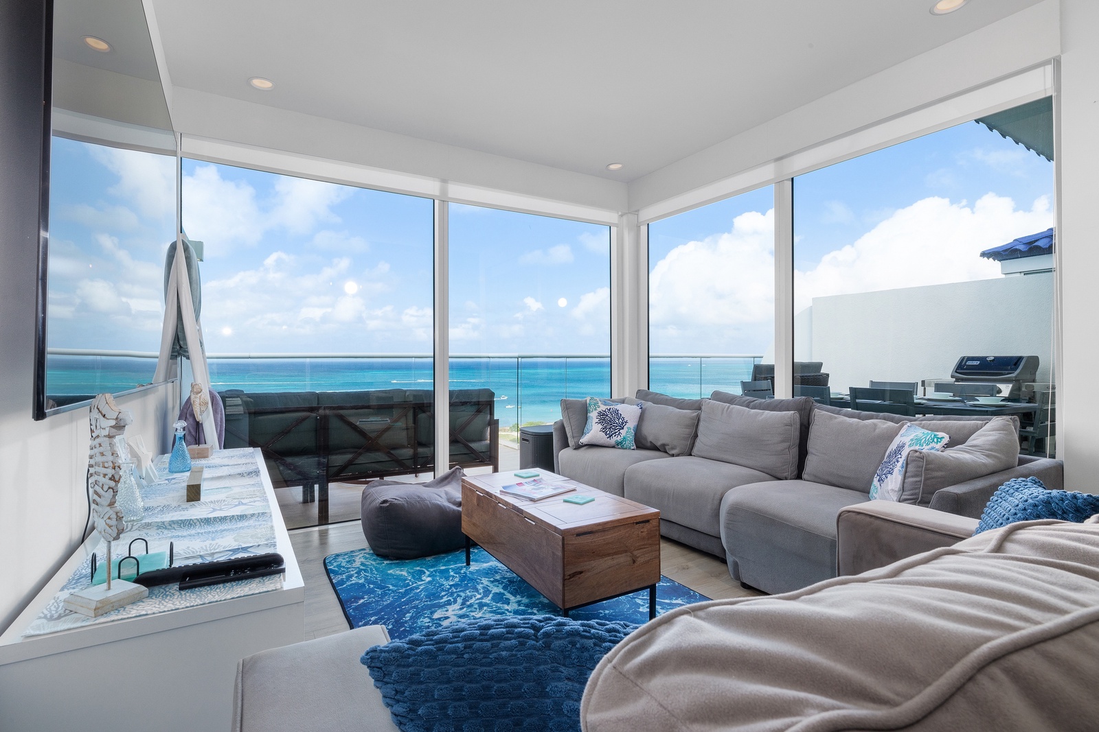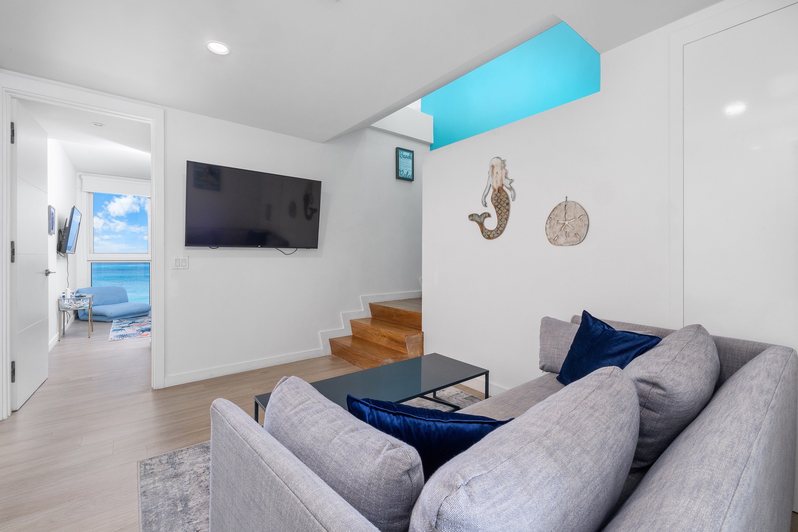 Lower level features three bedrooms and small tv- room. Each bedroom with its own bathroom. Master bedroom features a king-size bed, a relaxing chair, long and open closet, nice master bathroom and a balcony to view the ocean and feel its fresh breeze. Second bedroom also features view to the ocean and a king-size bed. Third bedroom with two nice double-size beds has a view to the Bubali Bird Sanctuary. Small TV room in lower level for kids to chill and play while adults relax at the terrace on the upper level.