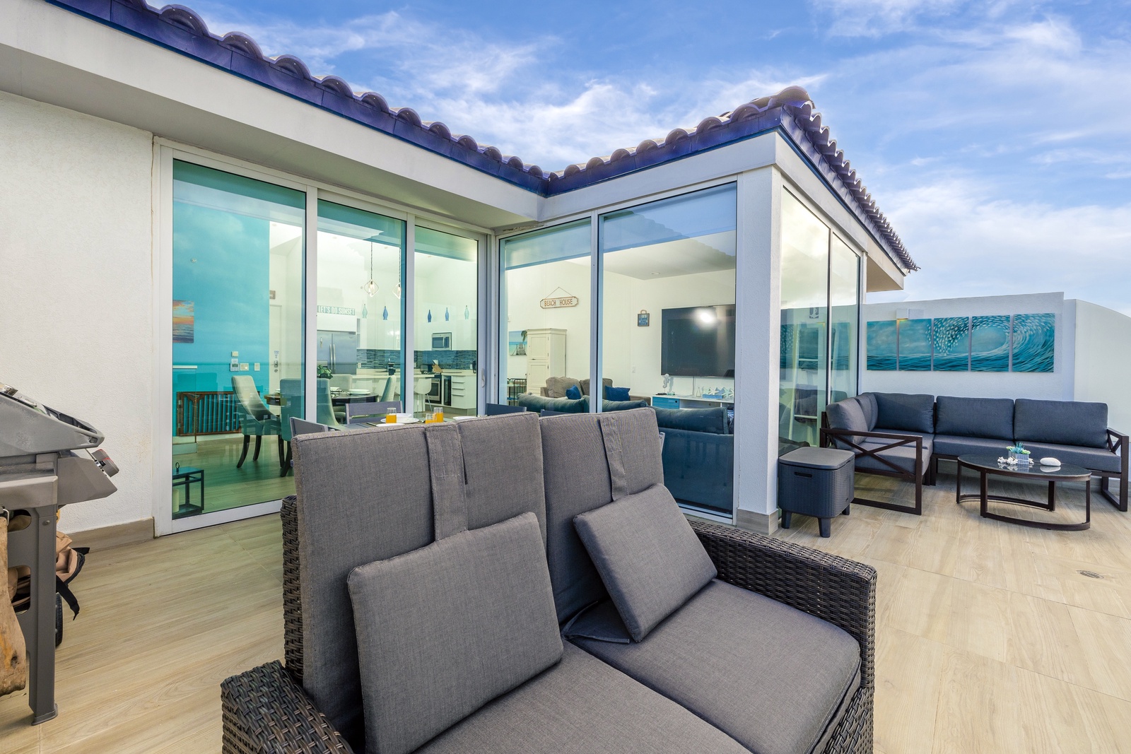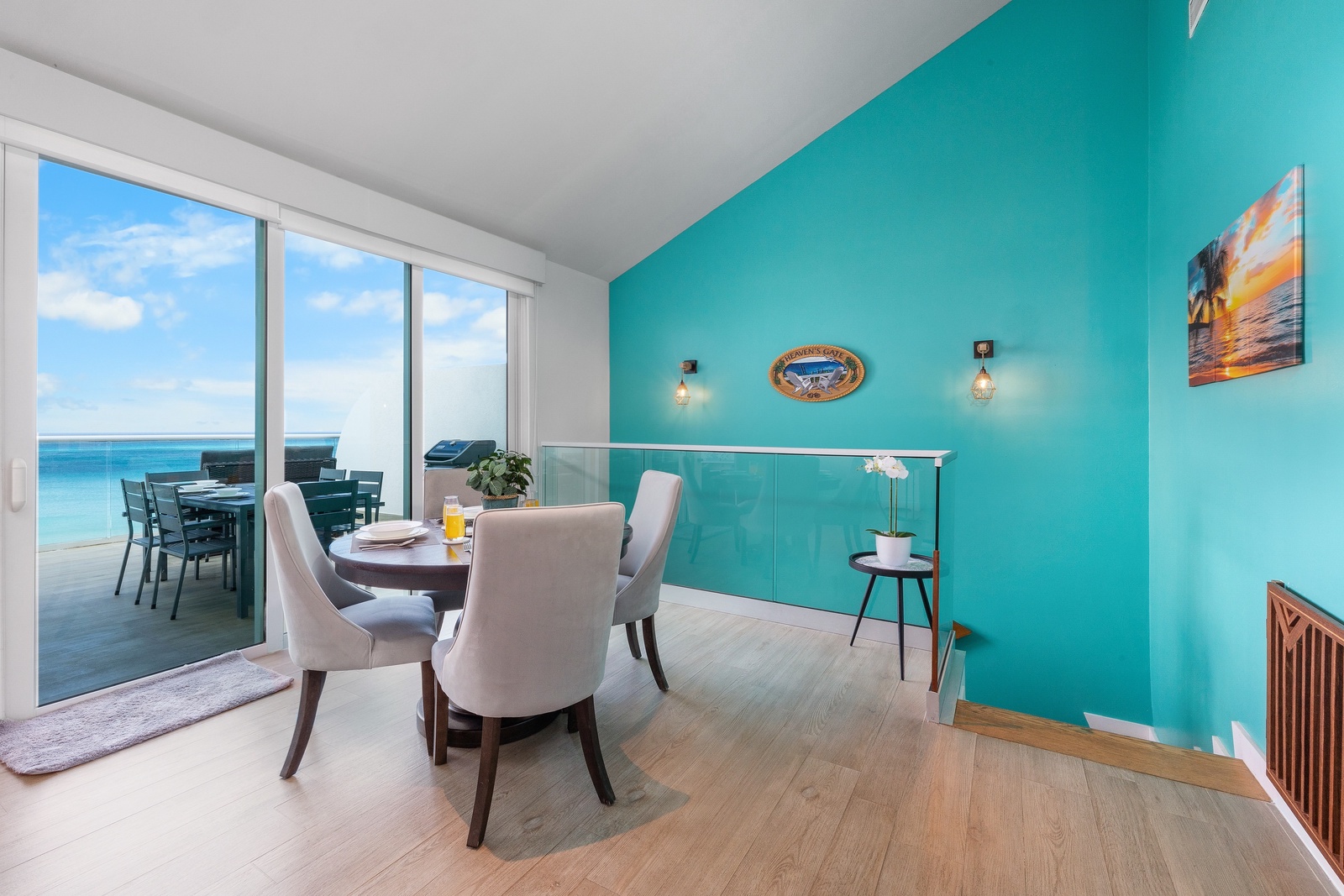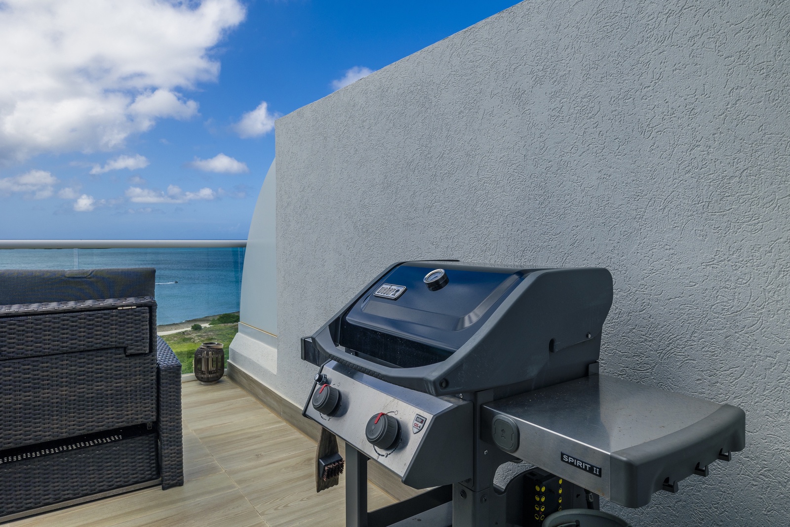 Lower level features three bedrooms and small tv- room. Each bedroom with its own bathroom. Master bedroom features a king-size bed, a relaxing chair, long and open closet, nice master bathroom and a balcony to view the ocean and feel its fresh breeze. Second bedroom also features view to the ocean and a king-size bed. Third bedroom with two nice double-size beds has a view to the Bubali Bird Sanctuary. Small TV room in lower level for kids to chill and play while adults relax at the terrace on the upper level.