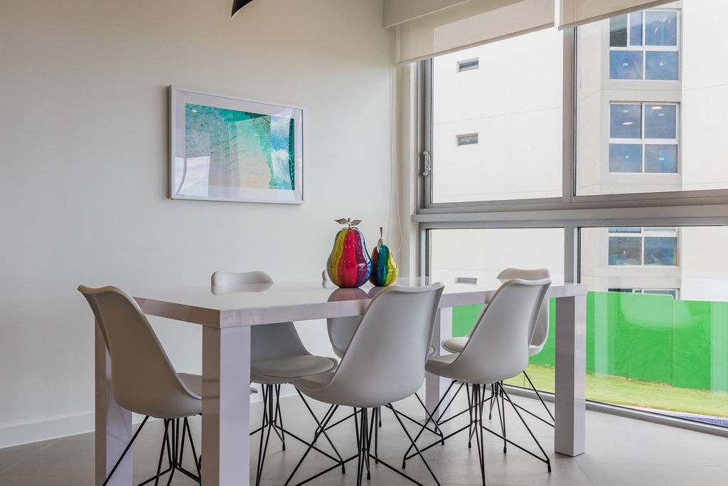 Unleash your inner chef in the sleek, fully equipped kitchen adorned with white quartz countertops and glossy custom cabinets. Stainless steel appliances—including a side-by-side fridge with ice maker, convection oven, microwave, four-burner electric stove, and dishwasher—are ready for your culinary creations. Begin your mornings at the stylish breakfast island bar for four or gather around the dining table that comfortably seats six. The open layout ensures you're always part of the vibrant culinary action.