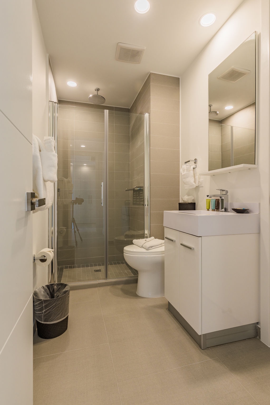 The second bedroom offers a cozy queen-size bed and an ensuite bathroom with a single vanity, walk-in shower, and ample cabinet space. Bedroom three features two twin-size beds, a walk-in shower, rain showerhead, and single vanity sink. Indulge in plush towels, premium toiletries, and a hairdryer. For added convenience, a utility room with a stackable washer and dryer is also available.