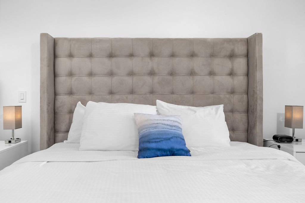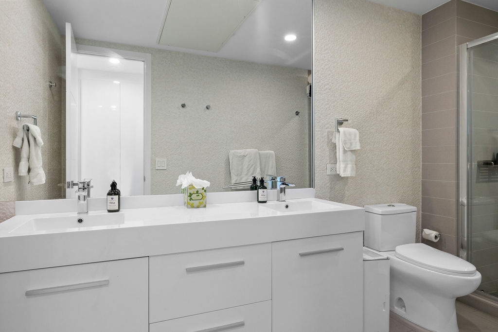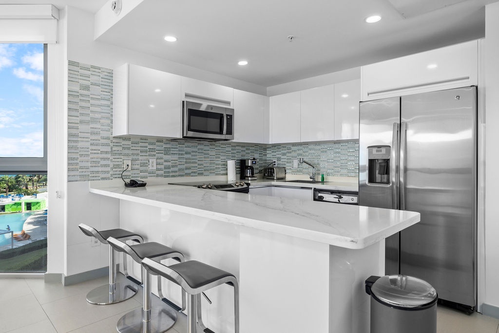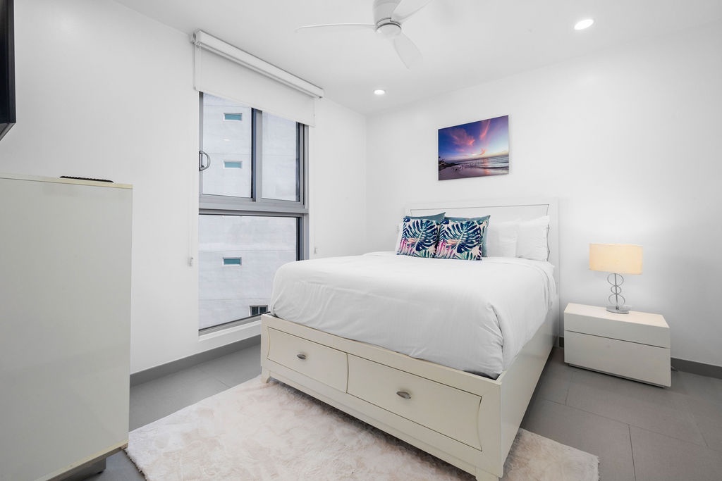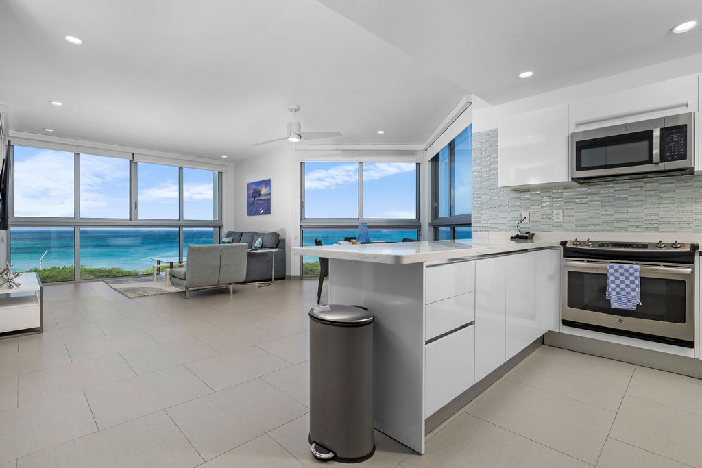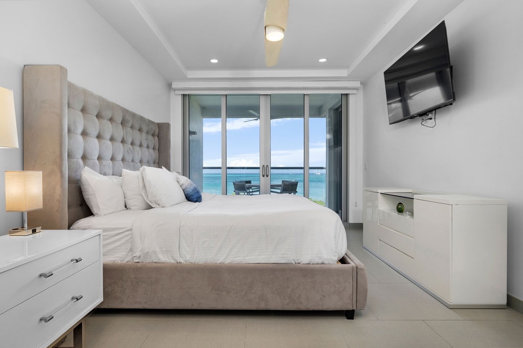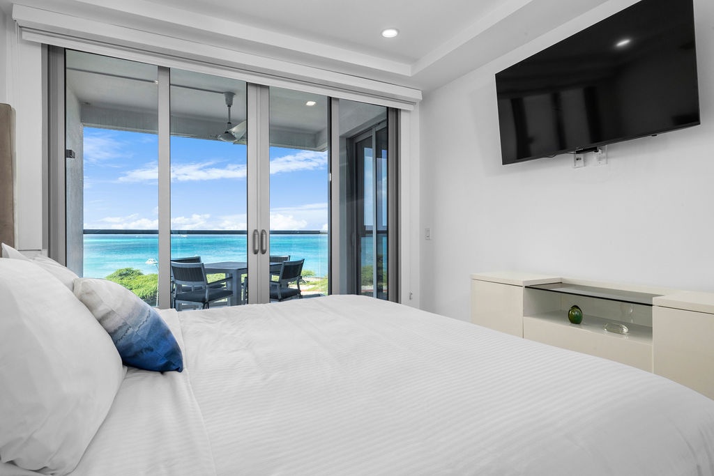 The air-conditioned suite features a king bed in the master bedroom, a queen bed in the second bedroom, and two full beds in the third bedroom, along with three bathrooms with walk-in showers. The open-concept kitchen, dining, and living area leads to a private balcony, where you can relax and take in the stunning ocean views. Free Wi-Fi and Smart TVs in all rooms ensure entertainment and connectivity throughout your stay.