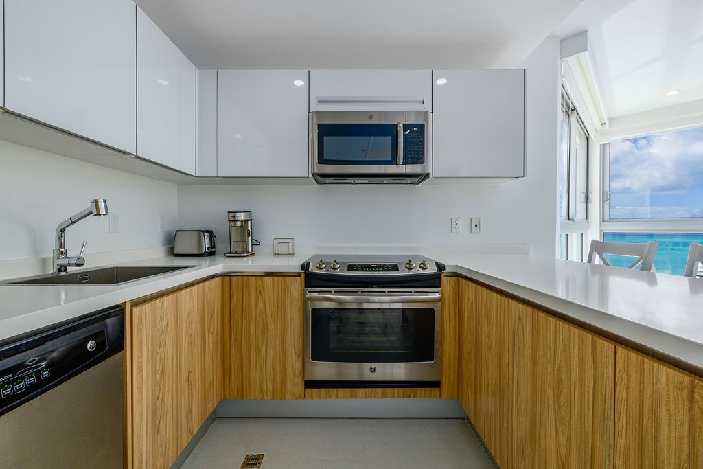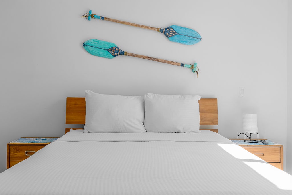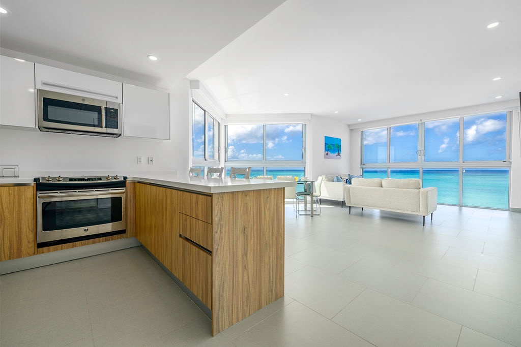 As you enter, the open-concept living and dining area, flooded with natural light, opens up to a private patio with direct access to the pristine beach. Imagine sipping your morning coffee while watching the waves crash against the shore. The fully equipped kitchen, complete with modern appliances, cooking essentials, and a breakfast bar, is perfect for preparing delicious meals during your stay.