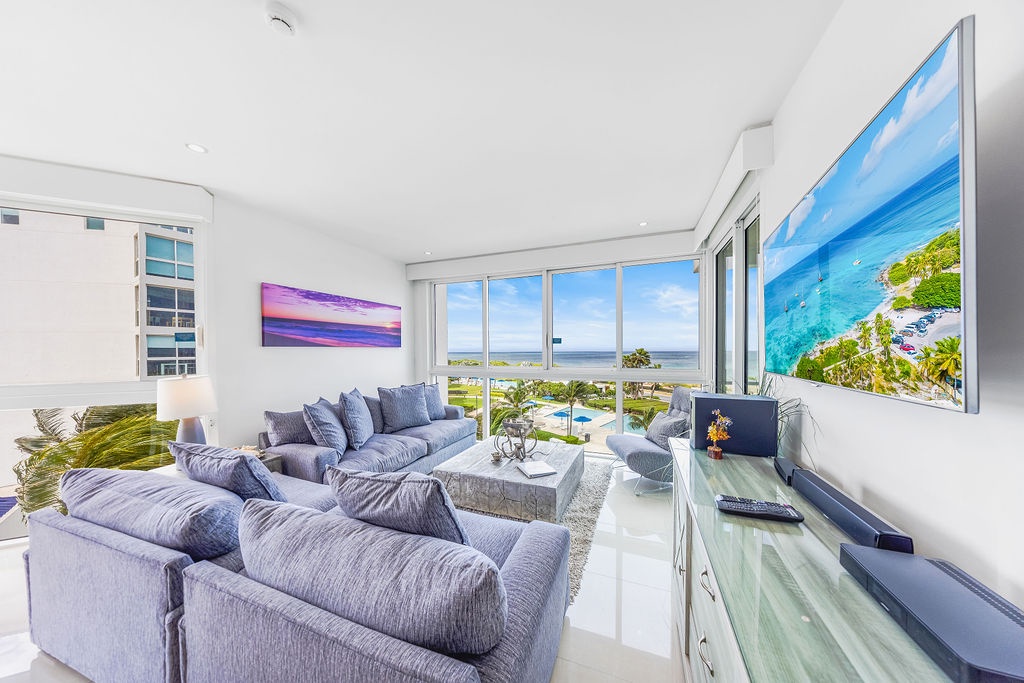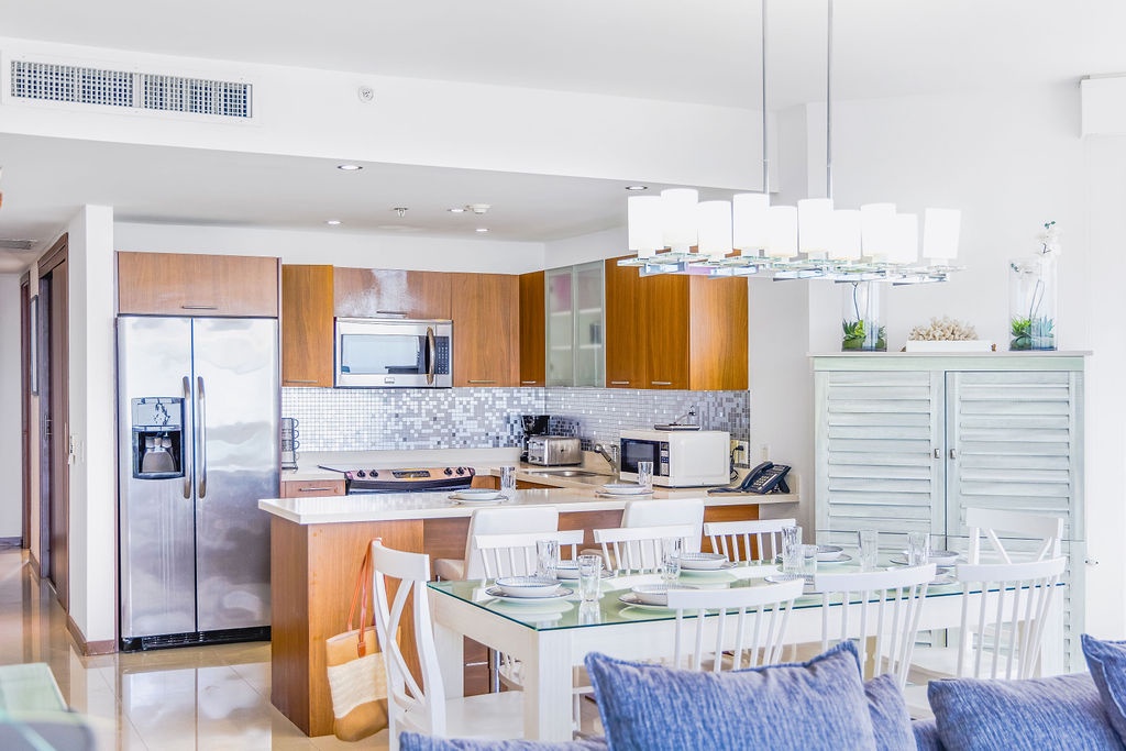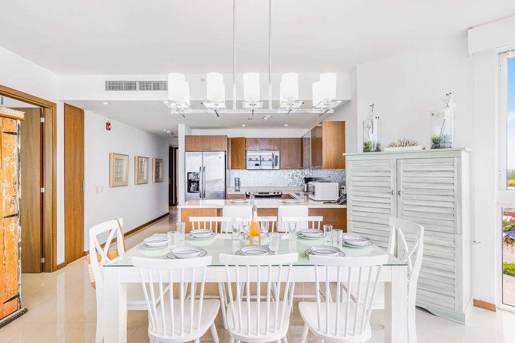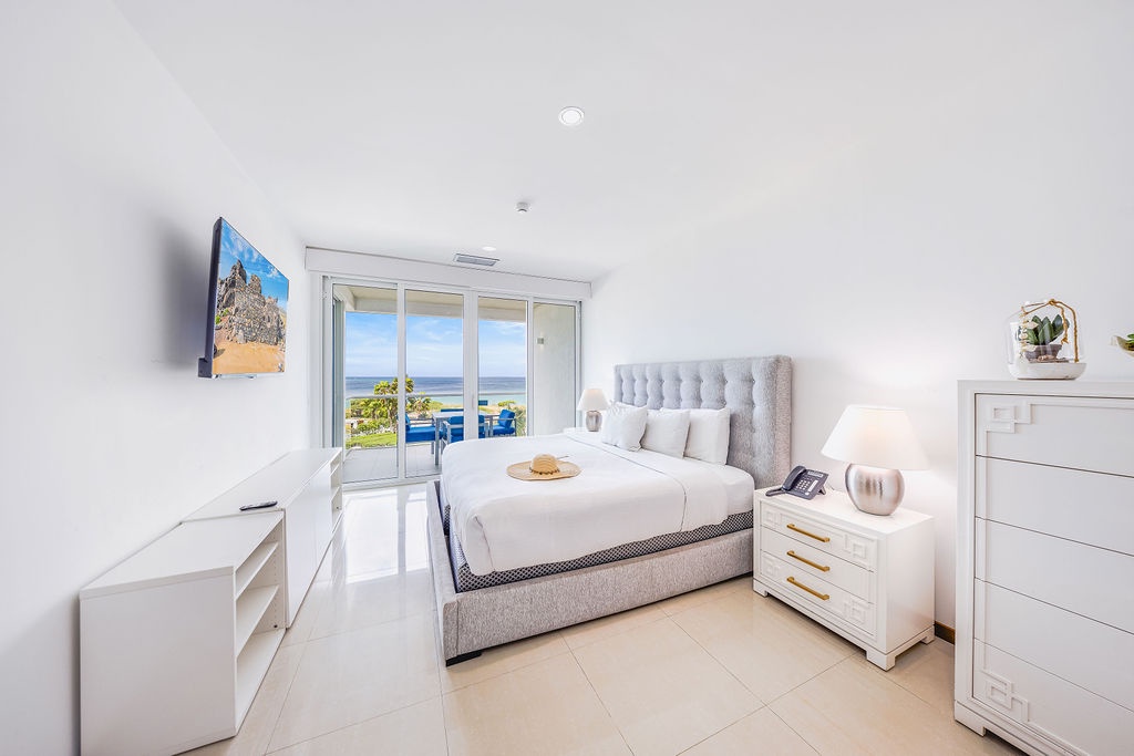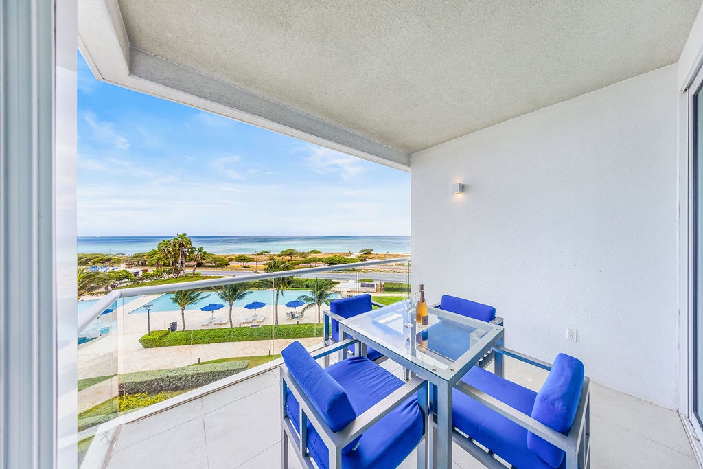 The air-conditioned three-bedroom suite offers a spectacular ocean view. It includes one king-size bed, four full-size beds, and three bathrooms with showers. The condo features a fully equipped kitchen, a dining area, and a living area, all with ocean views. Step onto the balcony through sliding doors to gaze out at the Caribbean, and enjoy the same breathtaking view from the master bedroom as well. This condo provides beach chairs for your convenience, allowing you to explore and enjoy the various beaches around Aruba.