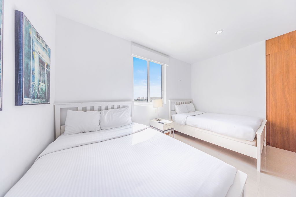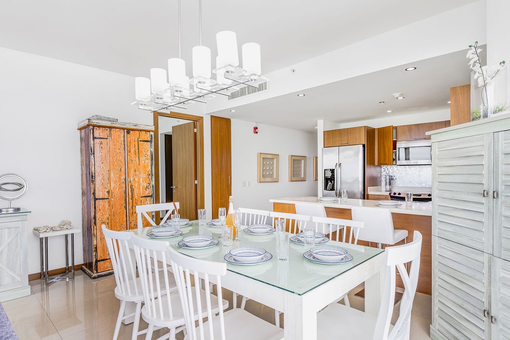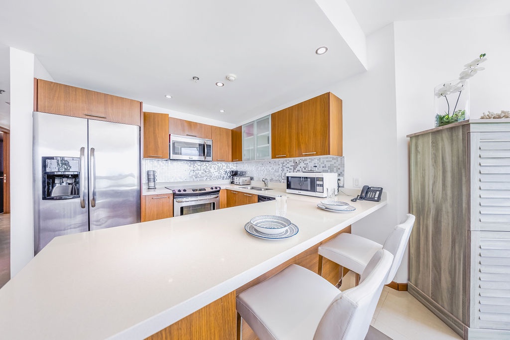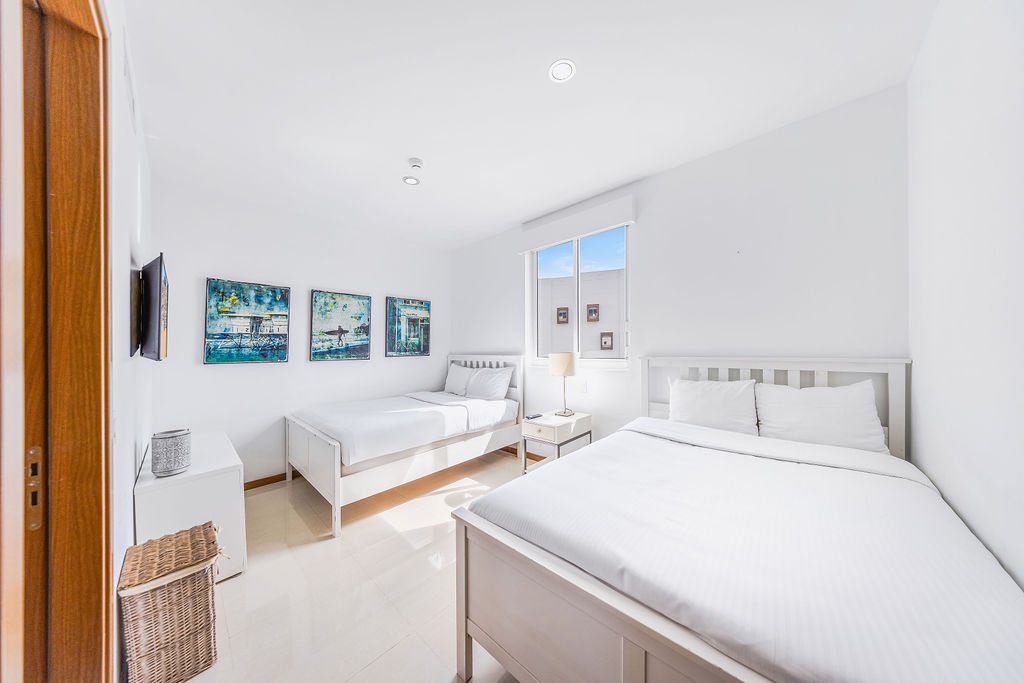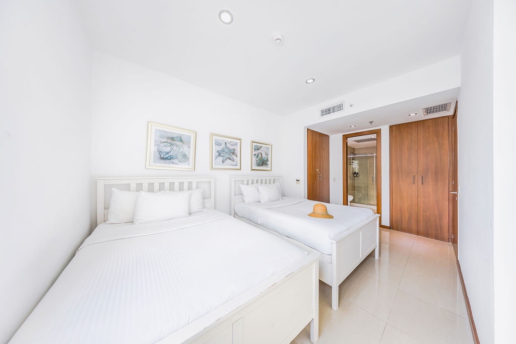 The air-conditioned three-bedroom suite offers a spectacular ocean view. It includes one king-size bed, four full-size beds, and three bathrooms with showers. The condo features a fully equipped kitchen, a dining area, and a living area, all with ocean views. Step onto the balcony through sliding doors to gaze out at the Caribbean, and enjoy the same breathtaking view from the master bedroom as well. This condo provides beach chairs for your convenience, allowing you to explore and enjoy the various beaches around Aruba.