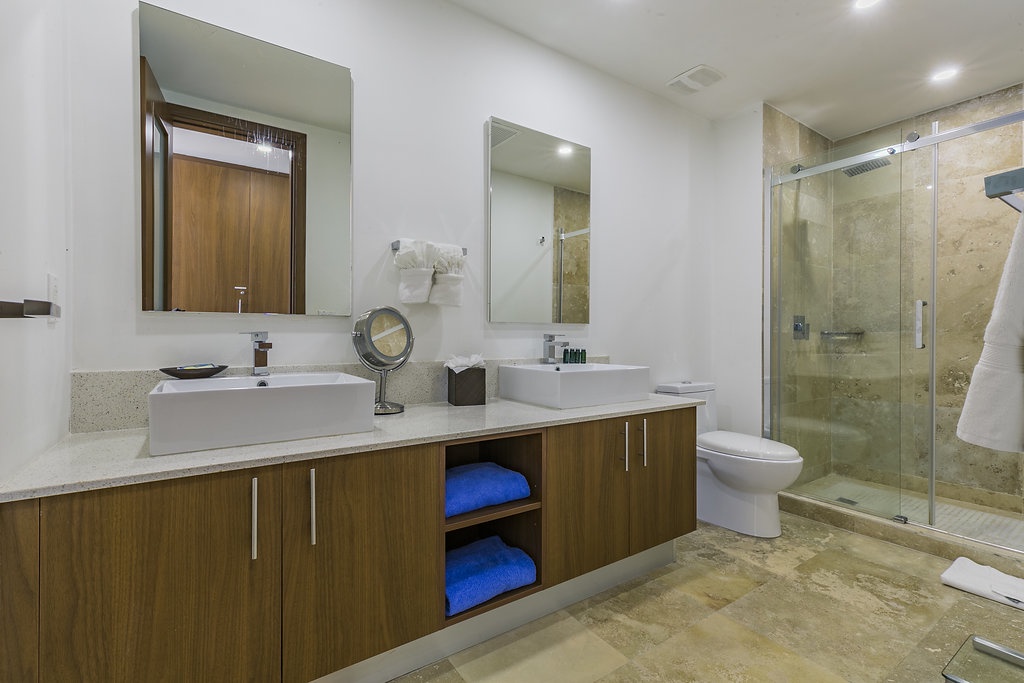 • Each bathroom has their own white towels and blue beach towels in the vanity.