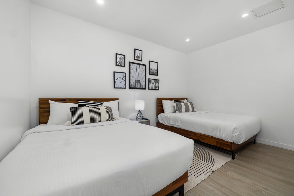 Two queen beds, HD TV, spacious closets, and access to the full main-floor bathroom.