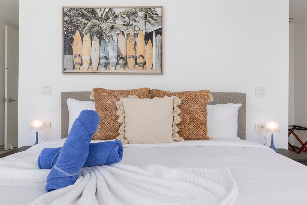Each of the three bedrooms has its own en-suite bathroom, providing comfort and privacy for everyone. The master and second bedrooms feature king-size beds, while the third bedroom has a queen. There's also a convenient half-bath for guests, and a washer and dryer in the unit to make your stay even easier.