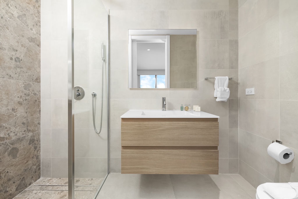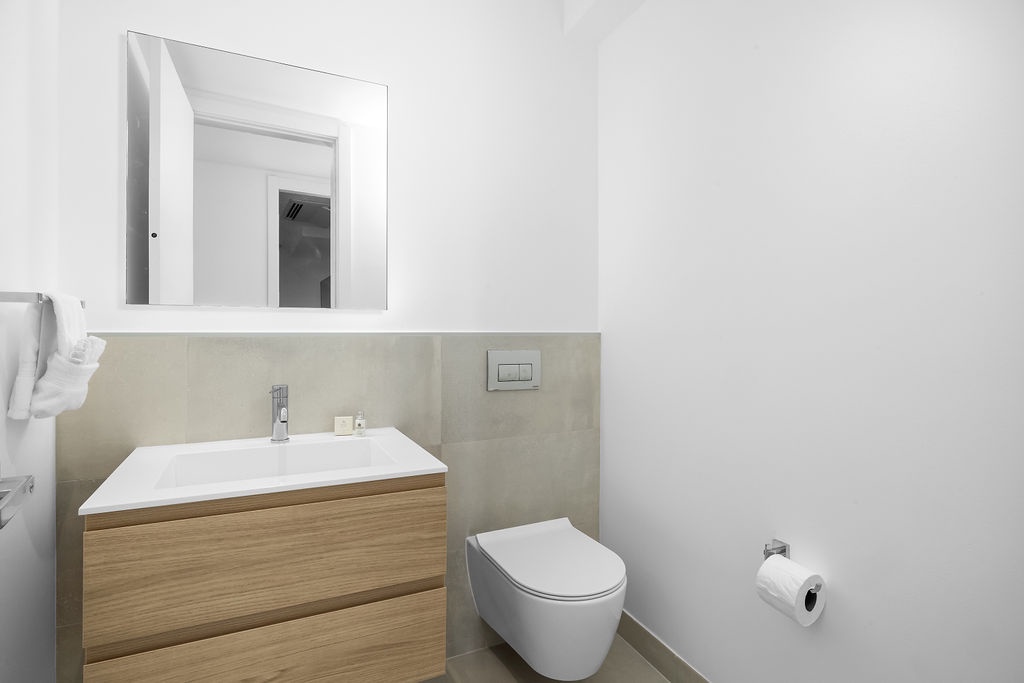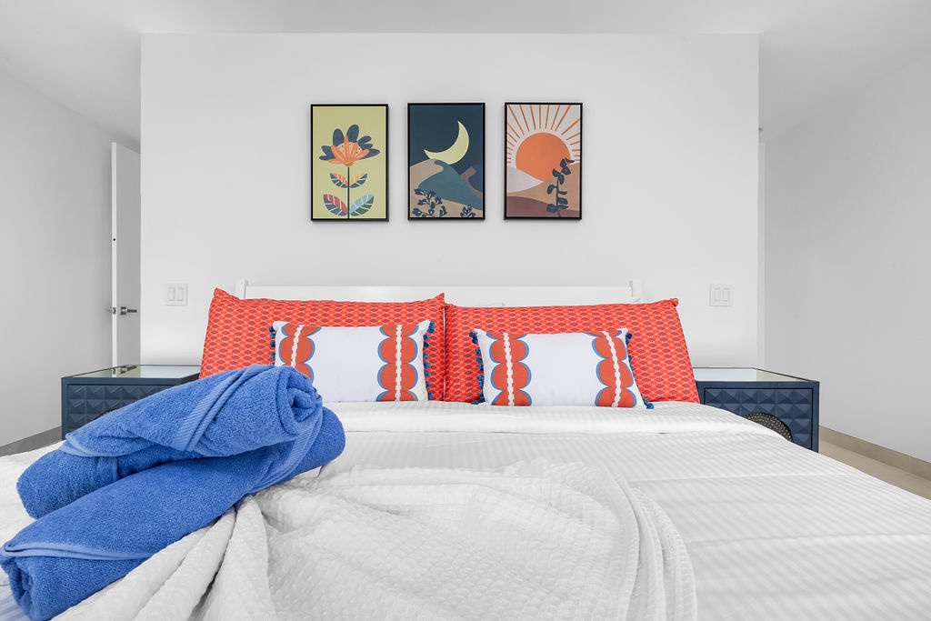 The master bedroom has a king-size bed and an en-suite bathroom with a walk-in shower. The second bedroom also has a king-size bed and its own private bathroom, while the third bedroom offers a queen bed with an en-suite as well. A half-bath is available in the hallway for added convenience.