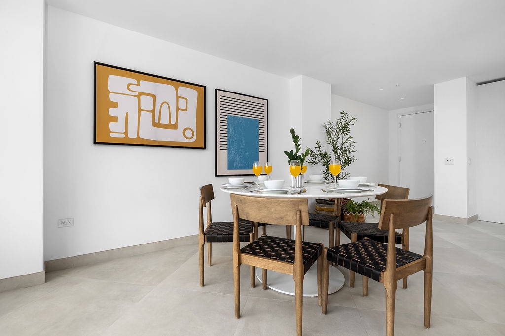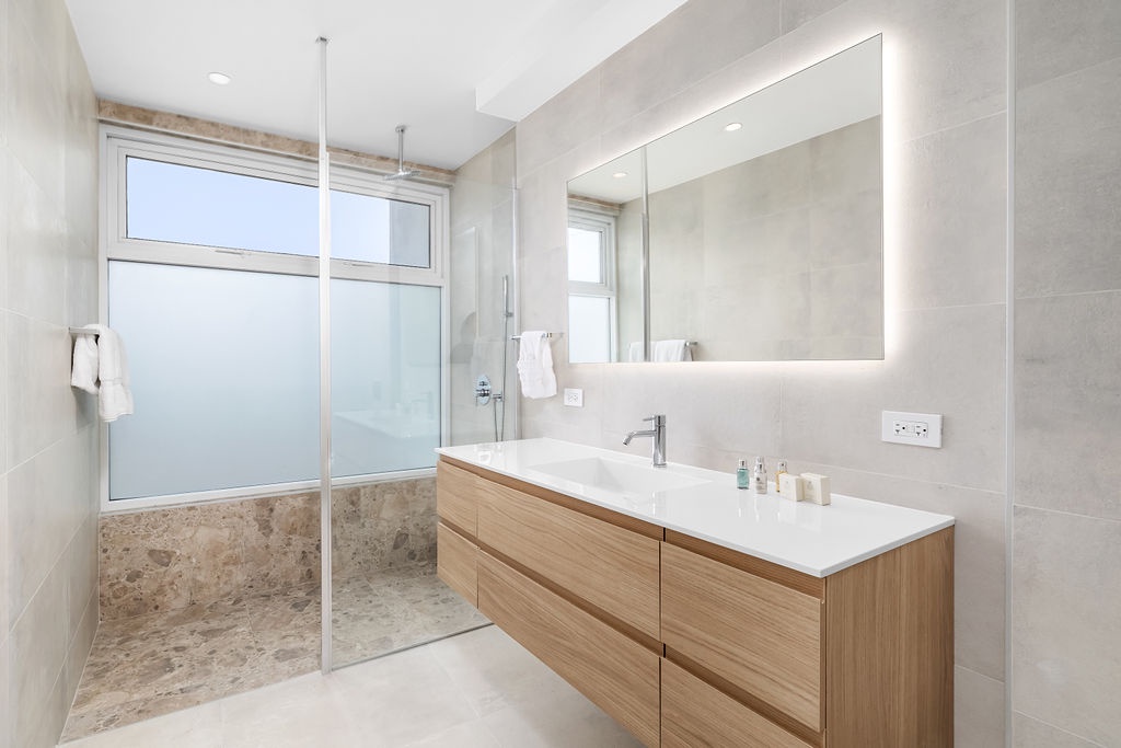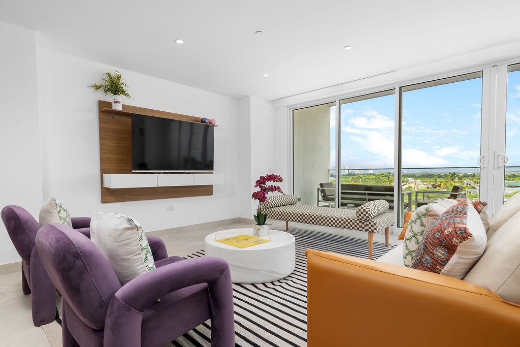 The open living area is bright and inviting, with large glass doors that let in natural light and showcase the ocean in the distance. A comfortable seating area with a Smart TV makes it easy to unwind, while the dining space is perfect for meals with a view. The fully equipped kitchen features quartz countertops and modern appliances, making cooking simple and convenient.