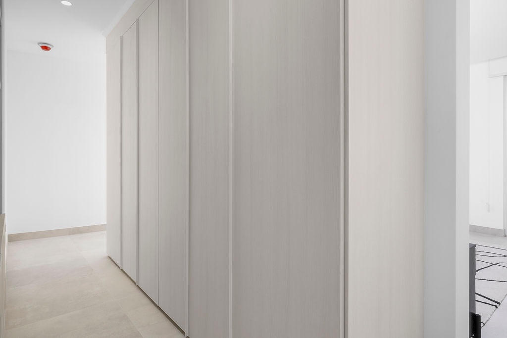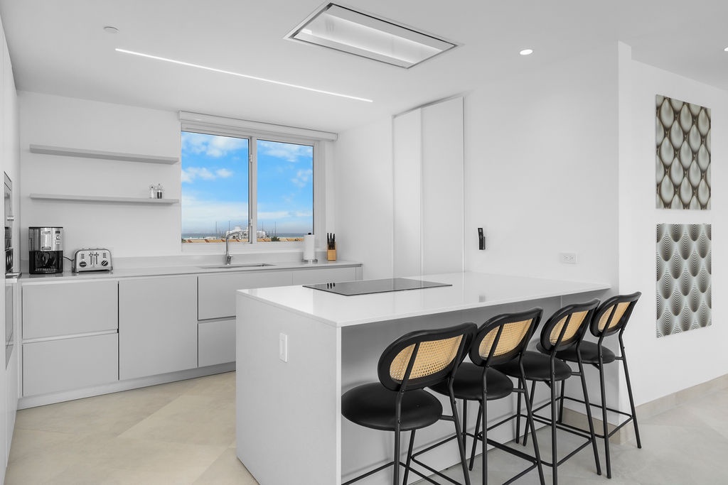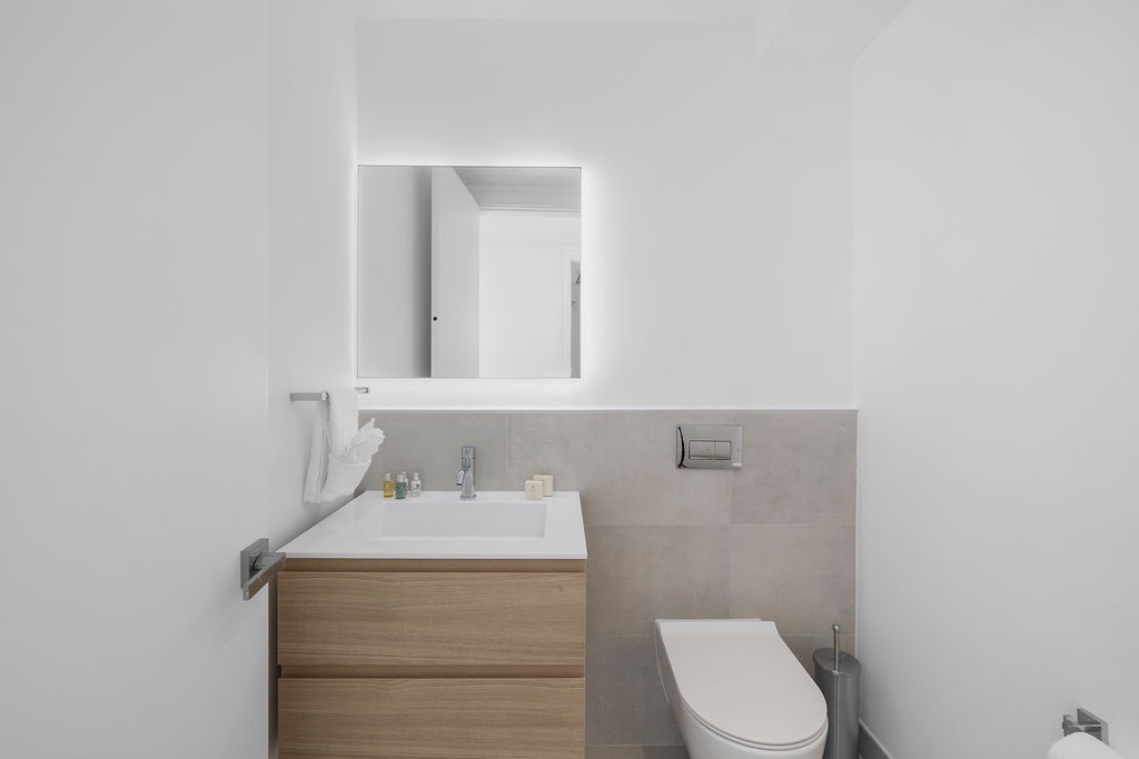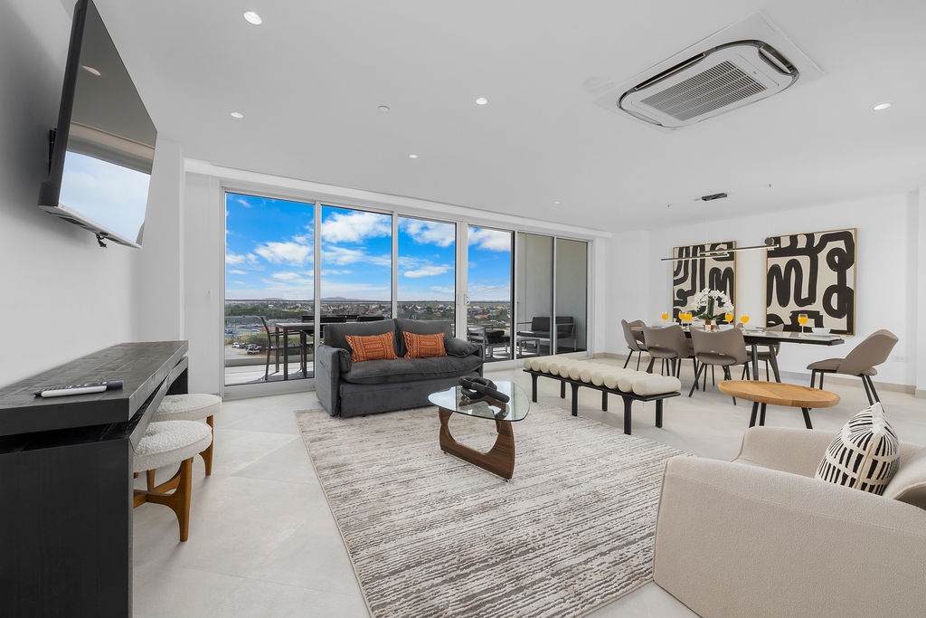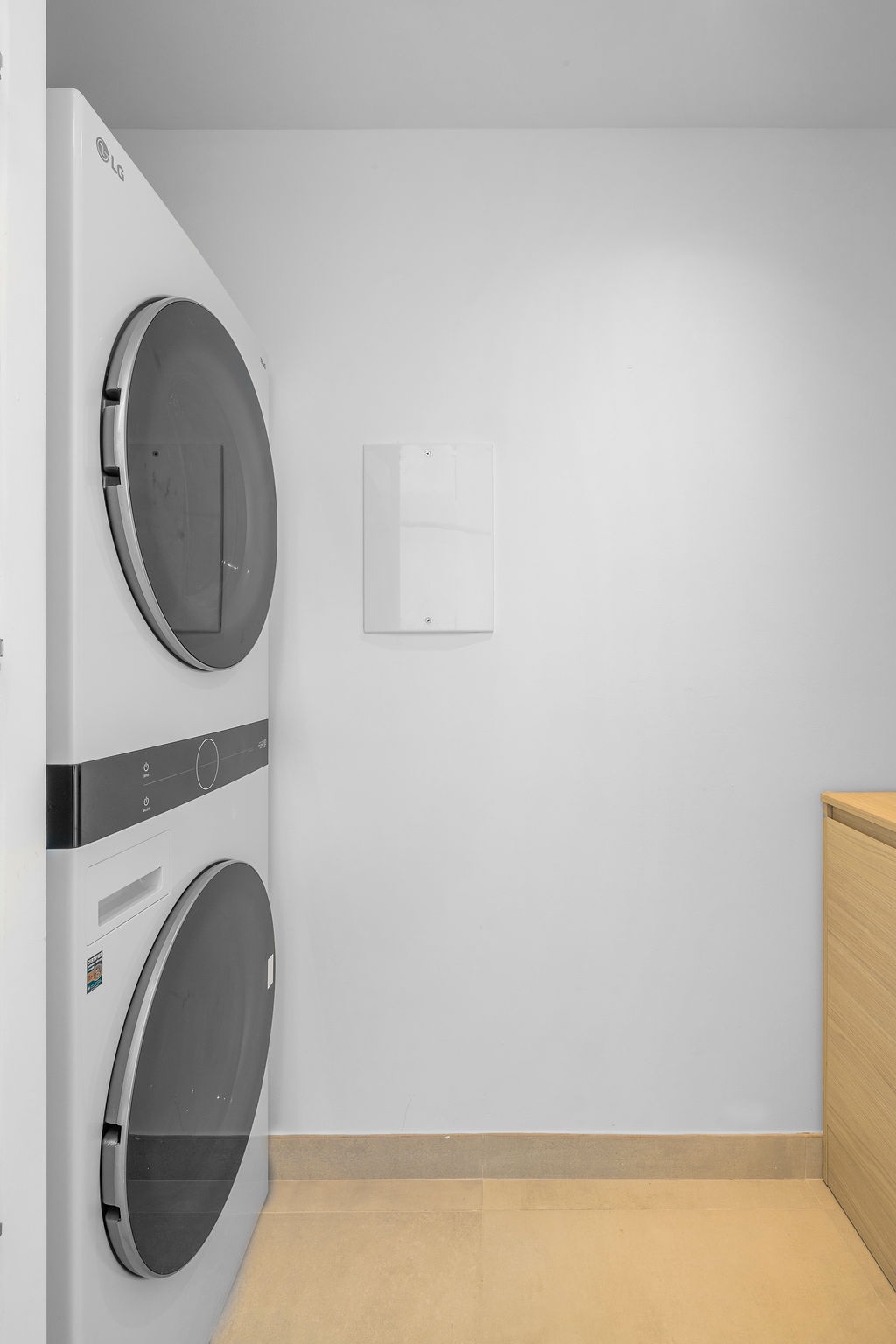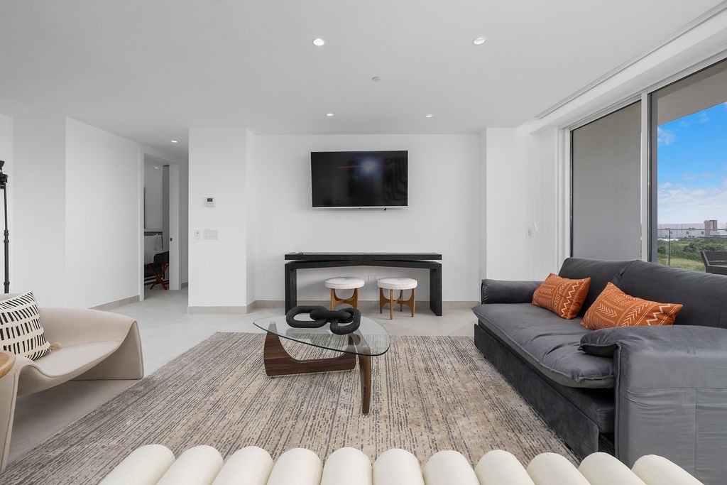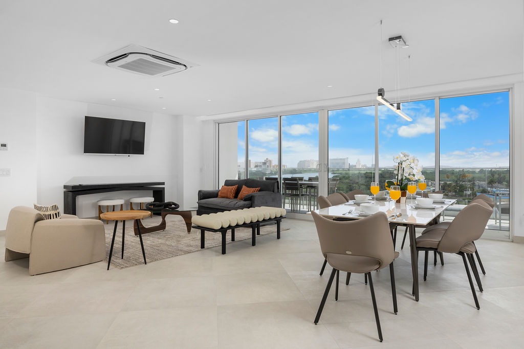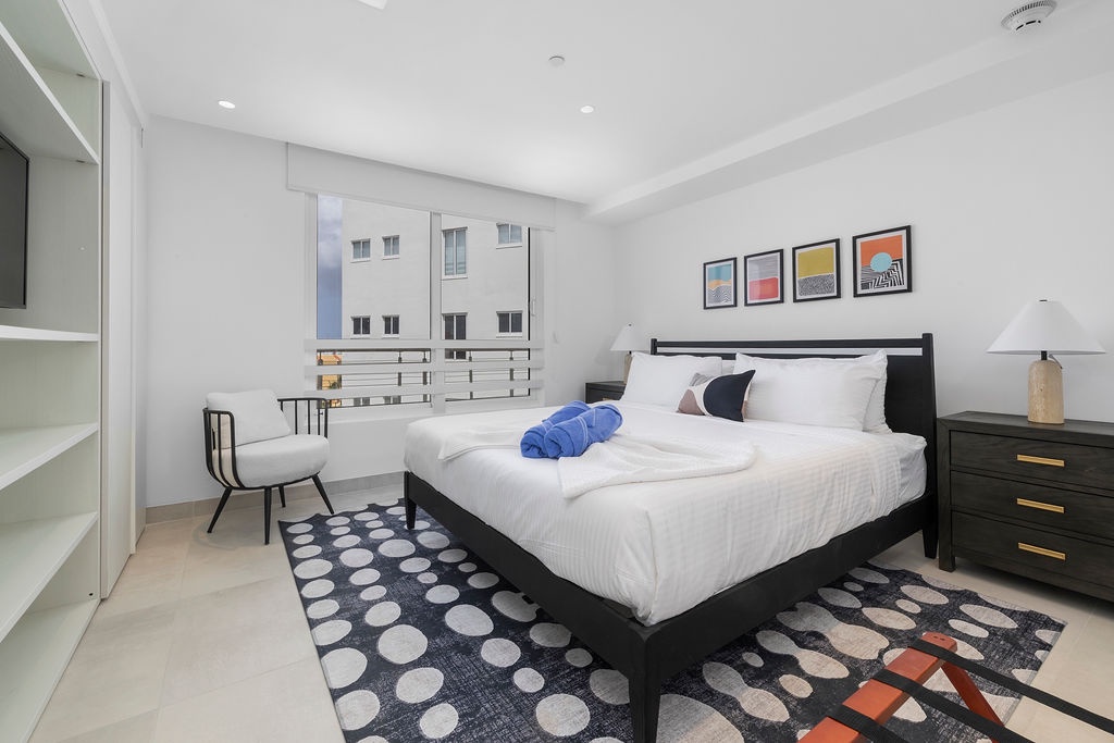 As you enter, you're welcomed by a spacious, light-filled living area where floor-to-ceiling glass doors open onto your private balcony—a perfect spot for morning coffee or evening cocktails. The open-concept layout connects the living room, dining area, and fully equipped modern kitchen, making it easy to gather, cook, and enjoy meals together. The kitchen features quartz countertops, high-end appliances, and all the essentials, whether you're preparing a quick breakfast or a full dinner.