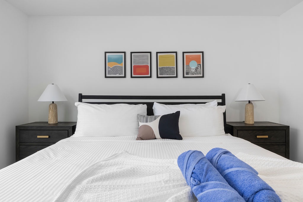 Each of the three bedrooms includes its own en-suite bathroom, offering comfort and privacy for every guest. The master and second bedrooms feature king-size beds, while the third bedroom is furnished with a queen-size bed. A convenient half-bath is located off the hallway, and there’s a washer and dryer in the unit for added ease during your stay.