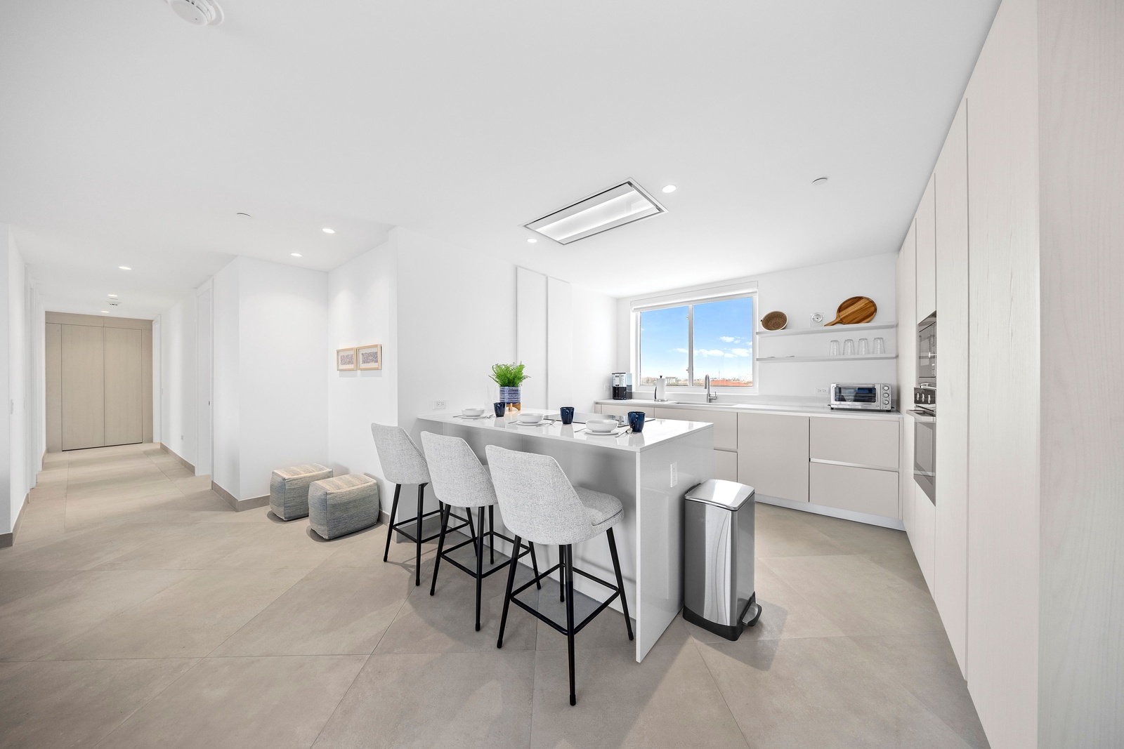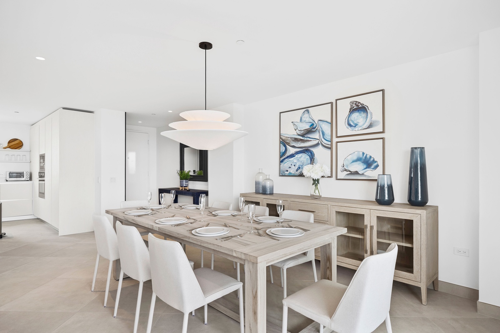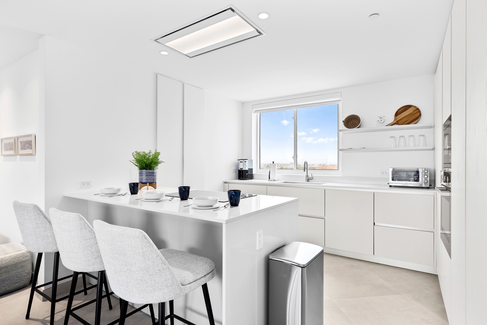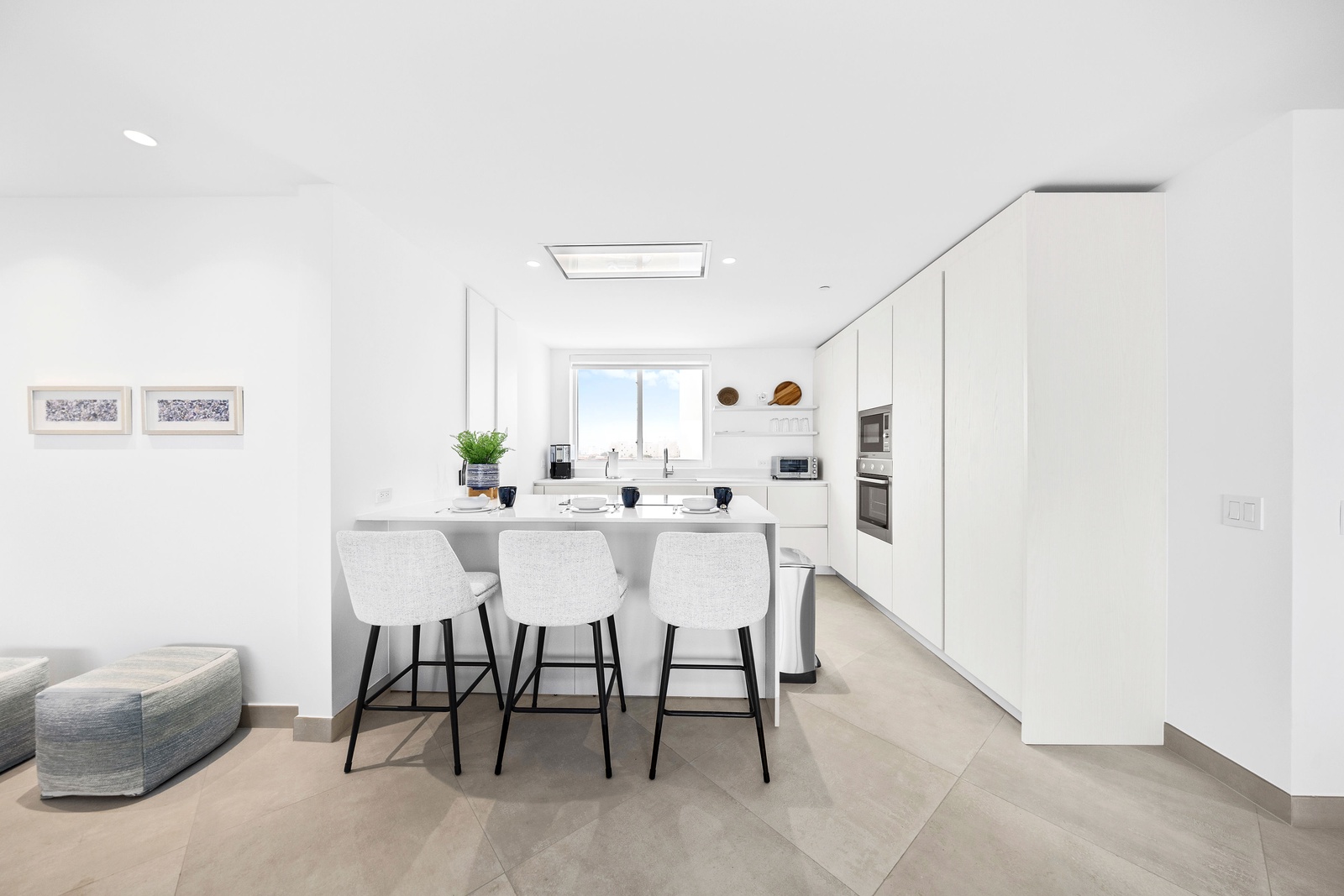 The sleek, fully equipped kitchen combines style and functionality, featuring quartz countertops, custom cabinetry, and high-end stainless steel appliances. Whether you’re preparing a casual breakfast or hosting a dinner, the open-concept layout keeps you connected to the dining and living spaces. Start your day at the chic kitchen island or step outside to savor your meal with the sparkling sea as your backdrop. The kitchen also includes extra small appliances like Ice maker, Electric griddle, Nutribullet blender, Waffle iron, Crockpot and Toaster oven making this kitchen more than ready to make you feel like home, but better.