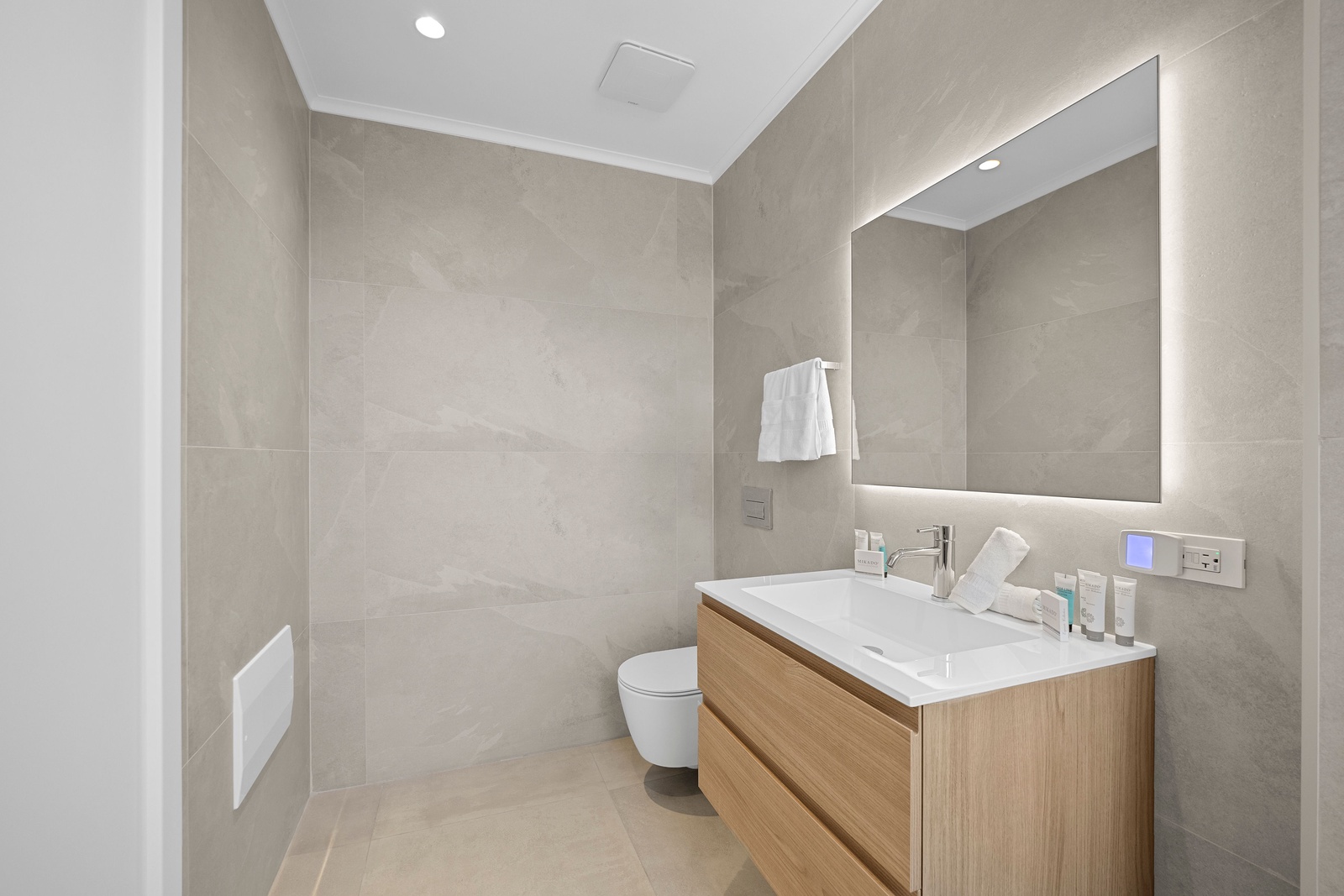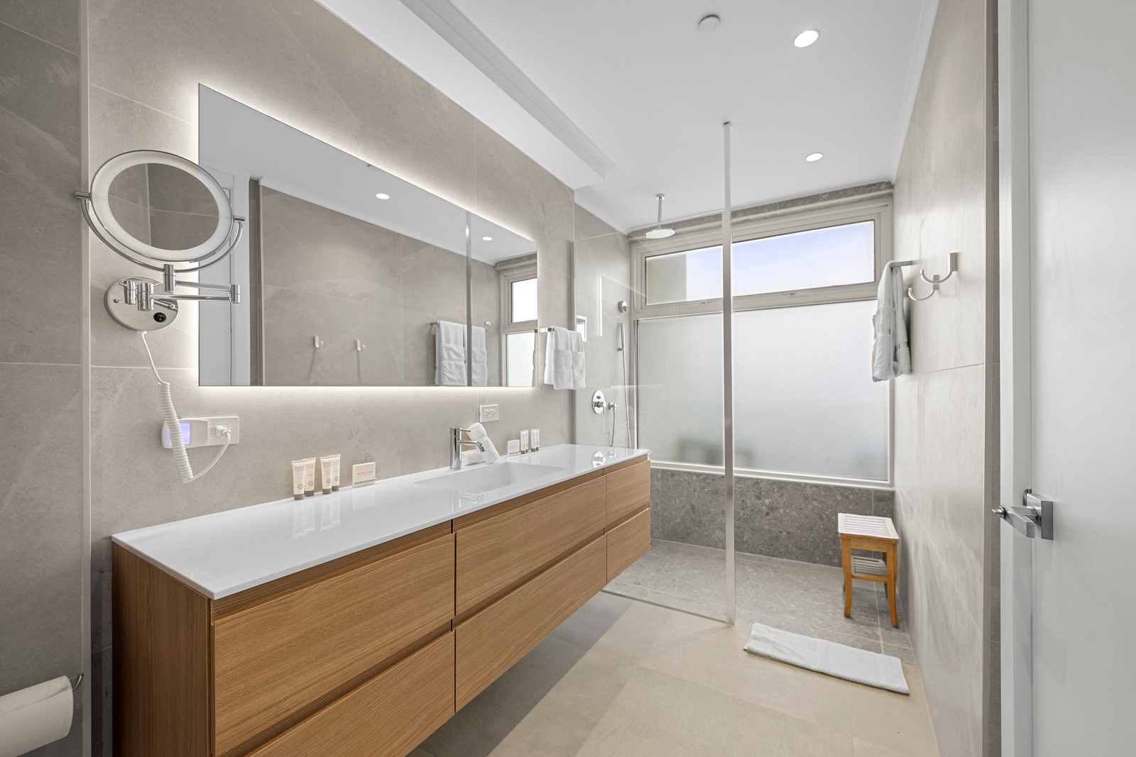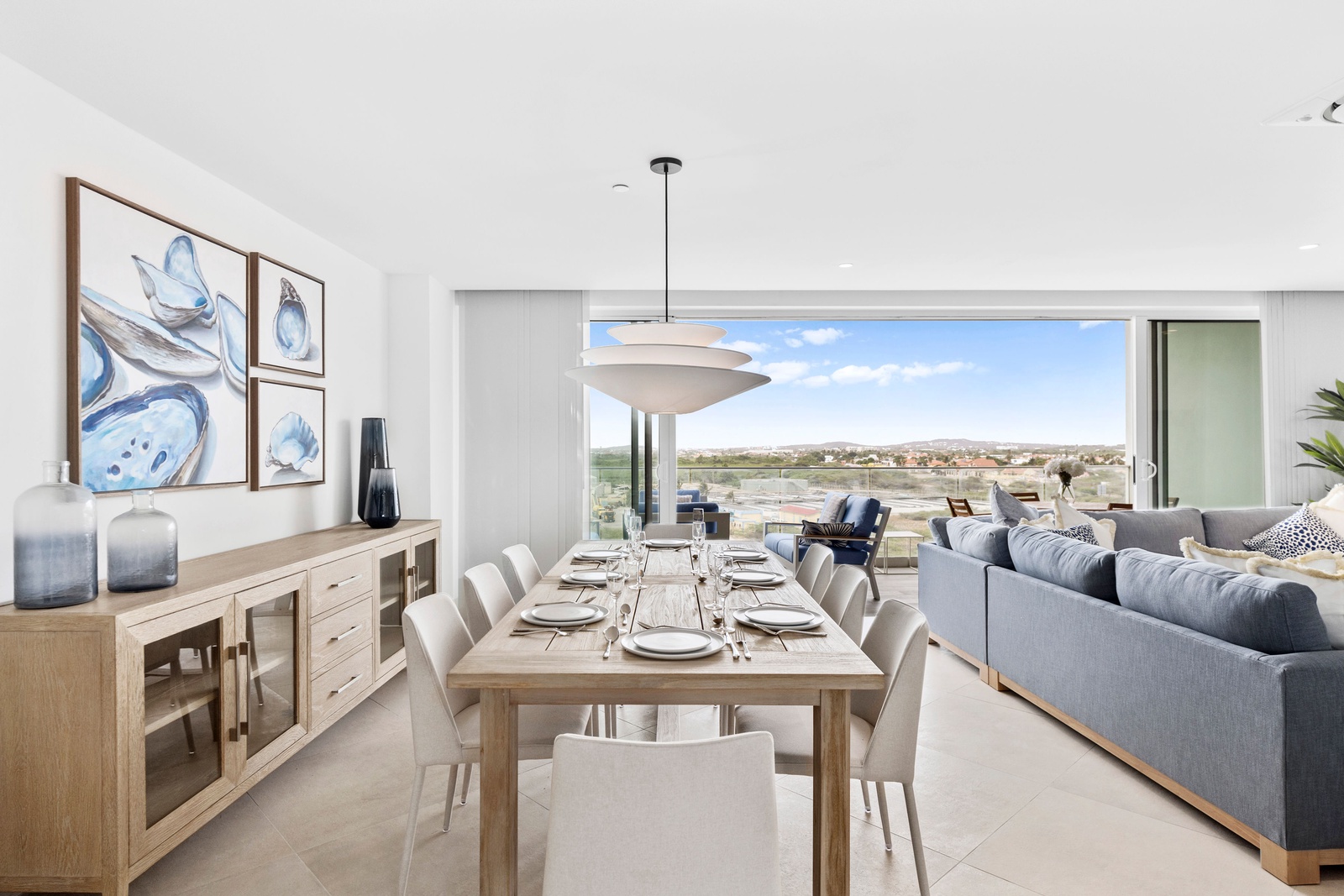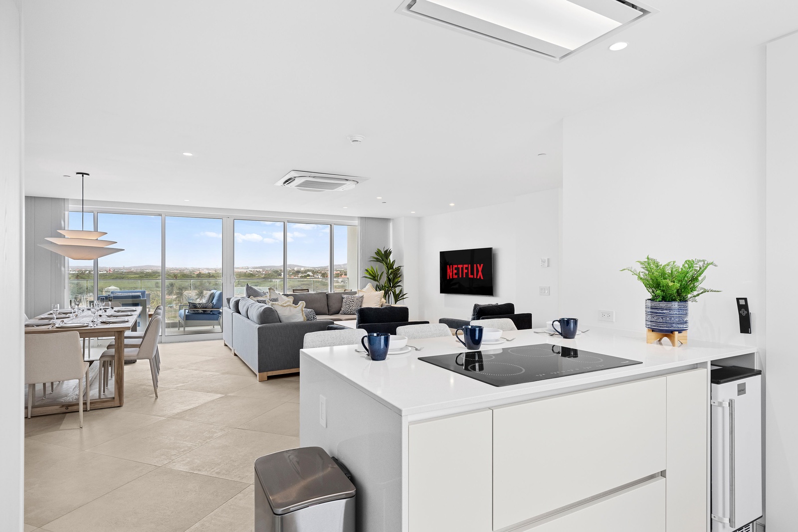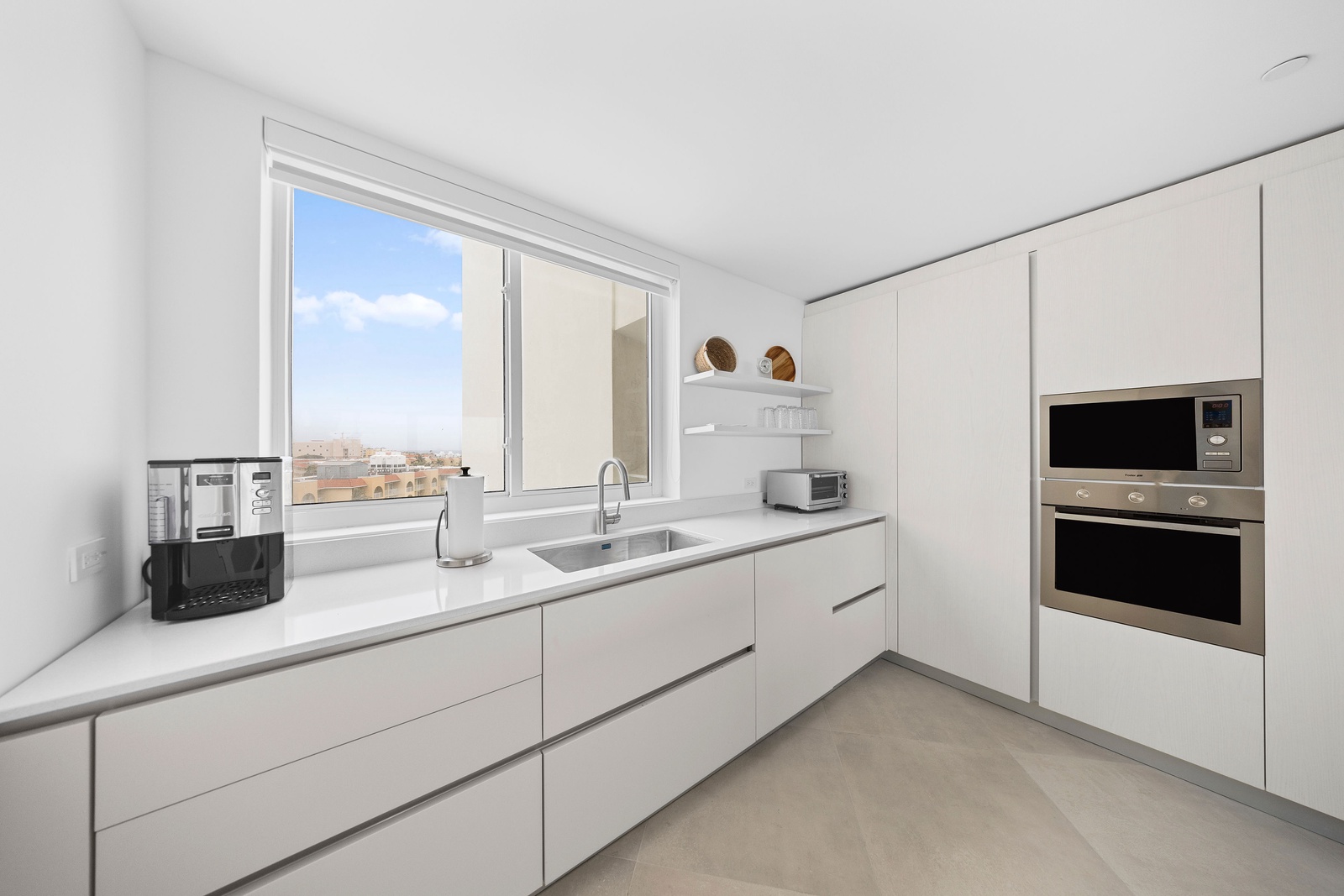 The sleek, fully equipped kitchen combines style and functionality, featuring quartz countertops, custom cabinetry, and high-end stainless steel appliances. Whether you’re preparing a casual breakfast or hosting a dinner, the open-concept layout keeps you connected to the dining and living spaces. Start your day at the chic kitchen island or step outside to savor your meal with the sparkling sea as your backdrop. The kitchen also includes extra small appliances like Ice maker, Electric griddle, Nutribullet blender, Waffle iron, Crockpot and Toaster oven making this kitchen more than ready to make you feel like home, but better.