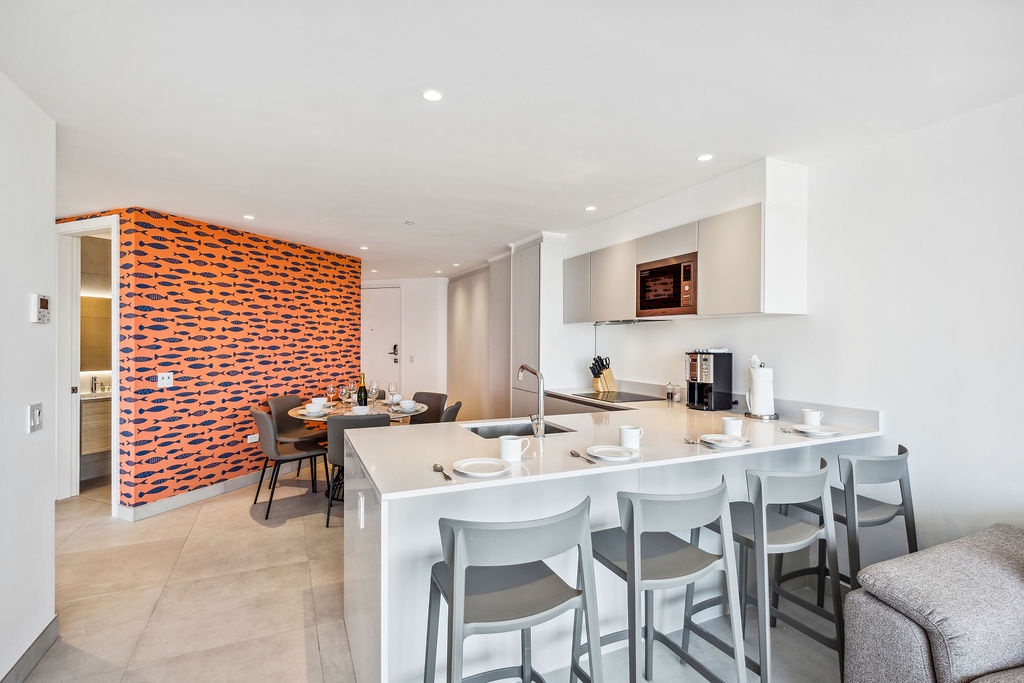 The sleek, fully equipped kitchen includes quartz countertops, custom cabinetry, and high-end stainless steel appliances. Whether you're making breakfast or preparing dinner, the space is designed for ease and style, with a dining bar for casual meals or a comfortable dining table for entertaining.