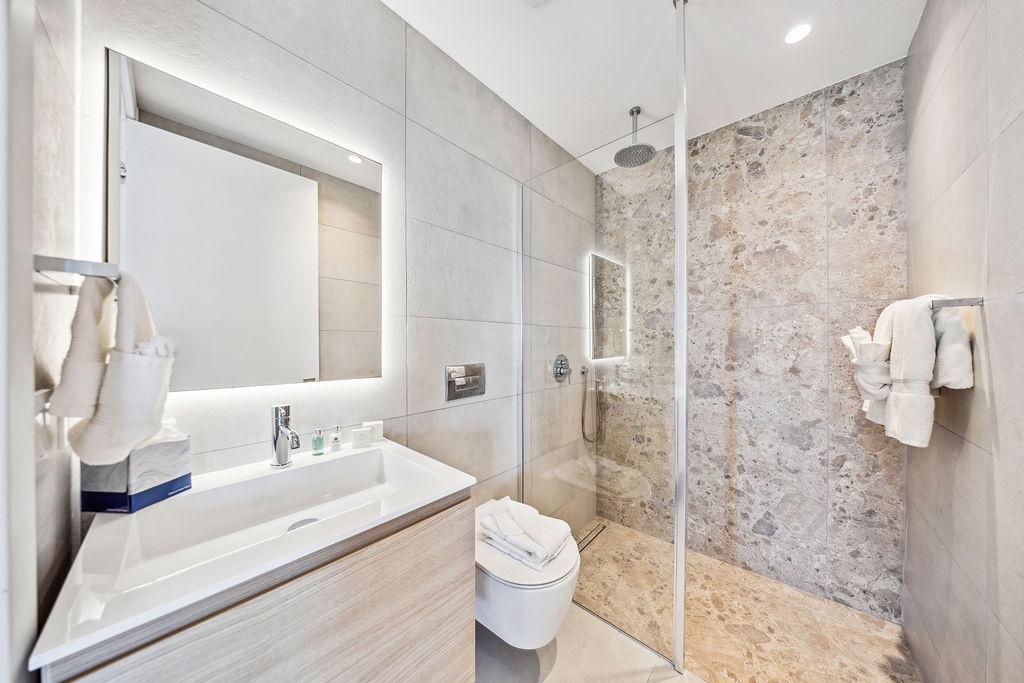The master bedroom offers a plush king-size bed, en-suite bathroom, and a refreshing rain shower. The second bedroom features a king-size bed as well and its own bathroom, providing comfort and privacy for all guests.