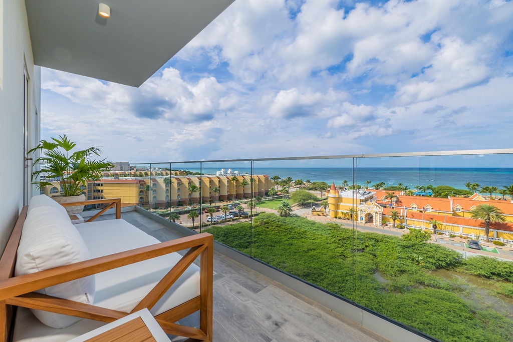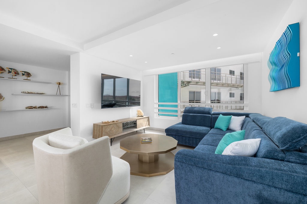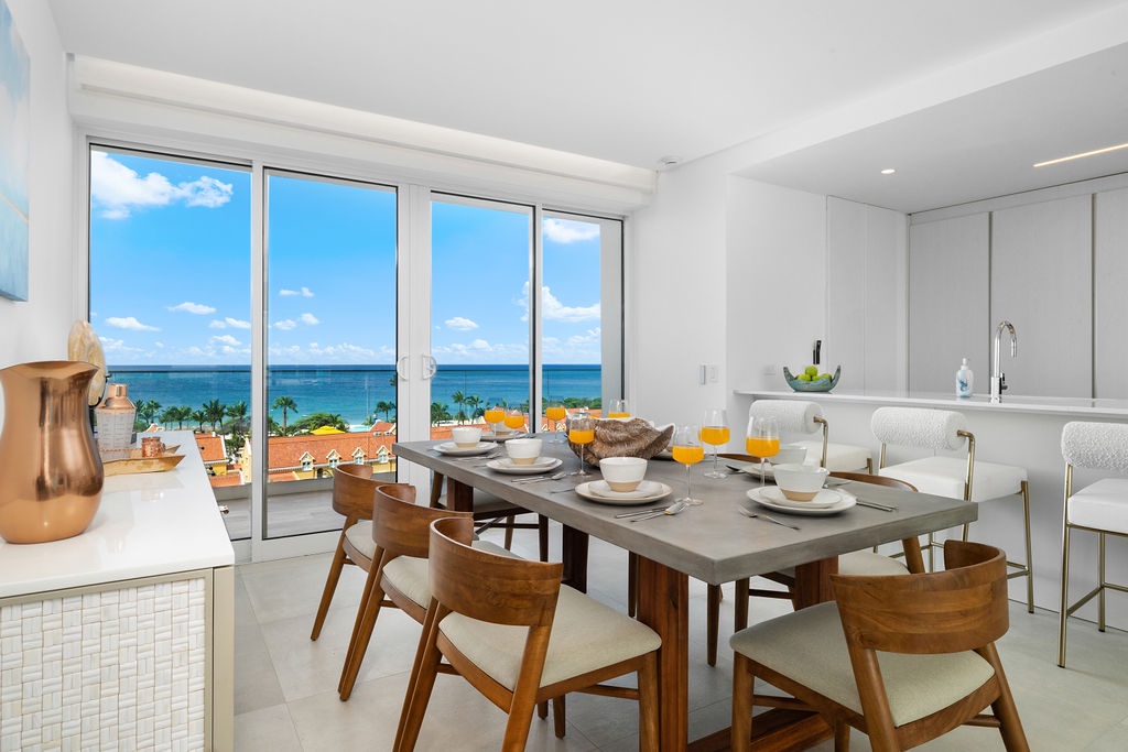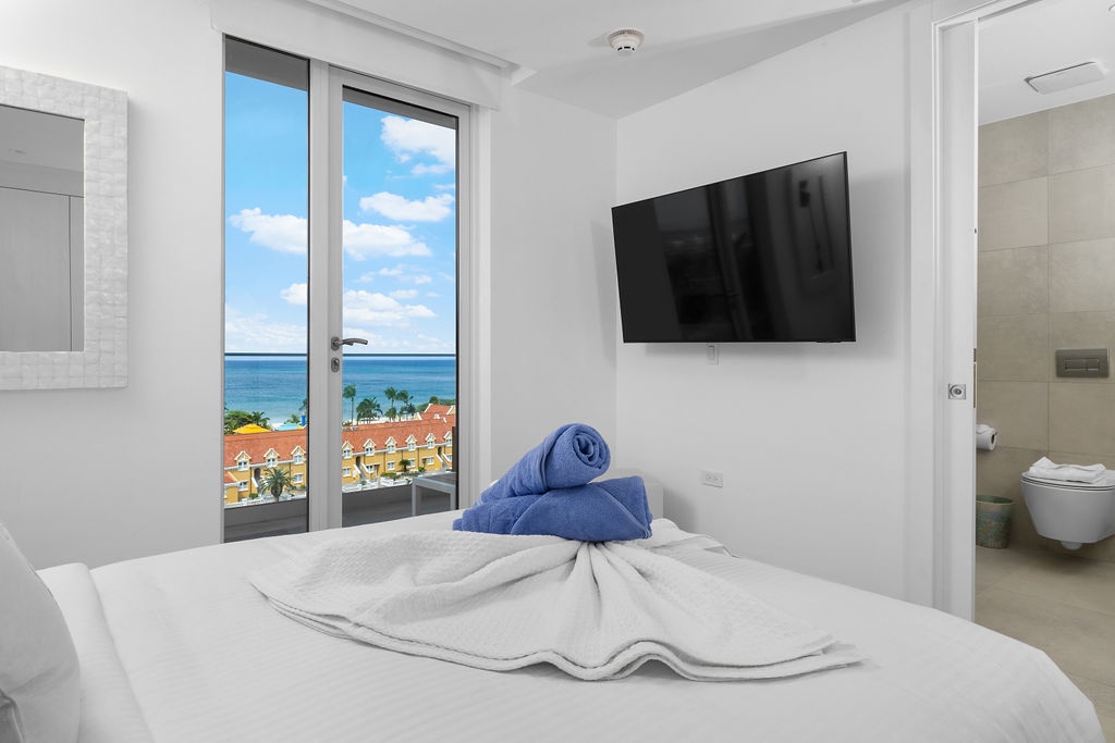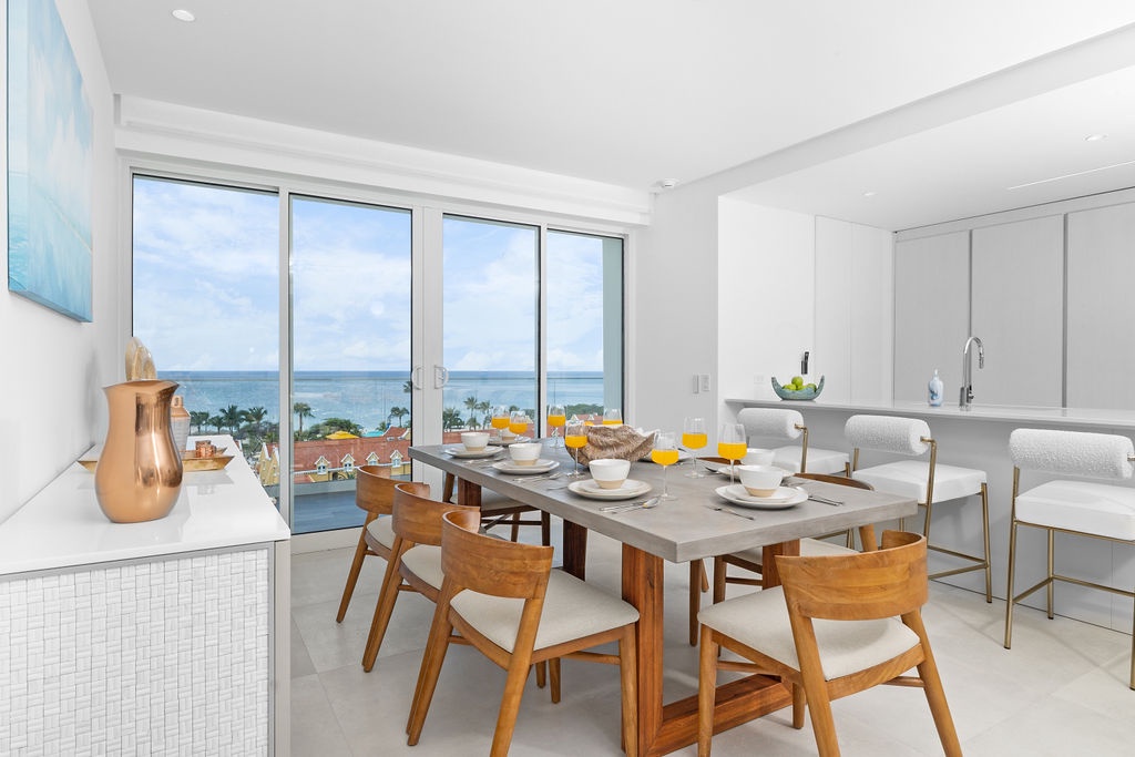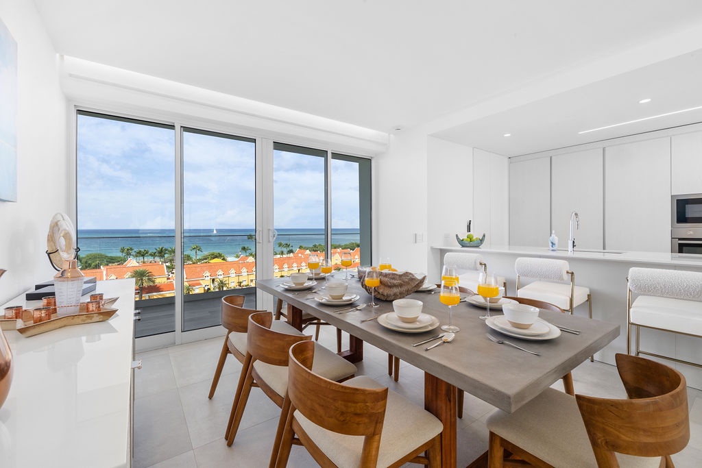 The living area is a sanctuary of relaxation, complete with a plush sofa bed and a Smart TV. A beautiful dining space is perfectly situated to take in breathtaking views of Eagle Beach, making every meal an unforgettable experience. Expansive windows frame the stunning scenery, creating an inviting atmosphere for relaxation and entertaining.