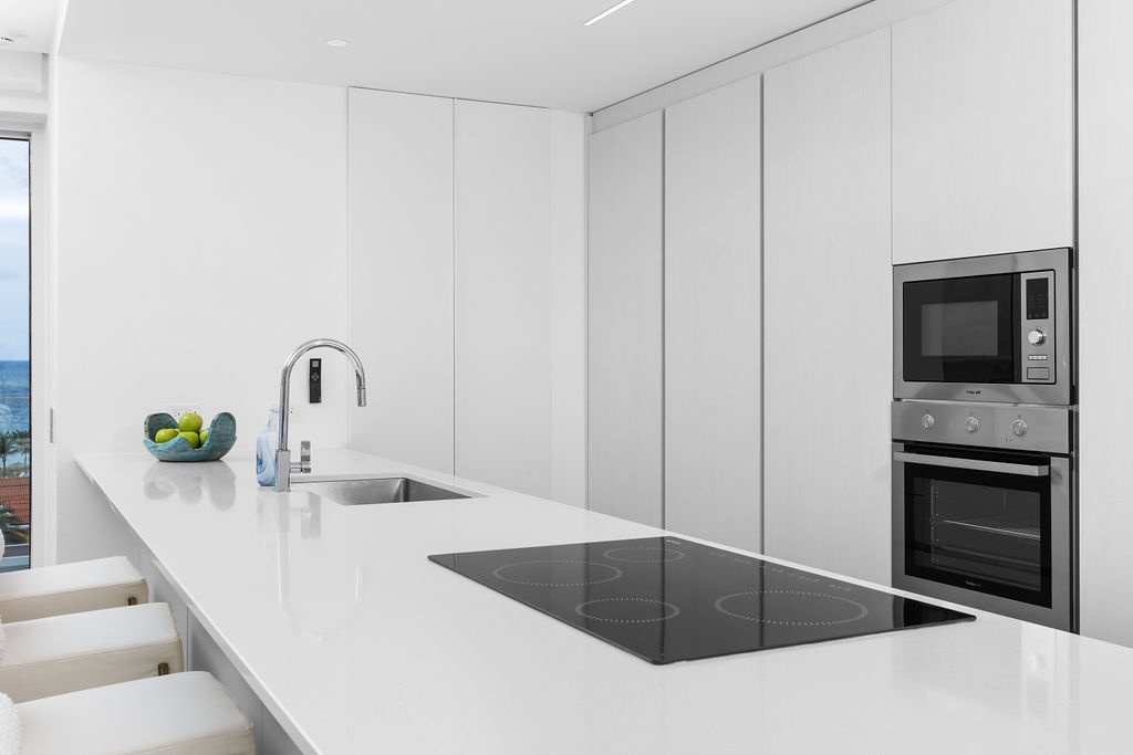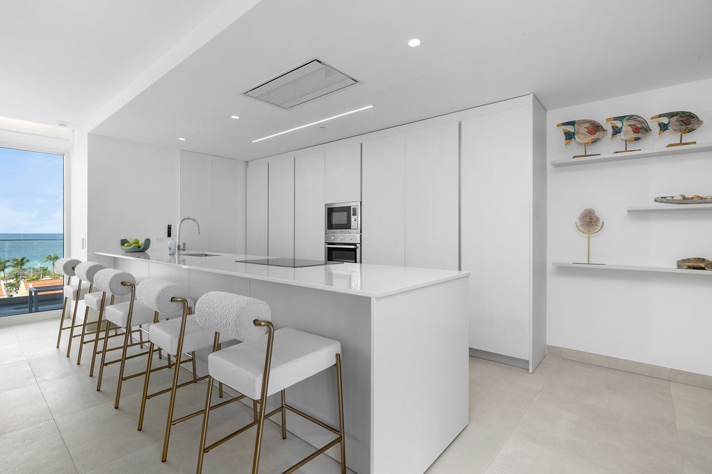 The fully equipped kitchen boasts sleek quartz countertops, custom cabinetry, and high-end stainless steel appliances. The open layout connects seamlessly to the living and dining areas, creating a perfect space for cooking, entertaining, or enjoying casual meals.
