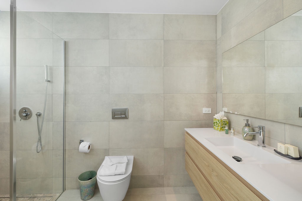 The luxurious master suite features a king-size bed, Smart TV, and a spa-like ensuite with a rain shower. The second and third bedrooms each feature queen-size beds, offering comfort and style for families or groups. Each bedroom has its own private bathroom with a rain shower, while a half-bath in the hallway adds extra convenience.