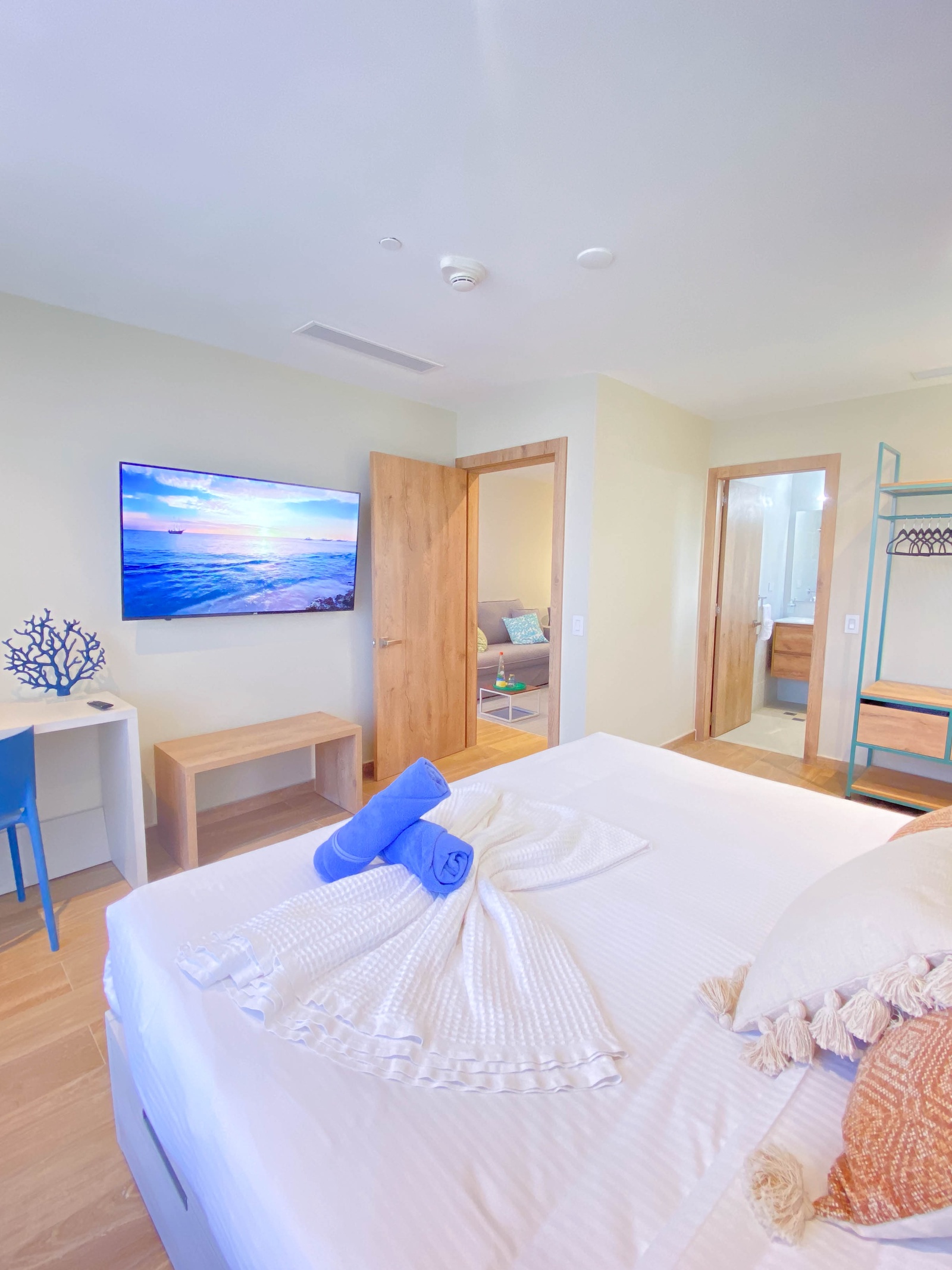 Amenities include a kids’ pool and a main pool at ground level, as well as a stunning rooftop pool with a sun deck where guests can relax and enjoy Aruba’s famous sunsets. The property also features an outdoor fitness area and private terraces with barbecue facilities (additional fees may apply).