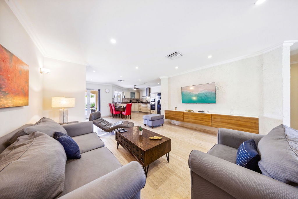 Inside, the villa offers an open-concept living area with comfortable seating, air conditioning, high-speed Wi-Fi, and Smart TV—perfect for relaxing with a movie or staying connected. The well-equipped kitchen features everything you need to prepare meals, including modern appliances, cookware, and plenty of space for group cooking.