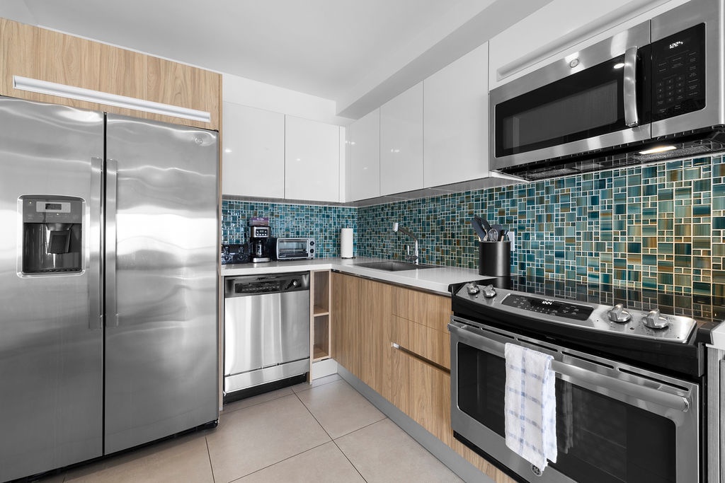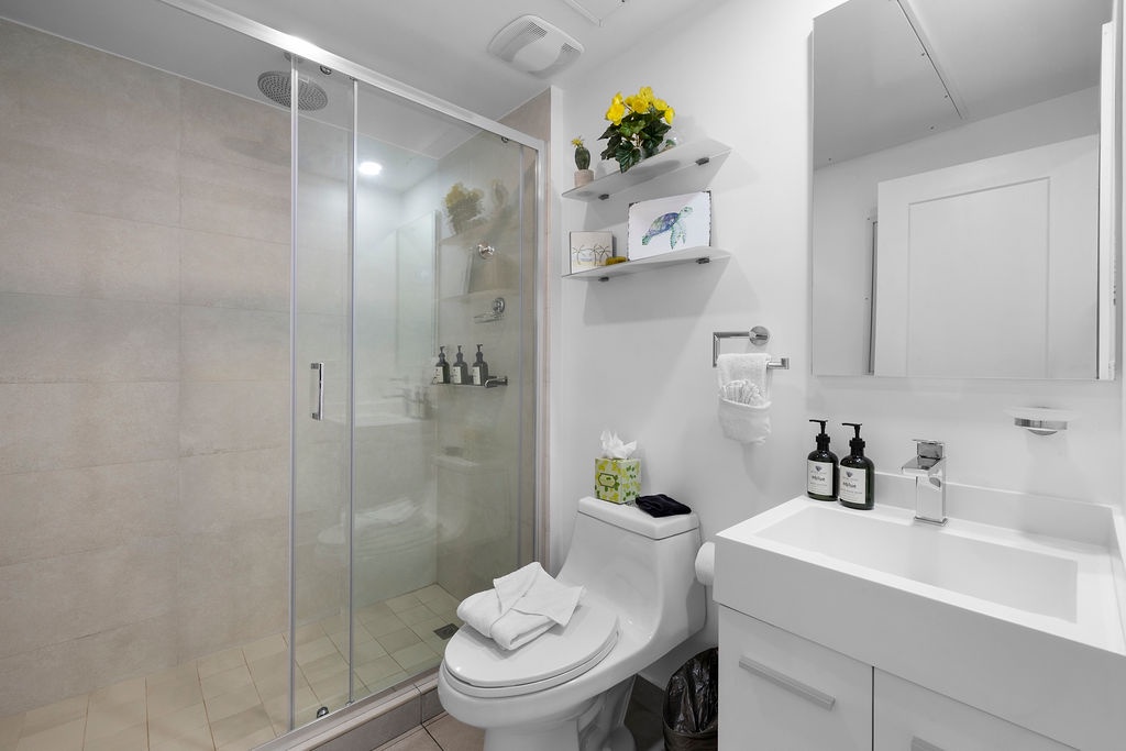 For added convenience, this apartment also features two pristine bathrooms, each stocked with fluffy towels and essential toiletries.