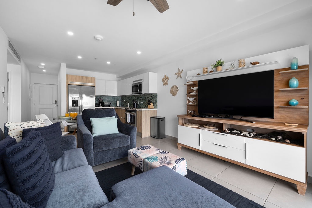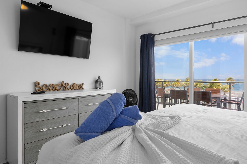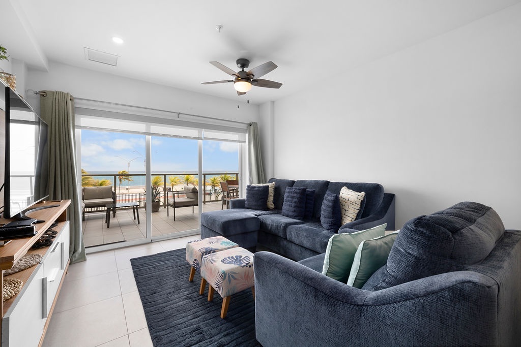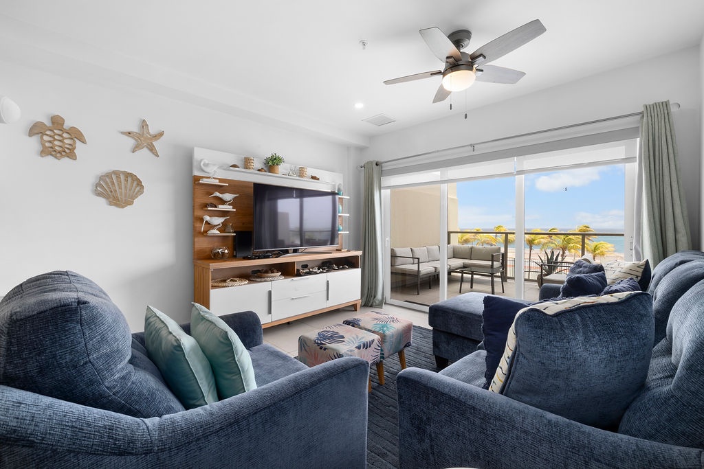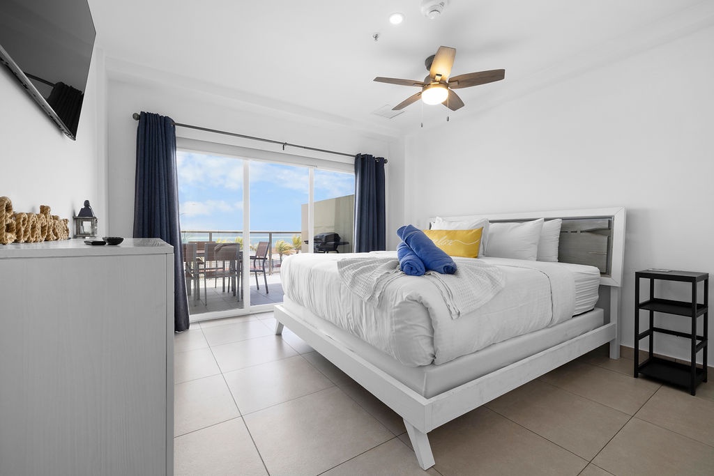 As you step inside, you'll immediately be greeted by the amazing view of the ocean and the refreshing sea breeze. The spacious living area is tastefully decorated with modern furnishings and vibrant touches that reflect the island's lively spirit.