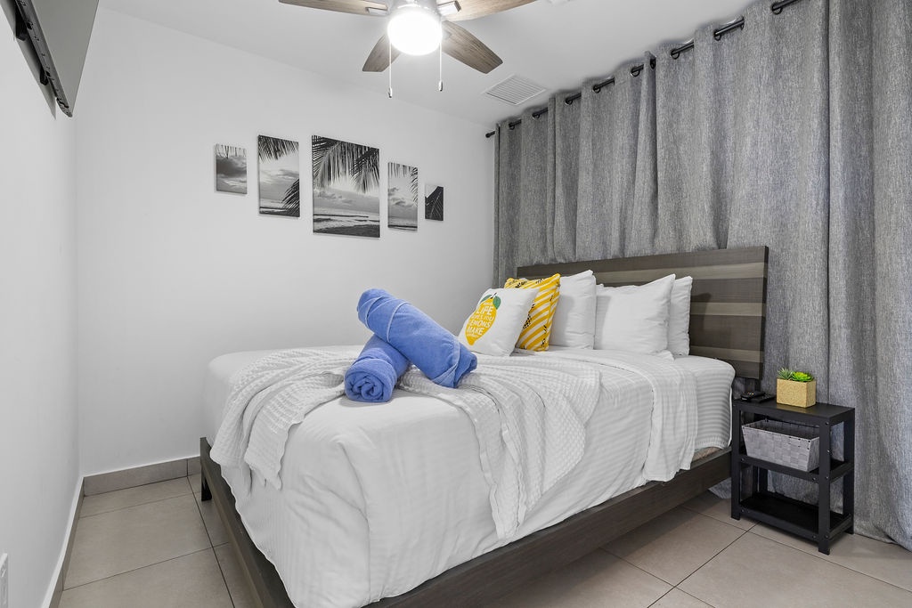 The master bedroom boasts a luxurious king-sized bed, ensuring a restful night's sleep after a day of exploring Aruba's treasures. The second bedroom features a comfortable queen-sized bed, perfect for accommodating friends or family members. Both bedrooms are equipped with air conditioning to keep you cool and comfortable throughout your stay.
