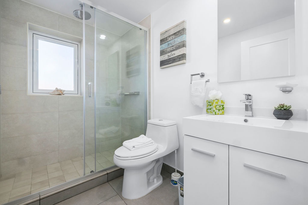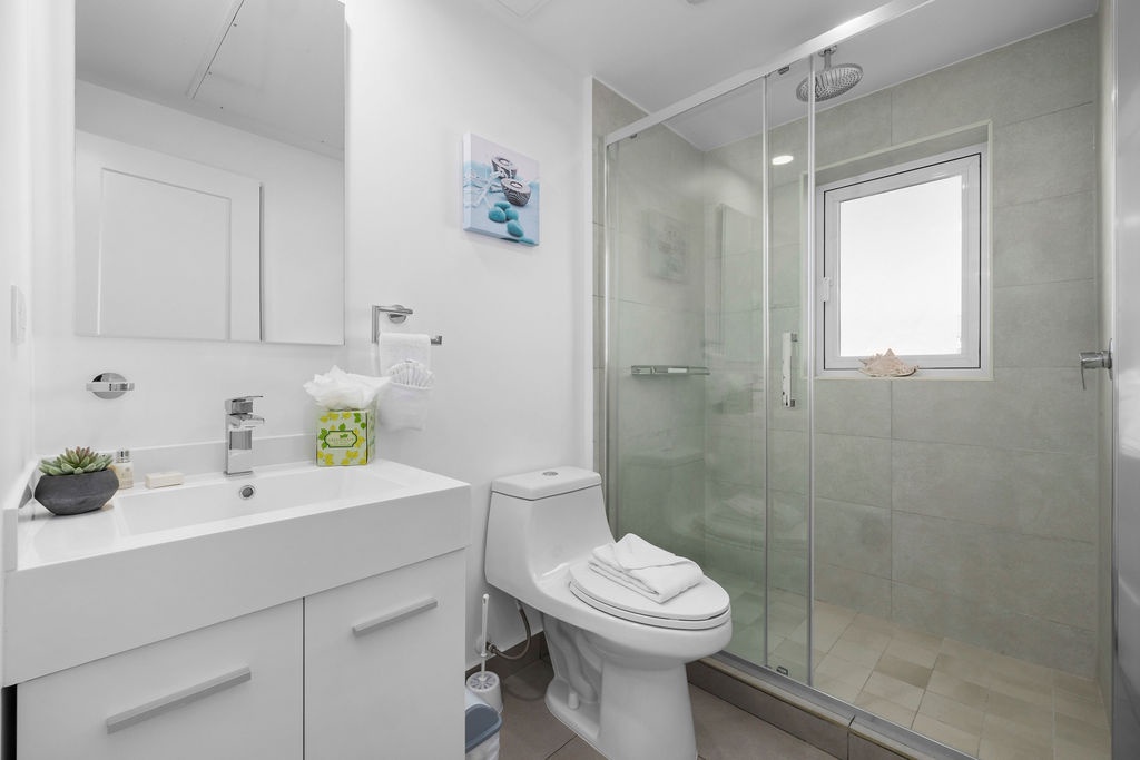 • Bathroom has their own white towels and blue beach towels in the vanity.