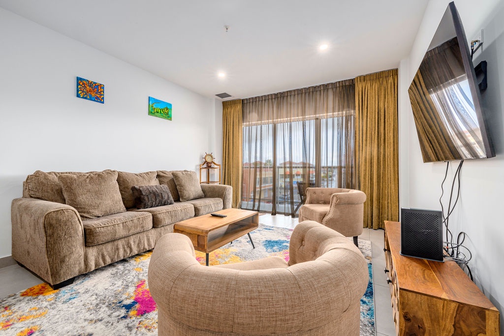 The living room offers a comfortable seating area with a sofa-bed and flat-screen cable TV, while large windows fill the space with natural light and showcase beautiful views. The apartment also features a private balcony, perfect for enjoying the ocean breeze.