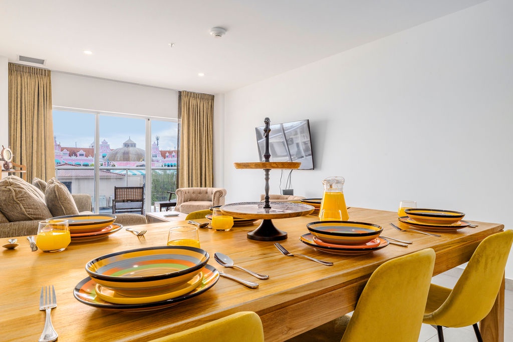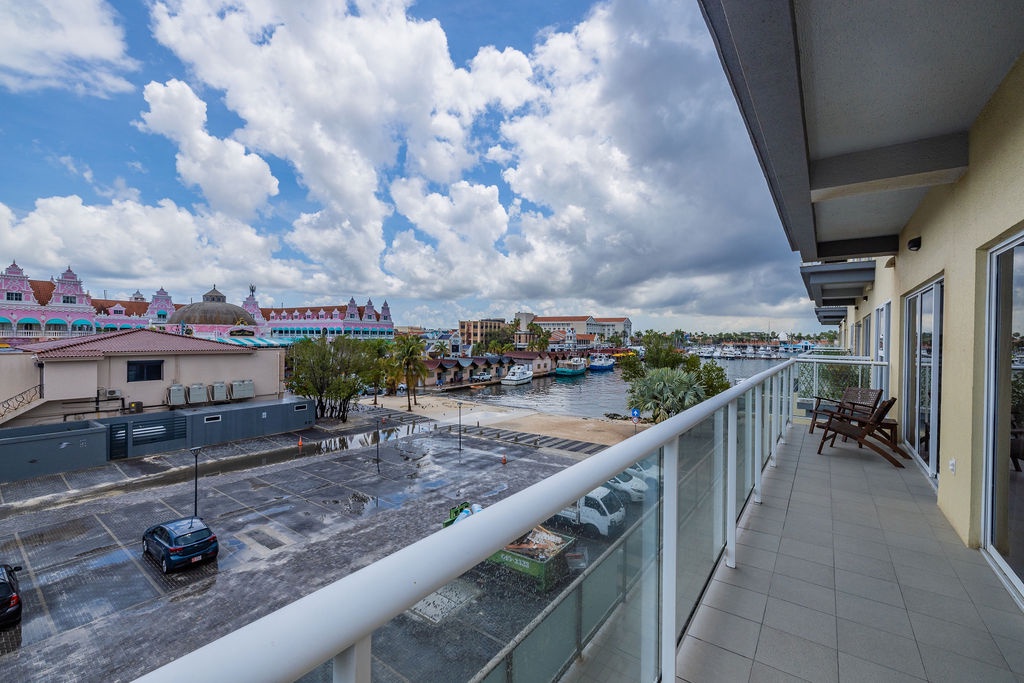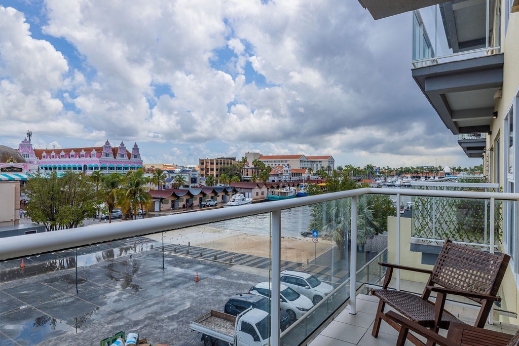 Enjoy the stunning infinity pool and tropical pool deck overlooking the Oranjestad Marina.