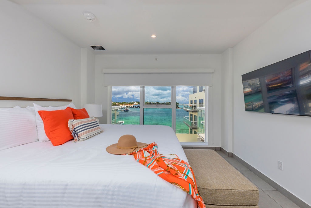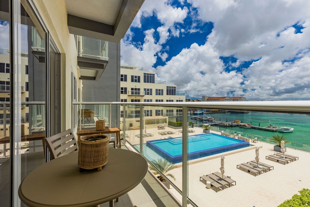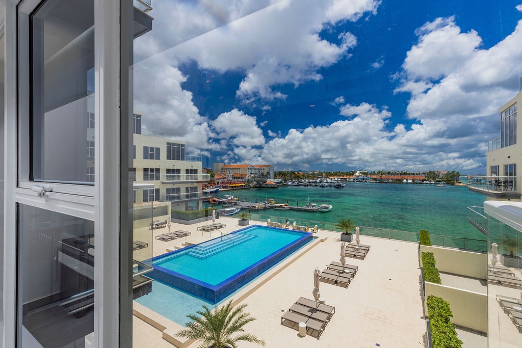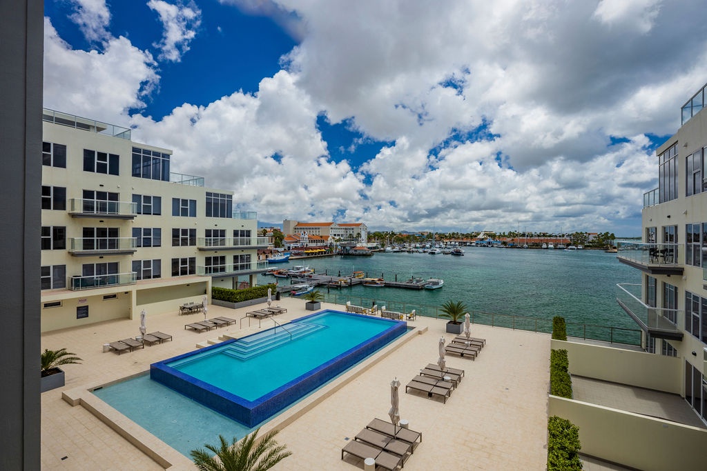 • A stunning infinity pool overlooking the Oranjestad Marina wit tropical deck create a relaxing environment at the center of the complex with poolside lounges and umbrellas from 8:00 am to 9:00 pm.