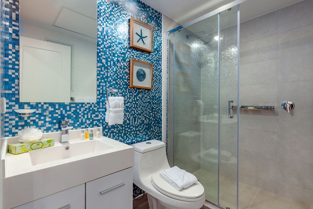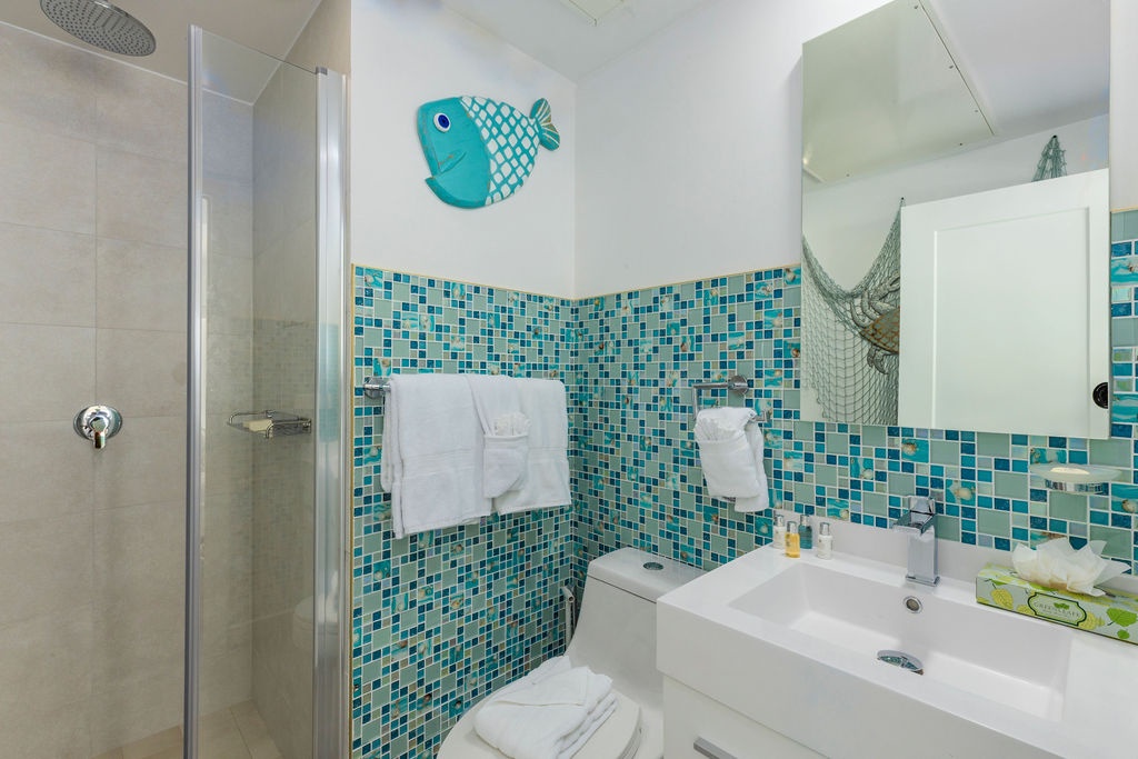 • Bathroom has their own white towels and blue beach towels in the vanity.